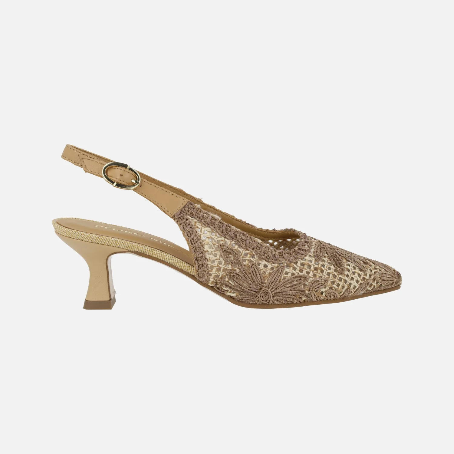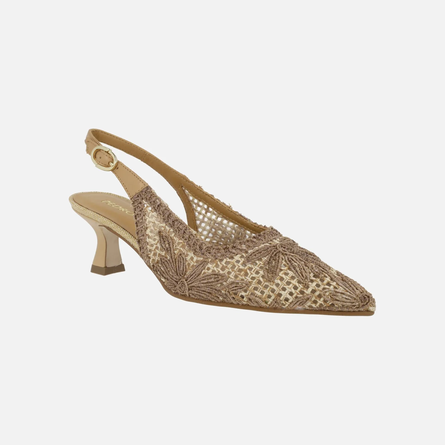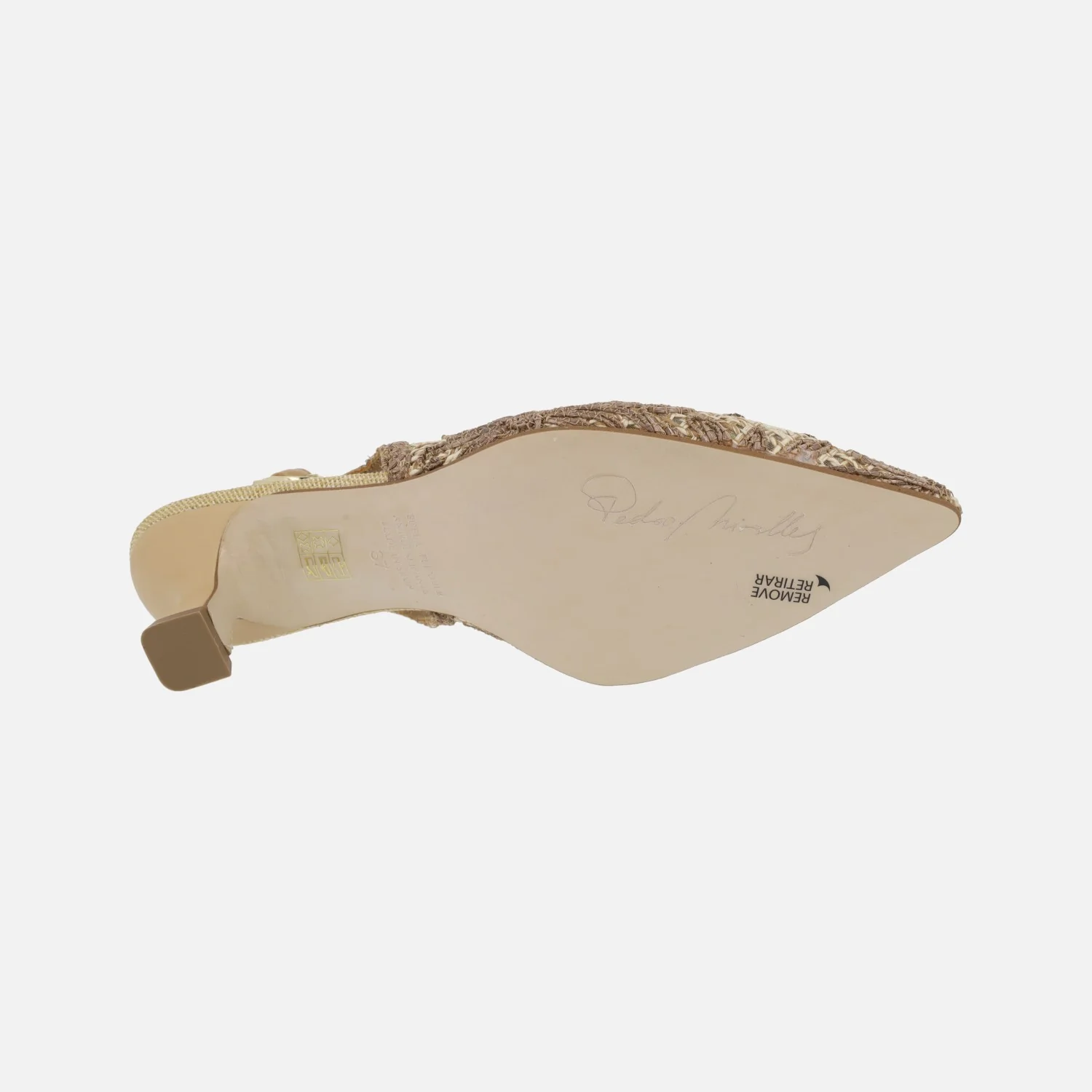 Zapatos corte salón destalonados de la marca Pedro Miralles modelo 17810 Airo negro o Airo marron. Salones elaborados en piel y materiales efecto trenzado, con detalles florales, en combinado negro y beige o marrón y beige. Tira al talón con cierre de hebilla. Planta de piel. Tacones de 7 cms de altura. Suela sintética. Made in Spain.