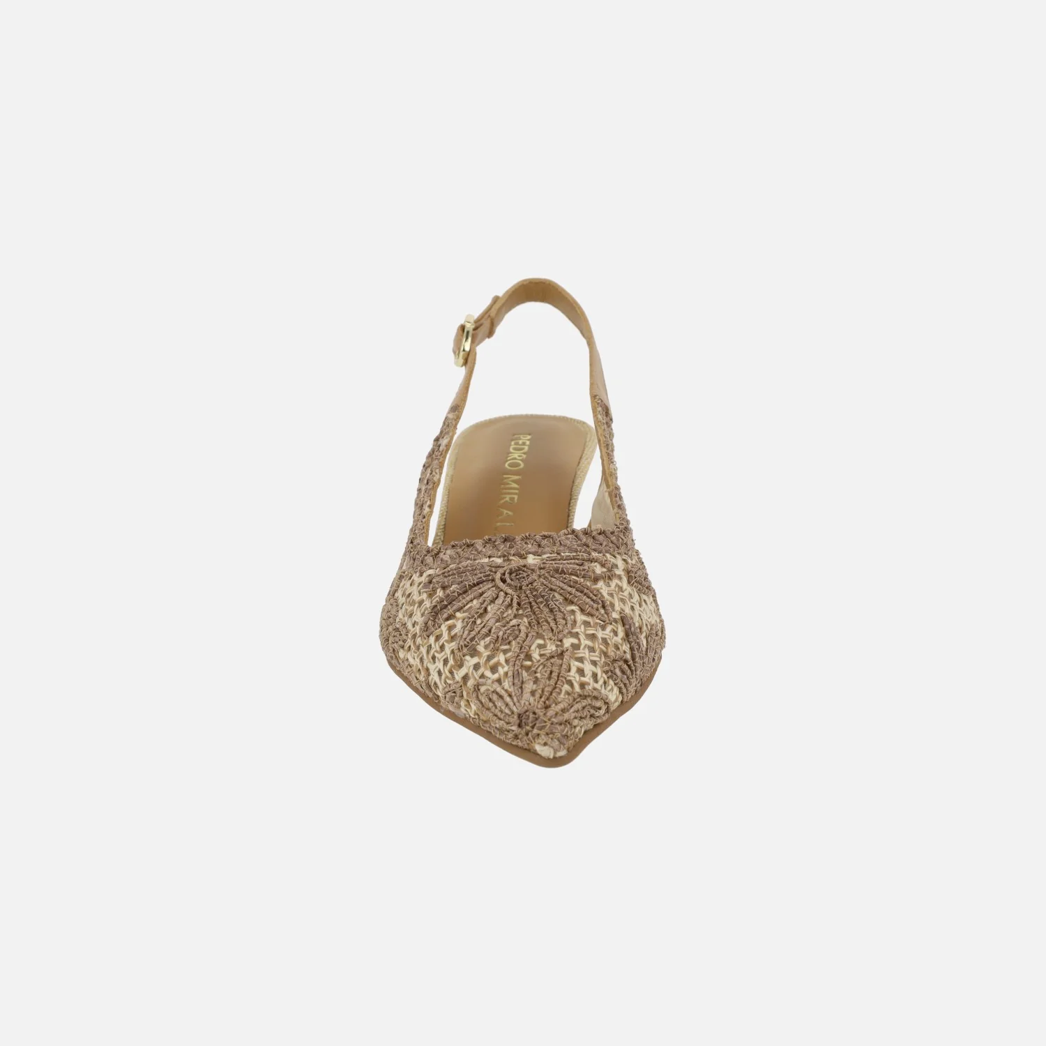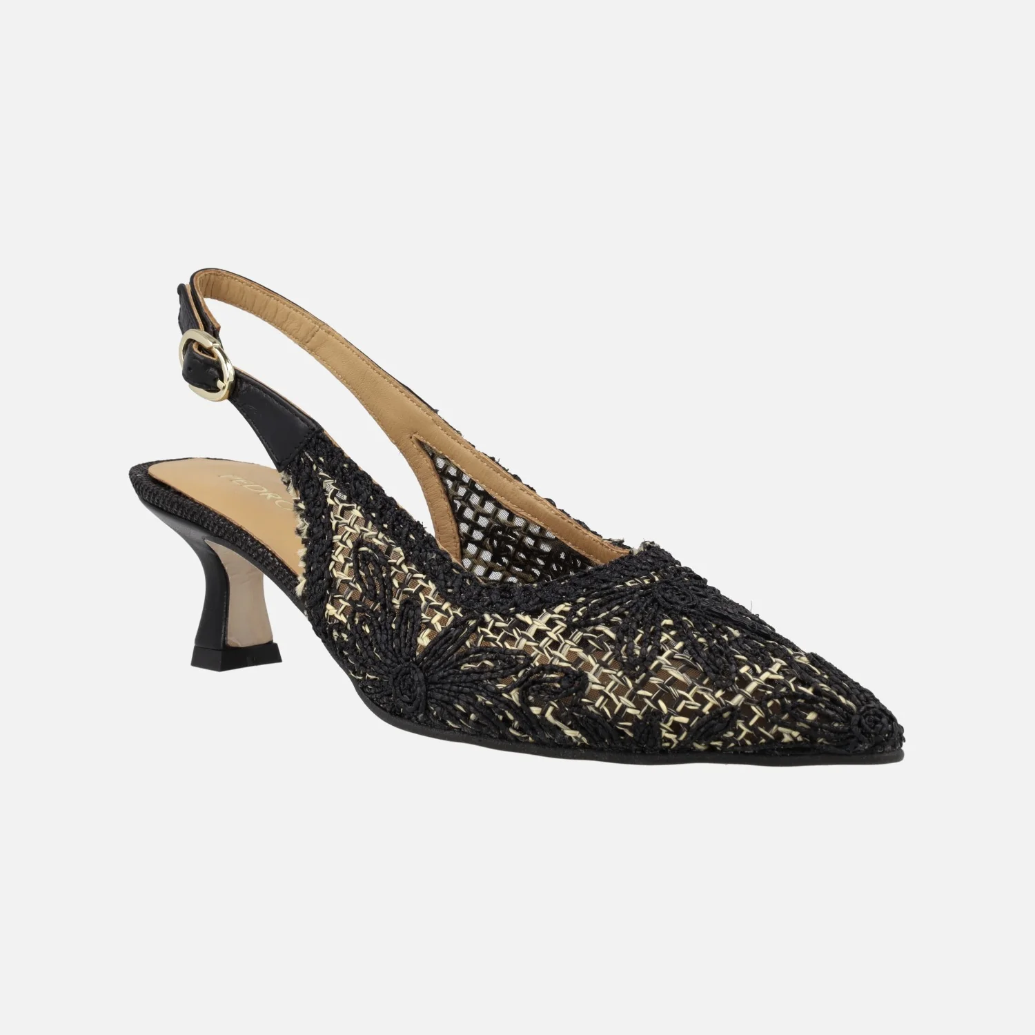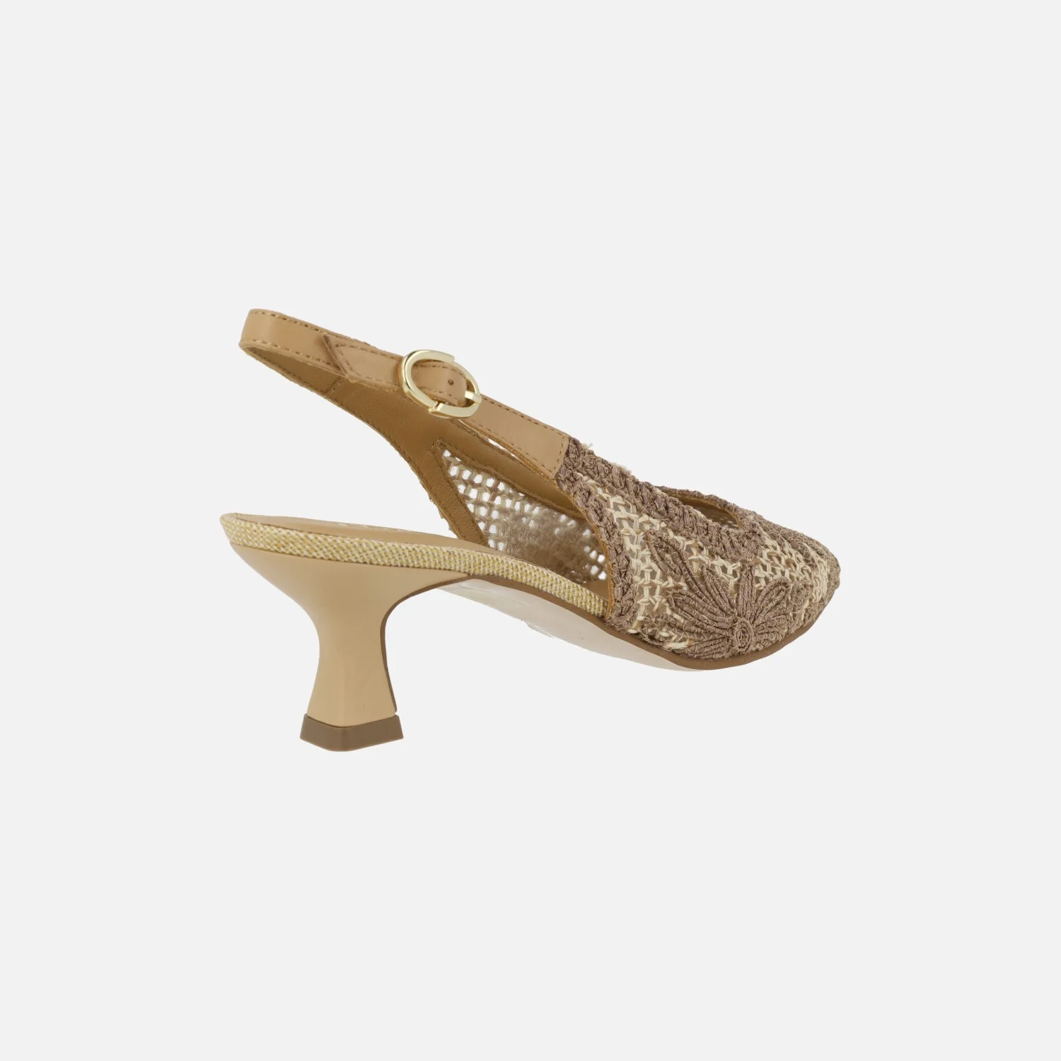 Zapatos corte salón destalonados de la marca Pedro Miralles modelo 17810 Airo negro o Airo marron. Salones elaborados en piel y materiales efecto trenzado, con detalles florales, en combinado negro y beige o marrón y beige. Tira al talón con cierre de hebilla. Planta de piel. Tacones de 7 cms de altura. Suela sintética. Made in Spain.