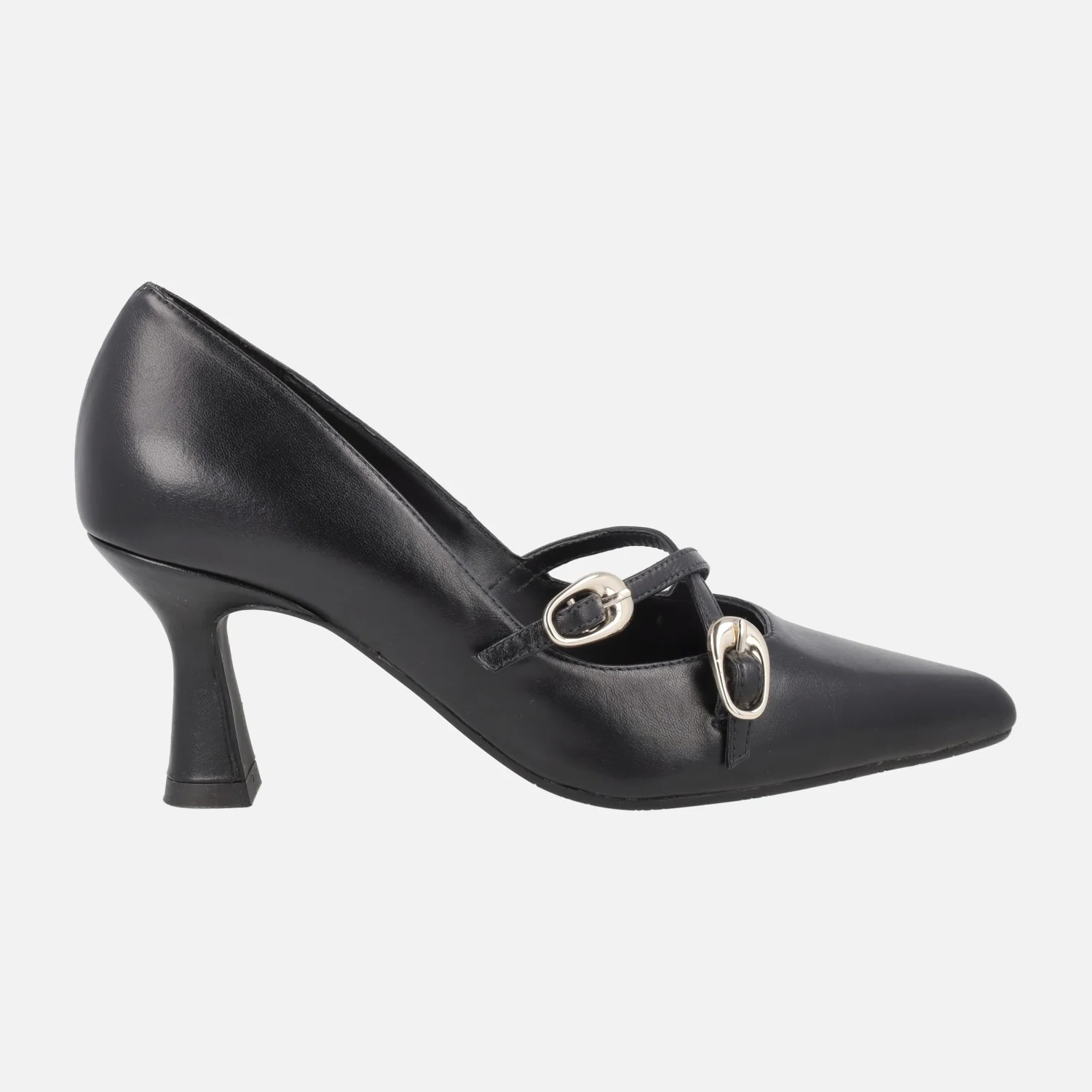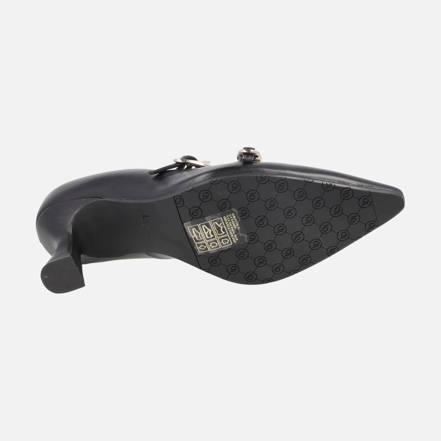 Zapatos corte salón para mujer de la marca Lodi, modelo Gumer soft negro. Salones de horma afilada elaborados en piel negra con dos pulseras con cierre de hebilla que cruzan el empeine. Interiores forrados de piel. Piso sintético con tacones de 7,5 cm. Hebillas doradas. Made in SPain.