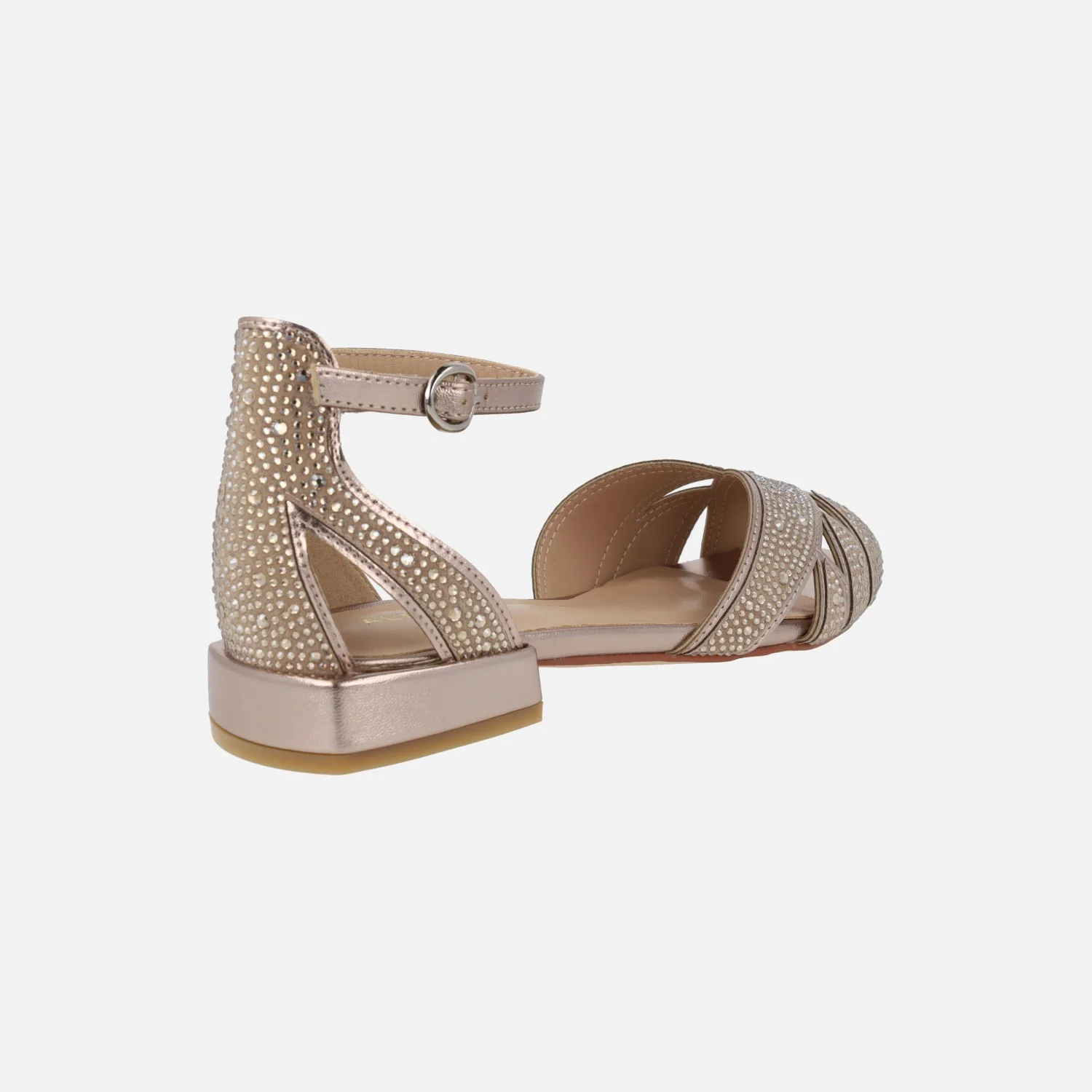 Nuevas bailarinas con puntera abierta de la marca Alma en Pena modelo V2550407 Luna Bronze. Un híbrido entre sandalias y bailarinas, con su puntera abierta y pulsera al tobillo con cierre de hebilla ajustable. Exterior e interior sintético. Color metalizado bronce con detalles de strass. Tacones bajitos, de apenas 2,3 cms de altura.