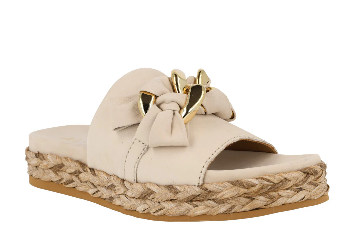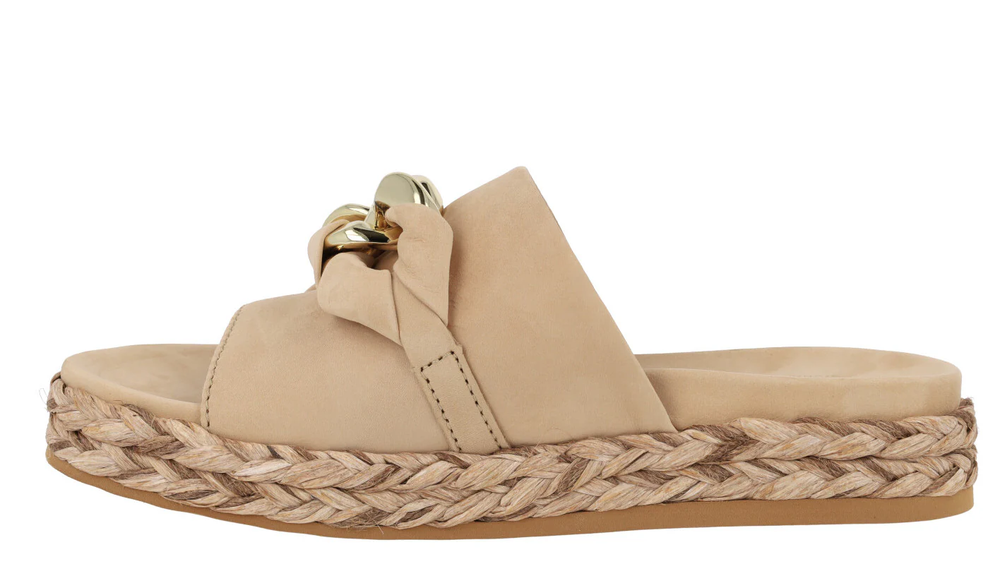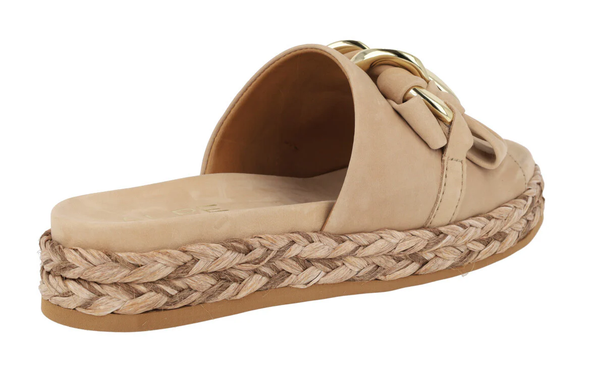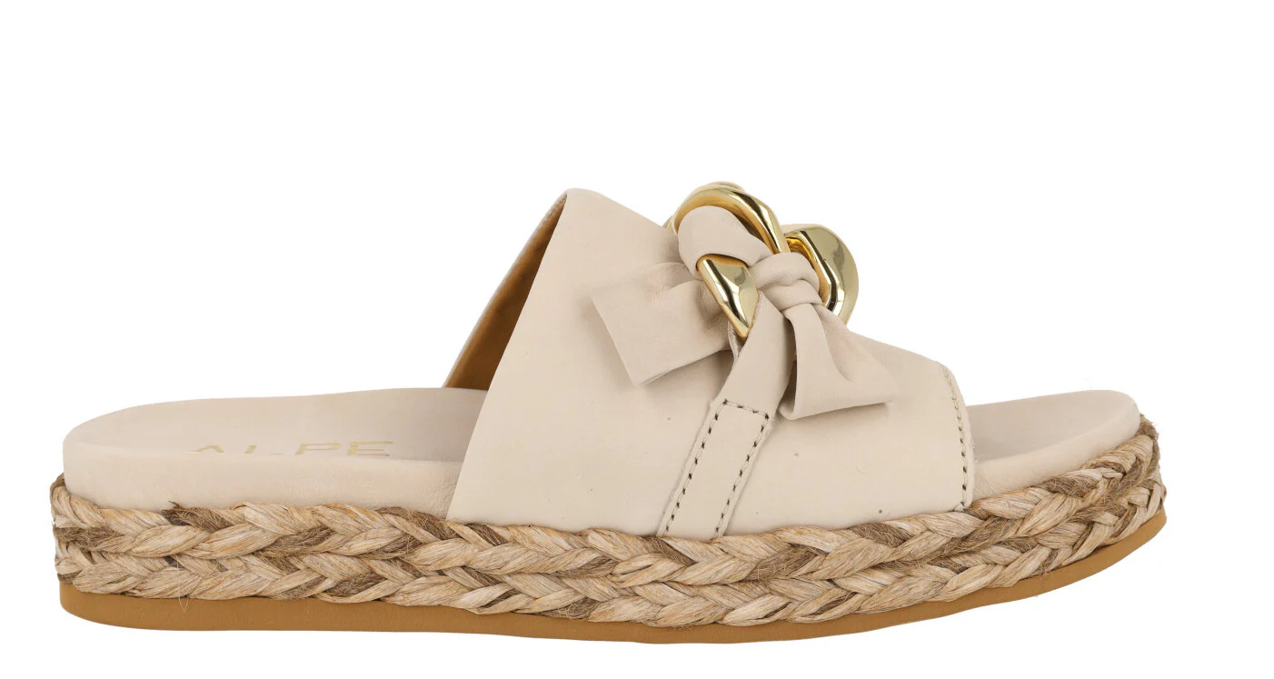 Enamorada de las nuevas sandalias Ancona 2449 de la marca Alpe. Sandalias de piel nobuck disponibles en beige (naturale) o camel (camello). Sandalias con pala ancha delantera de nobuck y un adorno de cadena con nobuck entrelazado. Forro y planta de piel. Plataforma de rafia trenzada. Altura trasera 4 cms (2,5 cms parte delantera).