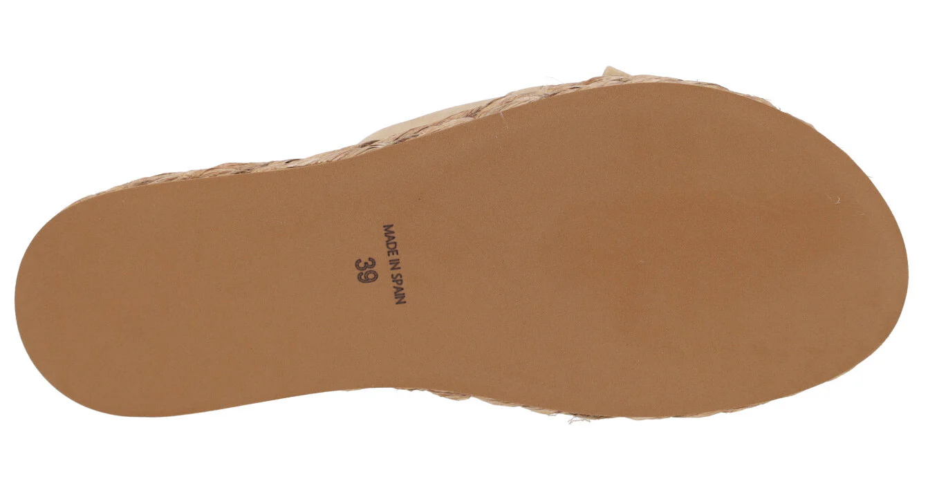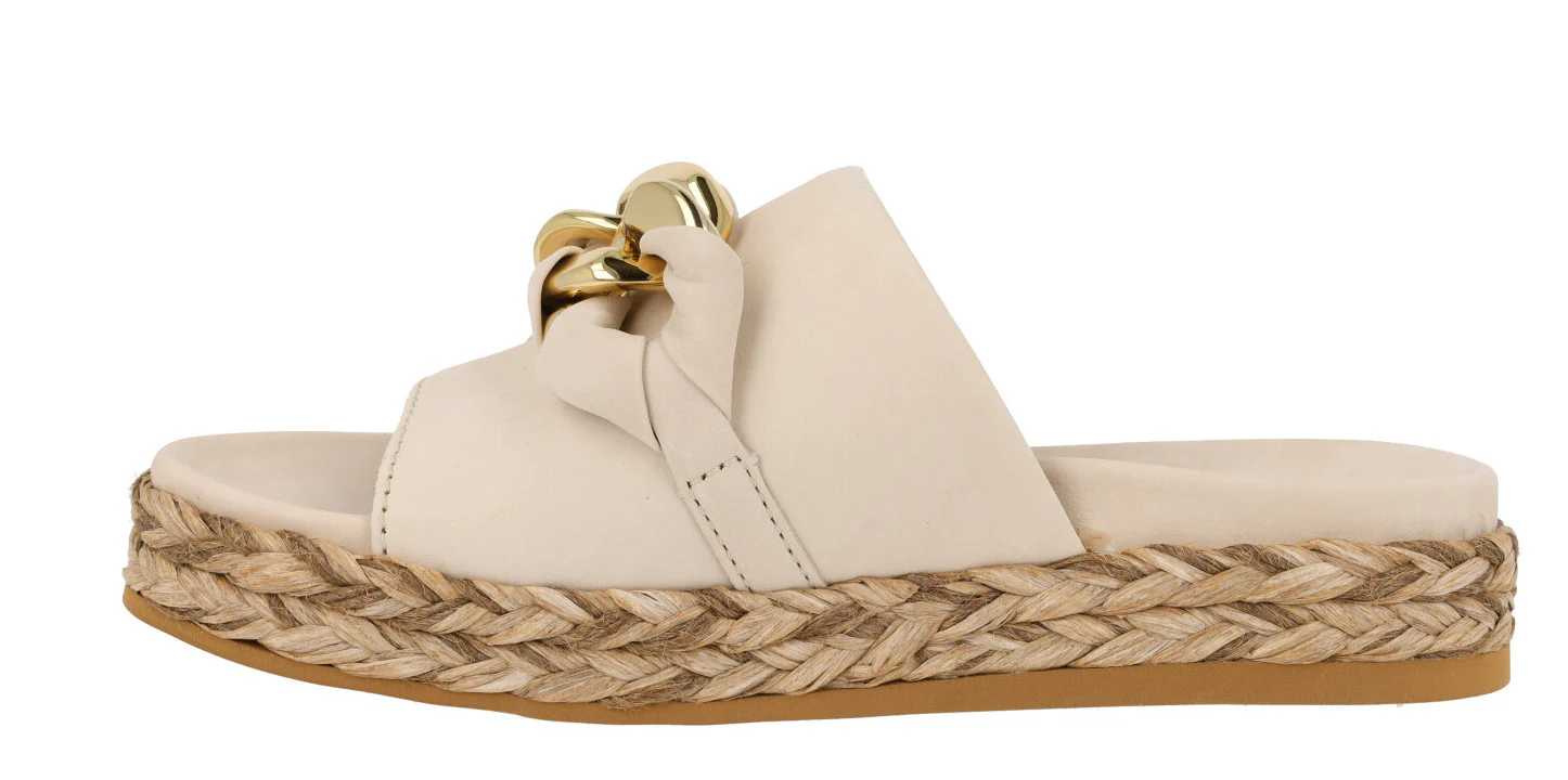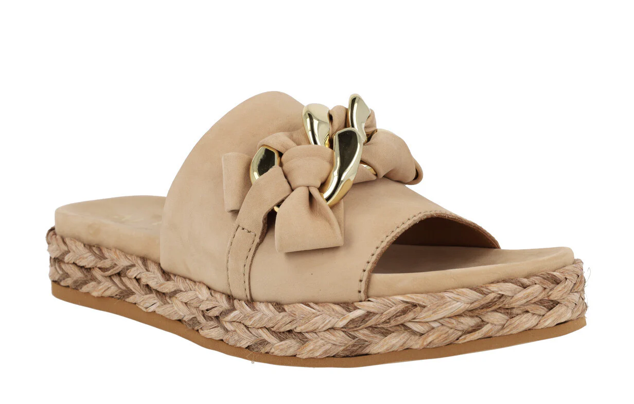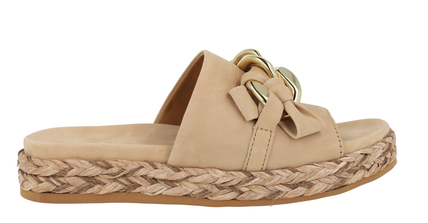 Enamorada de las nuevas sandalias Ancona 2449 de la marca Alpe. Sandalias de piel nobuck disponibles en beige (naturale) o camel (camello). Sandalias con pala ancha delantera de nobuck y un adorno de cadena con nobuck entrelazado. Forro y planta de piel. Plataforma de rafia trenzada. Altura trasera 4 cms (2,5 cms parte delantera).