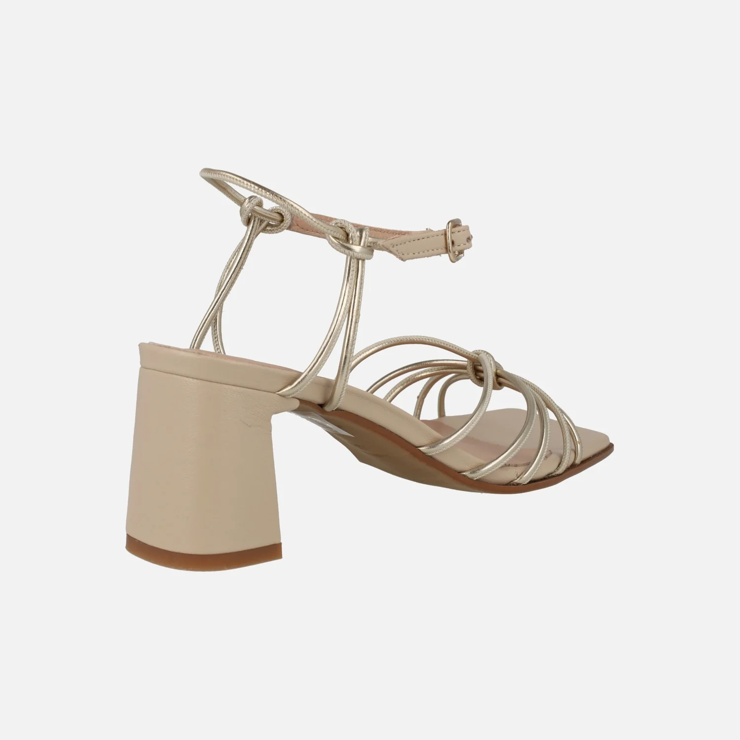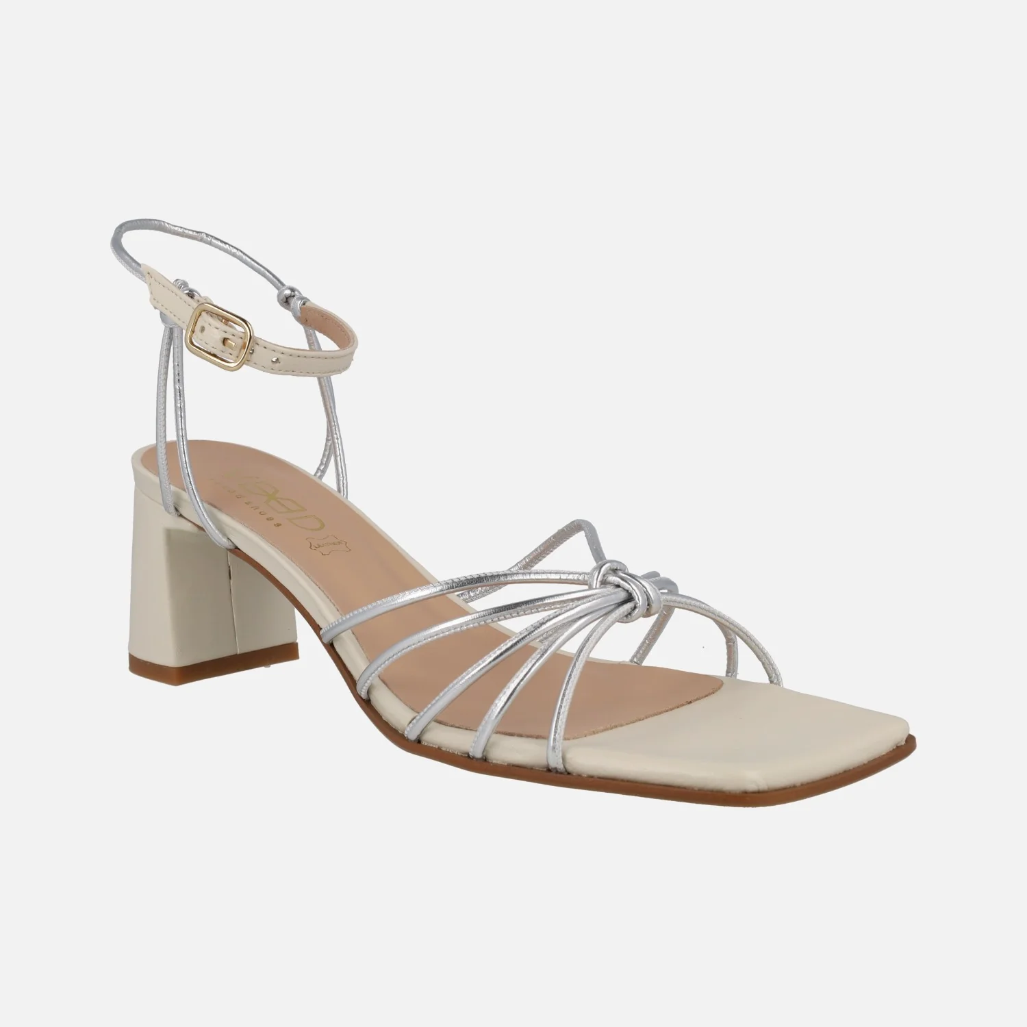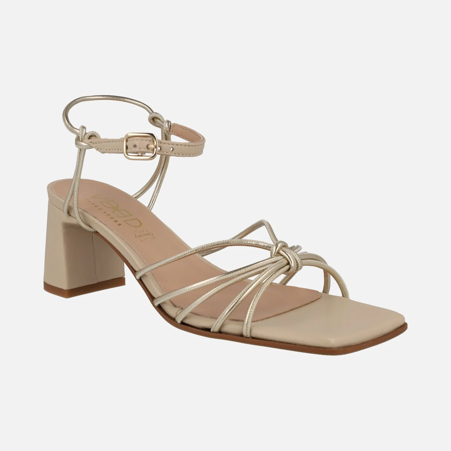 Sandalias del modelo Aretha de la marca Vexed. Fabricadas en piel y con tiras metalizadas. Lleva una pulsera a la altura de tobillo que se ajusta al pie con una hebilla. El forro y las plantillas son de piel. El tacón es de 7 cms aproximadamente y va forrado en piel, con un piso de una goma ligera que lo hace mas flexible. Esta sandalia es cómoda y apta para cualquier tipo de ceremonia.