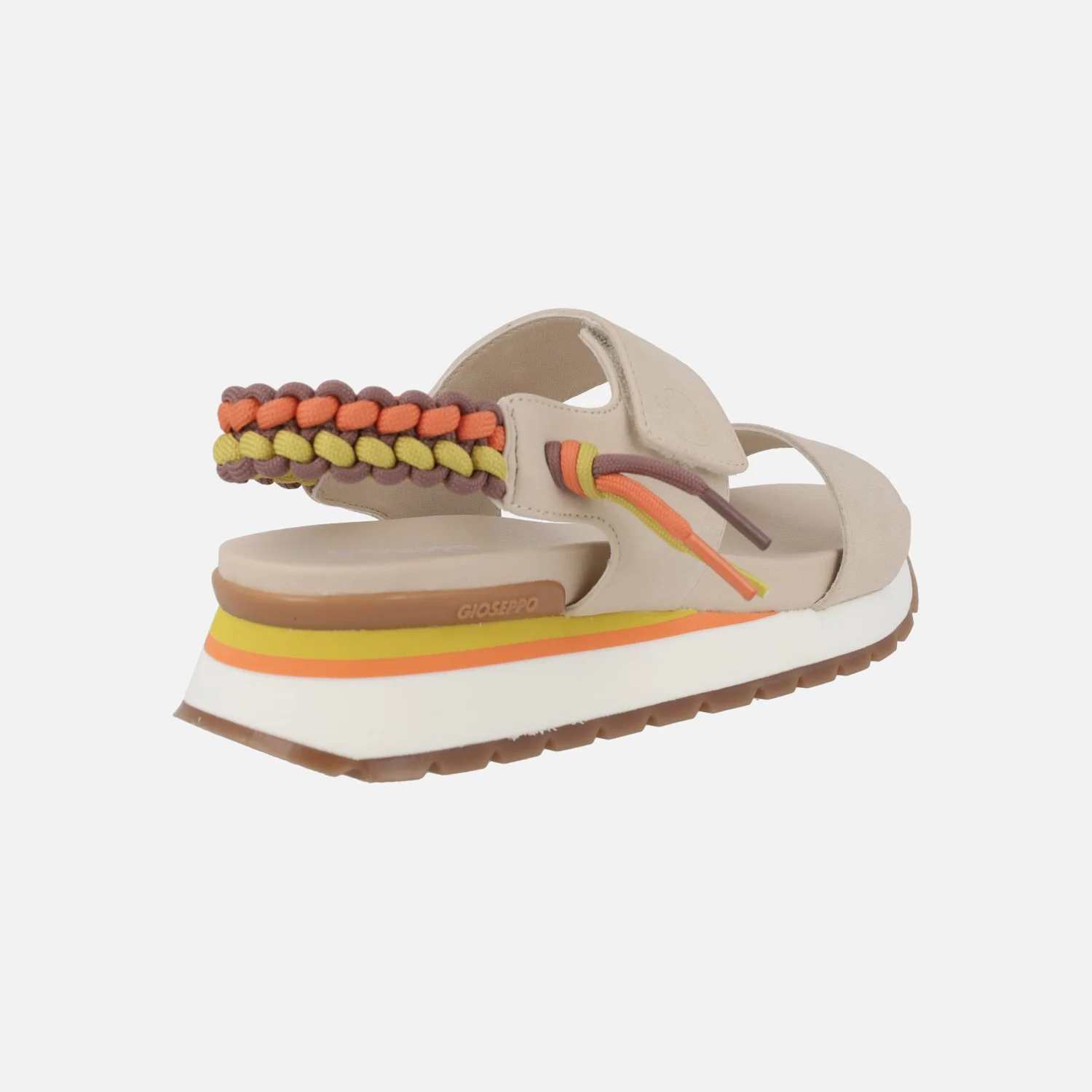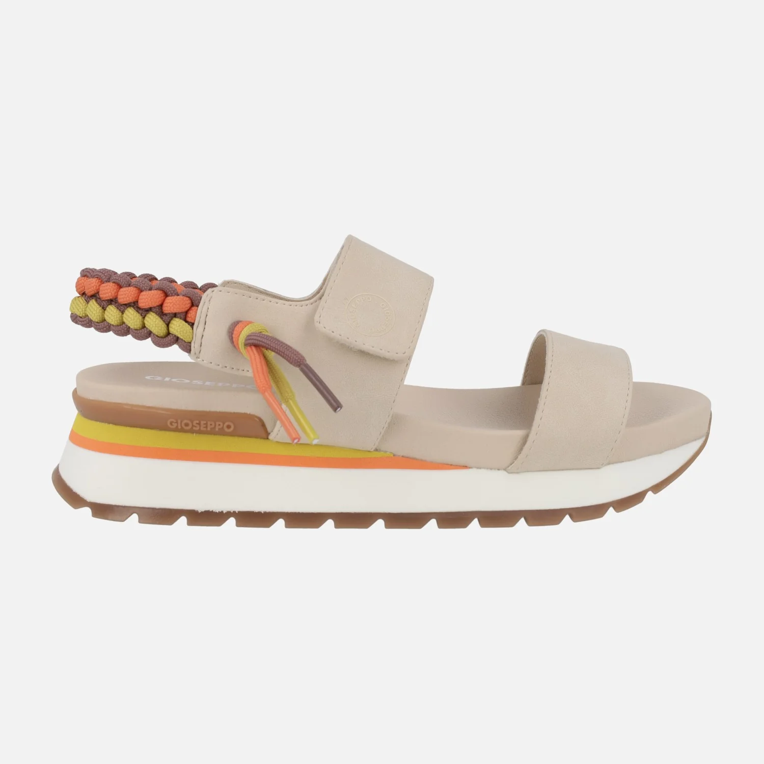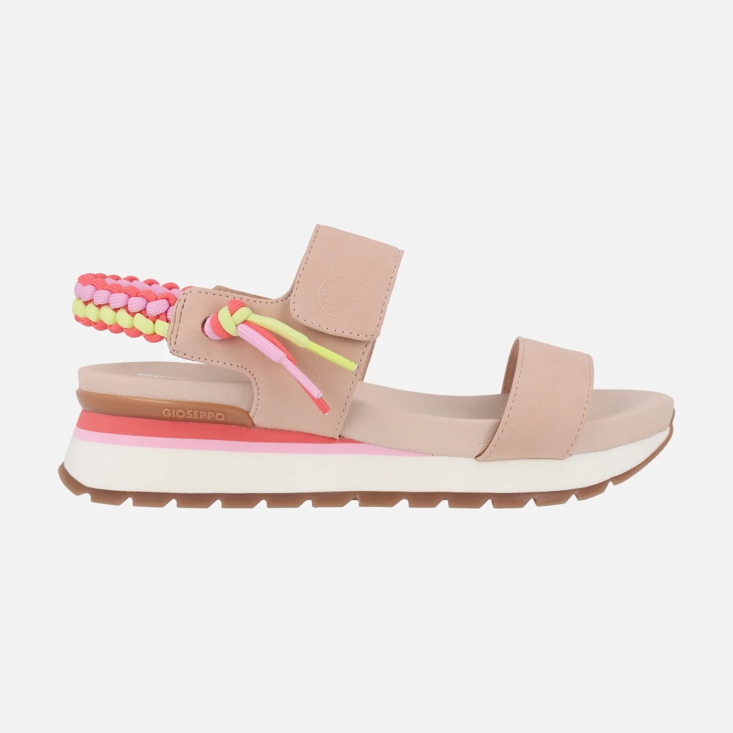 Sandalias deportivas para mujer de la marca Gioseppo modelo Austell 71082. Sandalias con cierre de velcro, muy cómodas y confortables, disponibles en combinado beige o rosa. Llevan un detalle trenzado multicolor al talón. Piso de EVA con 5 cms de altura trasera (3 cm parte delantera).