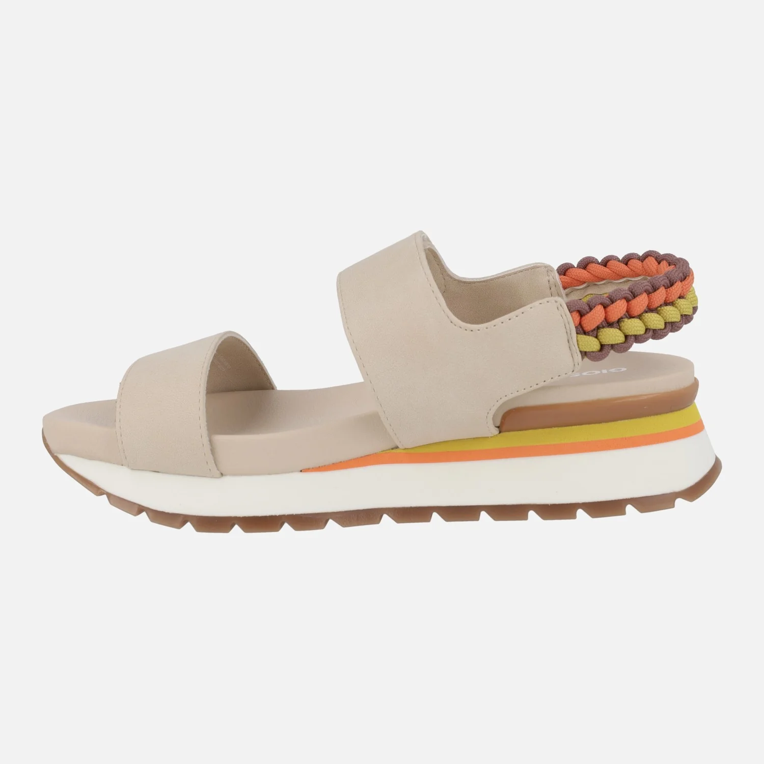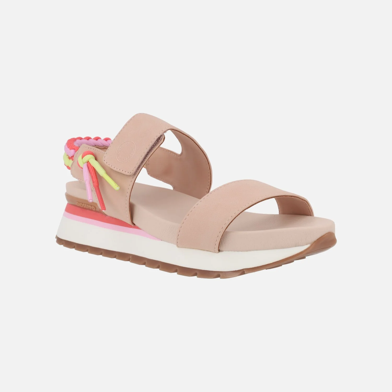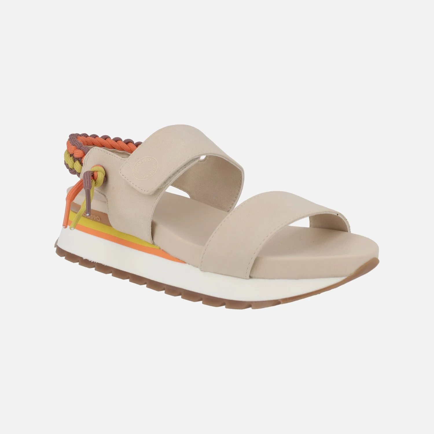 Sandalias deportivas para mujer de la marca Gioseppo modelo Austell 71082. Sandalias con cierre de velcro, muy cómodas y confortables, disponibles en combinado beige o rosa. Llevan un detalle trenzado multicolor al talón. Piso de EVA con 5 cms de altura trasera (3 cm parte delantera).