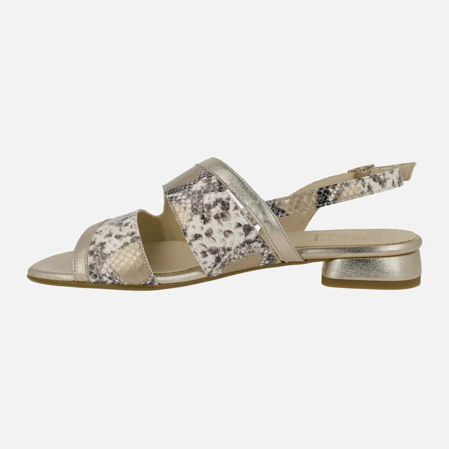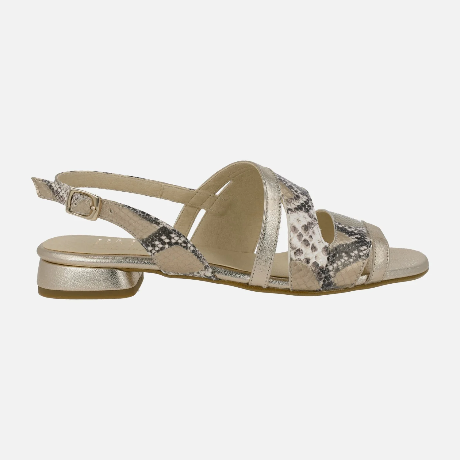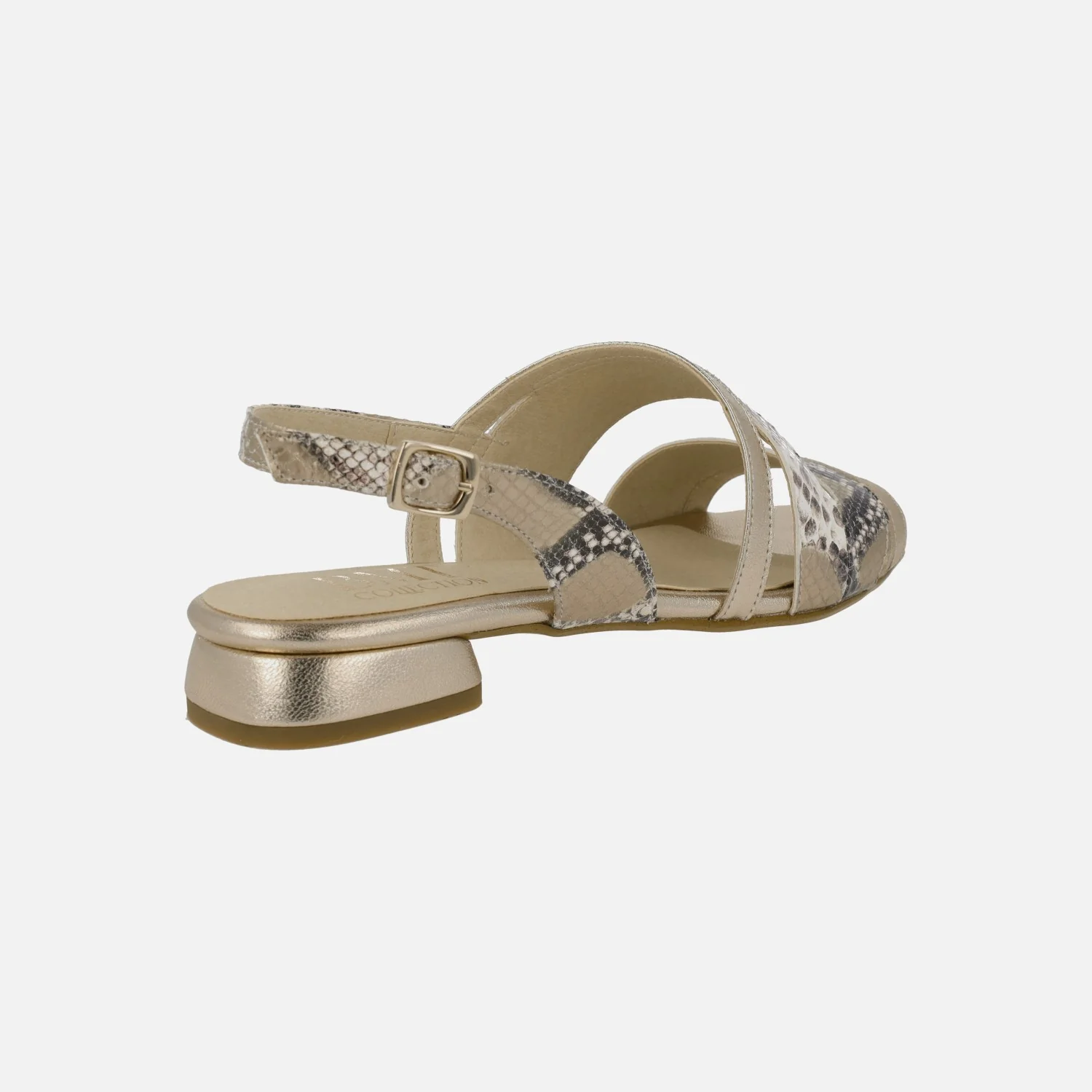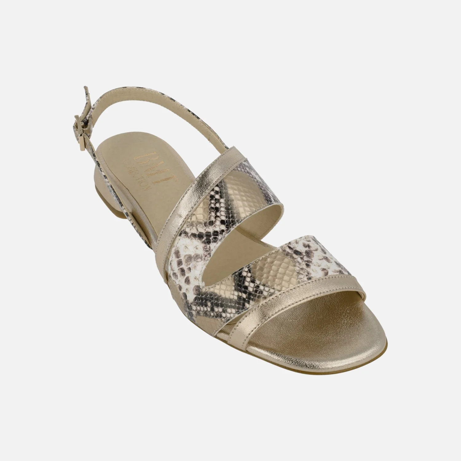 Sandalias de piel para mujer de la marca Barminton, modelo 14502 Champan. Sandalias de piel elaboradas en animal print serpiente y en metalizado oro. Tira al talón con cierre de hebilla. Interiores en combinado de piel y tejido. Tacones bajitos, de apenas 2,5 cms de altura. Made in Spain.