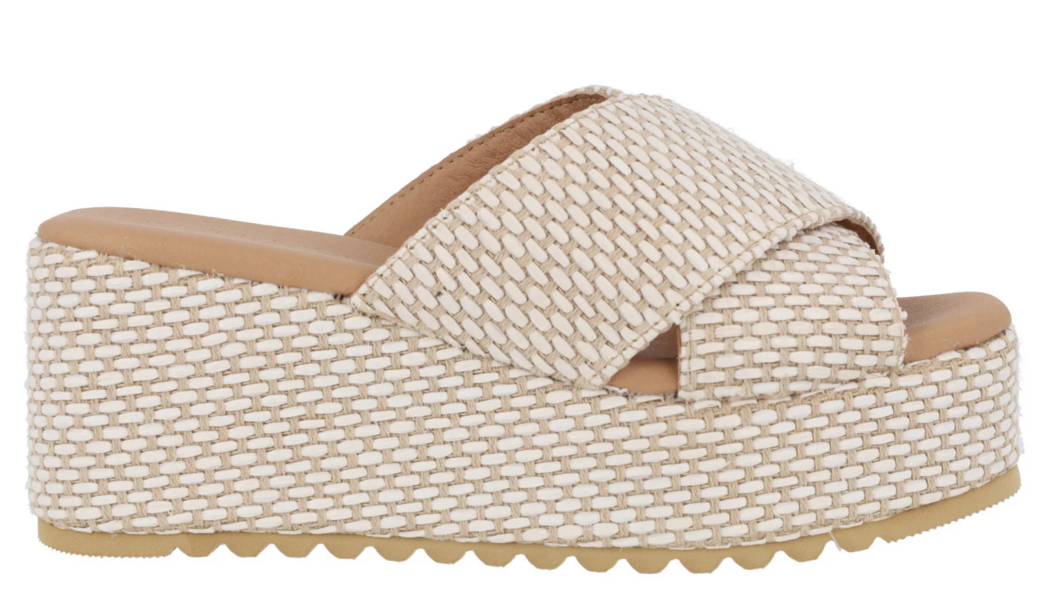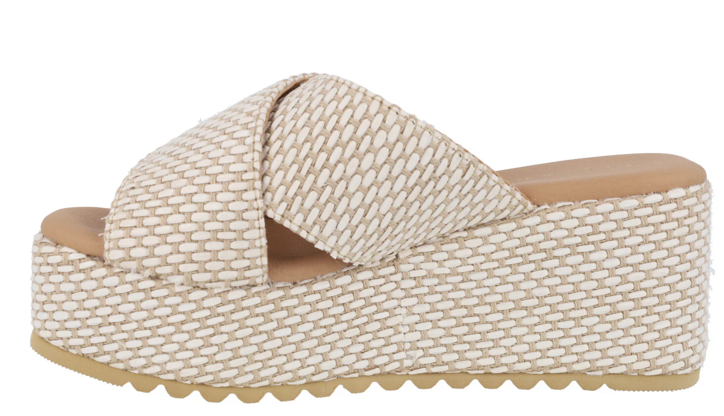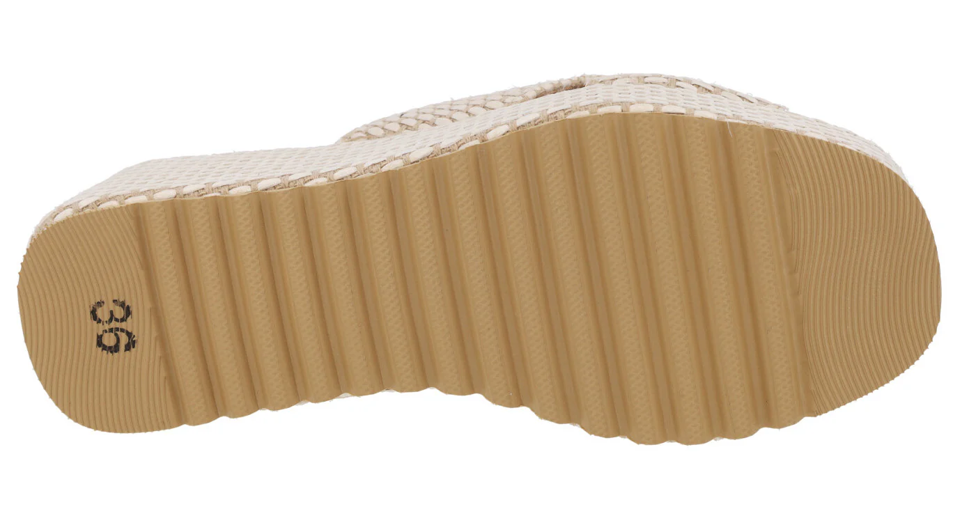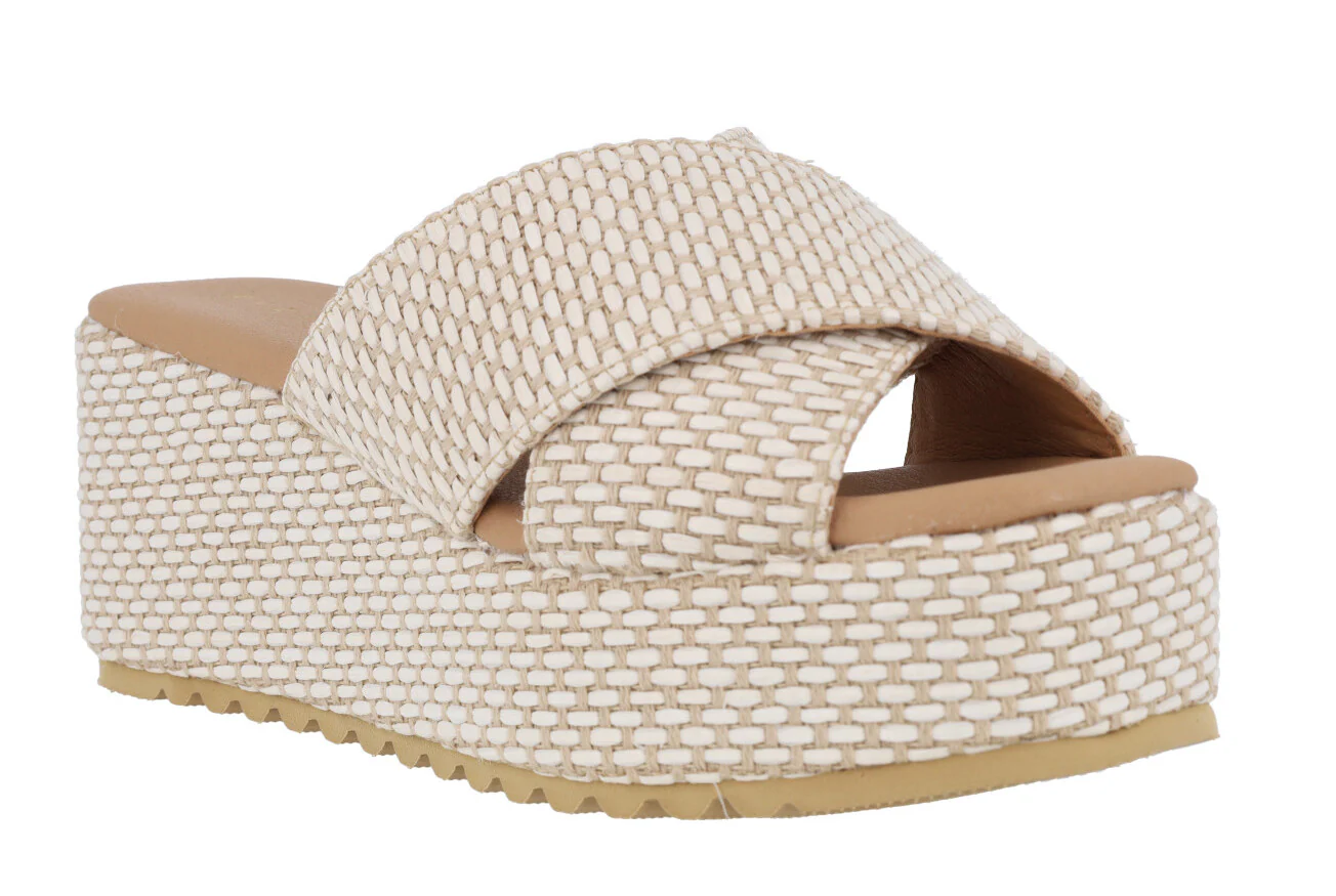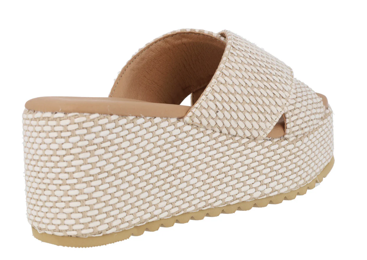 Sandalias Tiziana modelo 2715 Hielo. Sandalias de tiras cruzadas, elaboradas en tejido, combinando beige y blanco roto. Planta acolchada. Plataformas anchas de 7,5 cms de altura en la parte trasera (4 cms en la delantera).