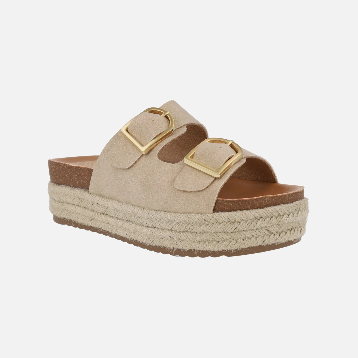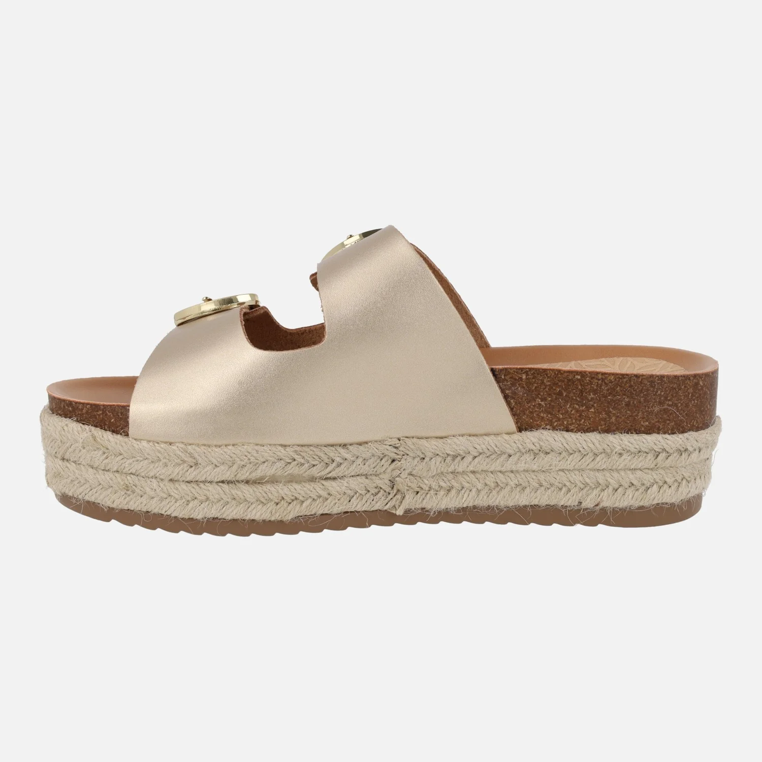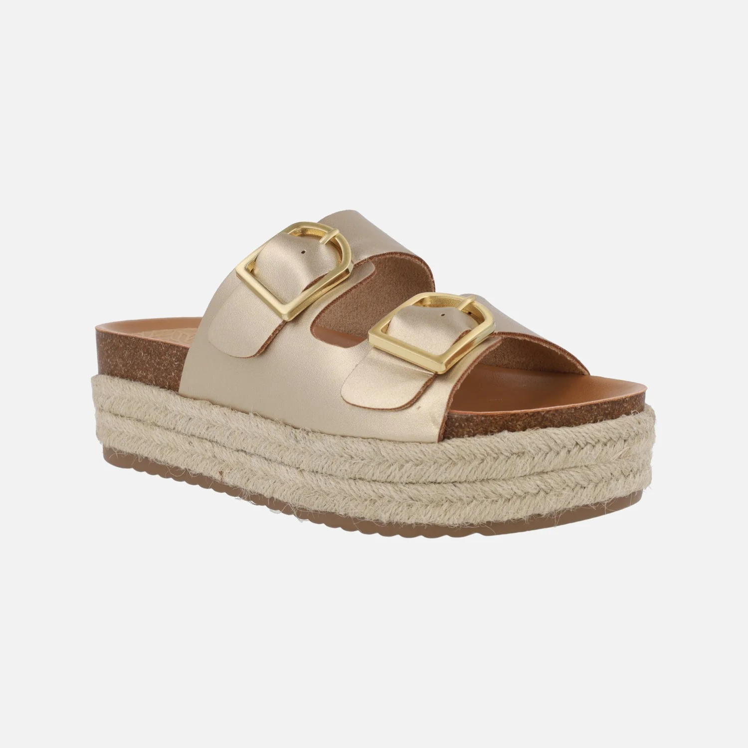 Sandalias para mujer de la marca Mustang modelo 51902, disponibles en mandarina (naranja), arena (beige) o champagne (oro). Sandalias estilo bio con dos hebillas metálicas doradas en la parte superior. Plataforma forrada de yute. Elaboradas en materiales sintéticos y textiles. Altura de plataforma 6 cms.