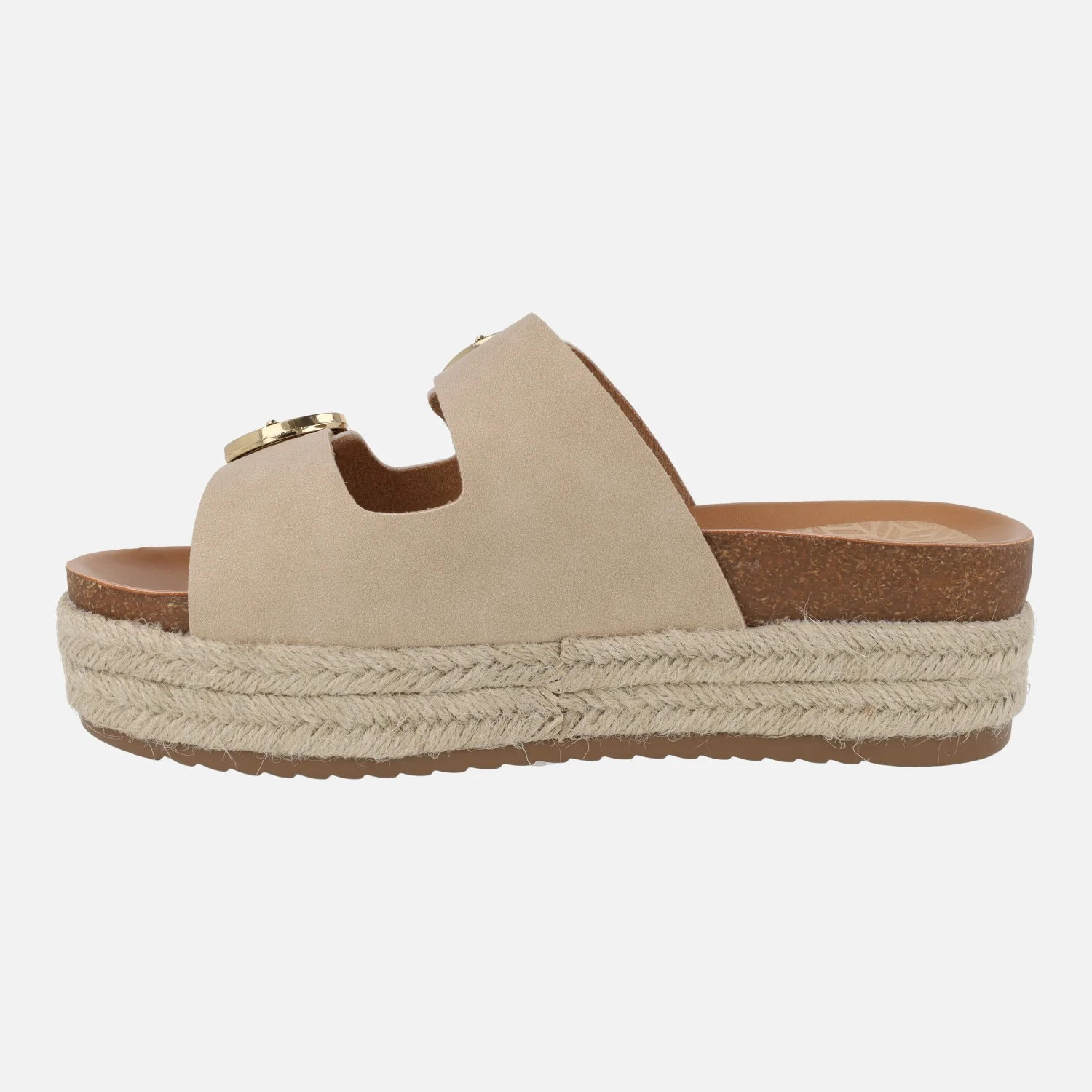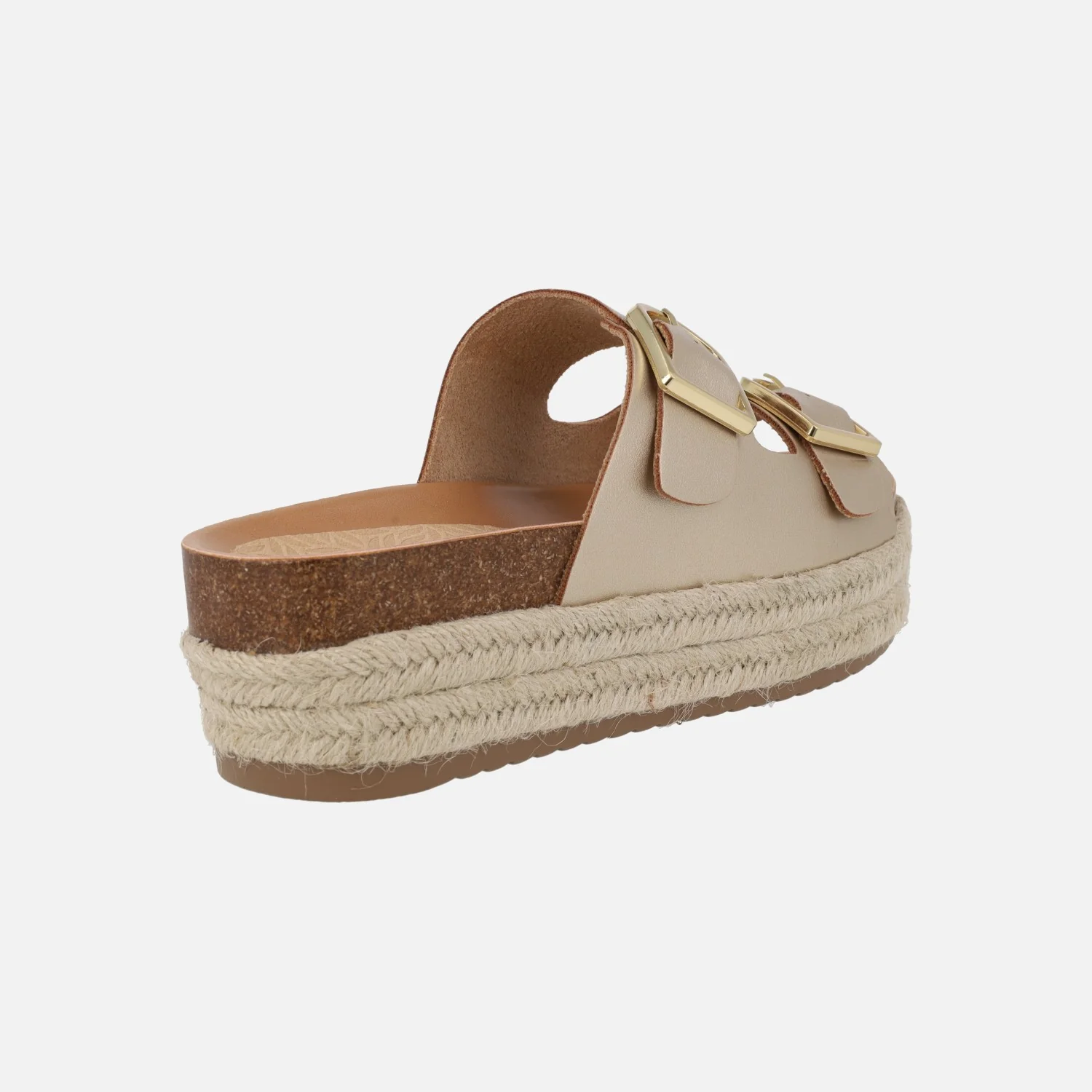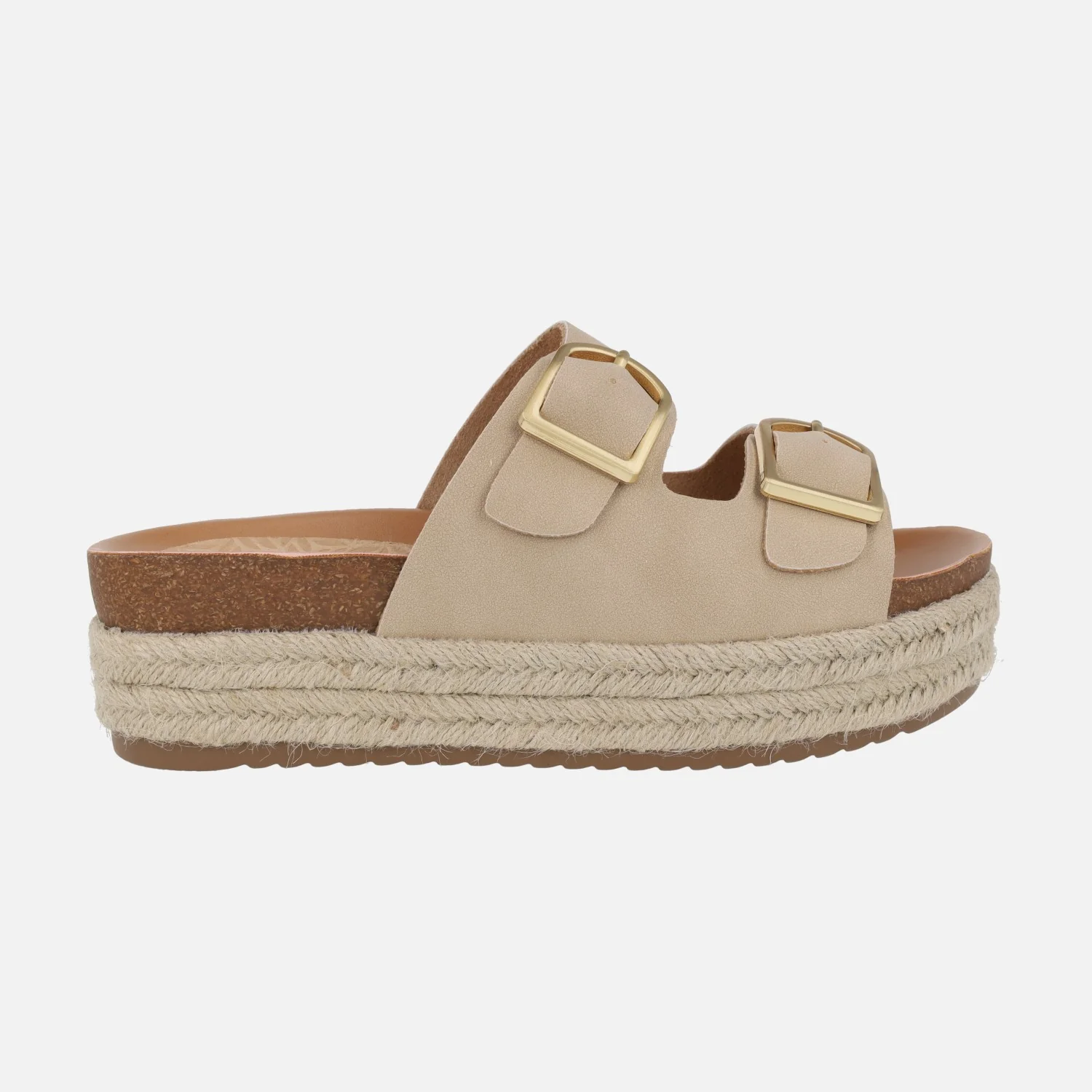 Sandalias para mujer de la marca Mustang modelo 51902, disponibles en mandarina (naranja), arena (beige) o champagne (oro). Sandalias estilo bio con dos hebillas metálicas doradas en la parte superior. Plataforma forrada de yute. Elaboradas en materiales sintéticos y textiles. Altura de plataforma 6 cms.