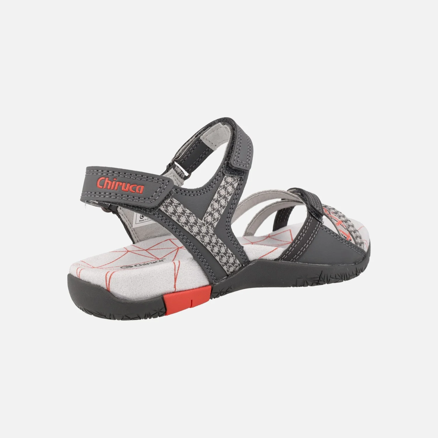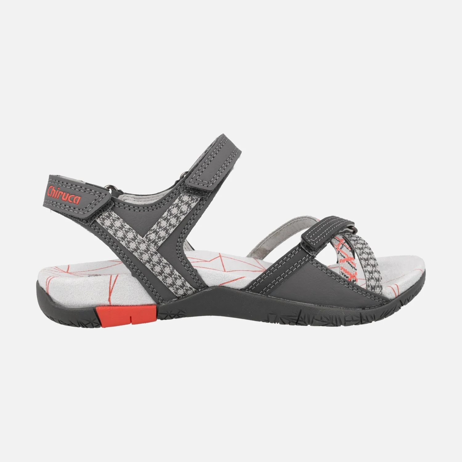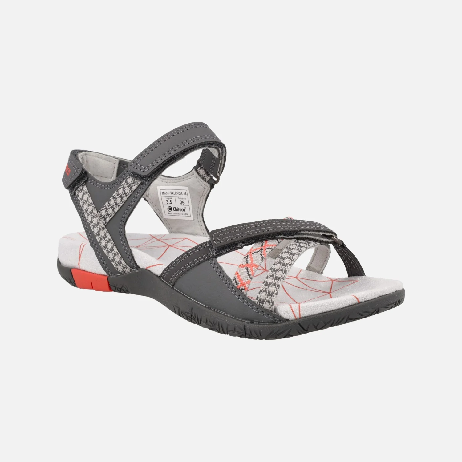 Sandalias para mujer de la marca Chiruca, ideales para tus viajes o rutas de senderismo de baja intensidad. Modelo Valencia 18 en combinado gris-coral. Sandalias elaboradas en tejido y materiales sintéticos, con cierres de velcro. Plantillas acolchadas, muy confortables. Interior textil. Entresuela de EVA forrada de microfibra. Suela de caucho. Aproximadamente 3 cms de altura trasera (2 cms parte delantera).