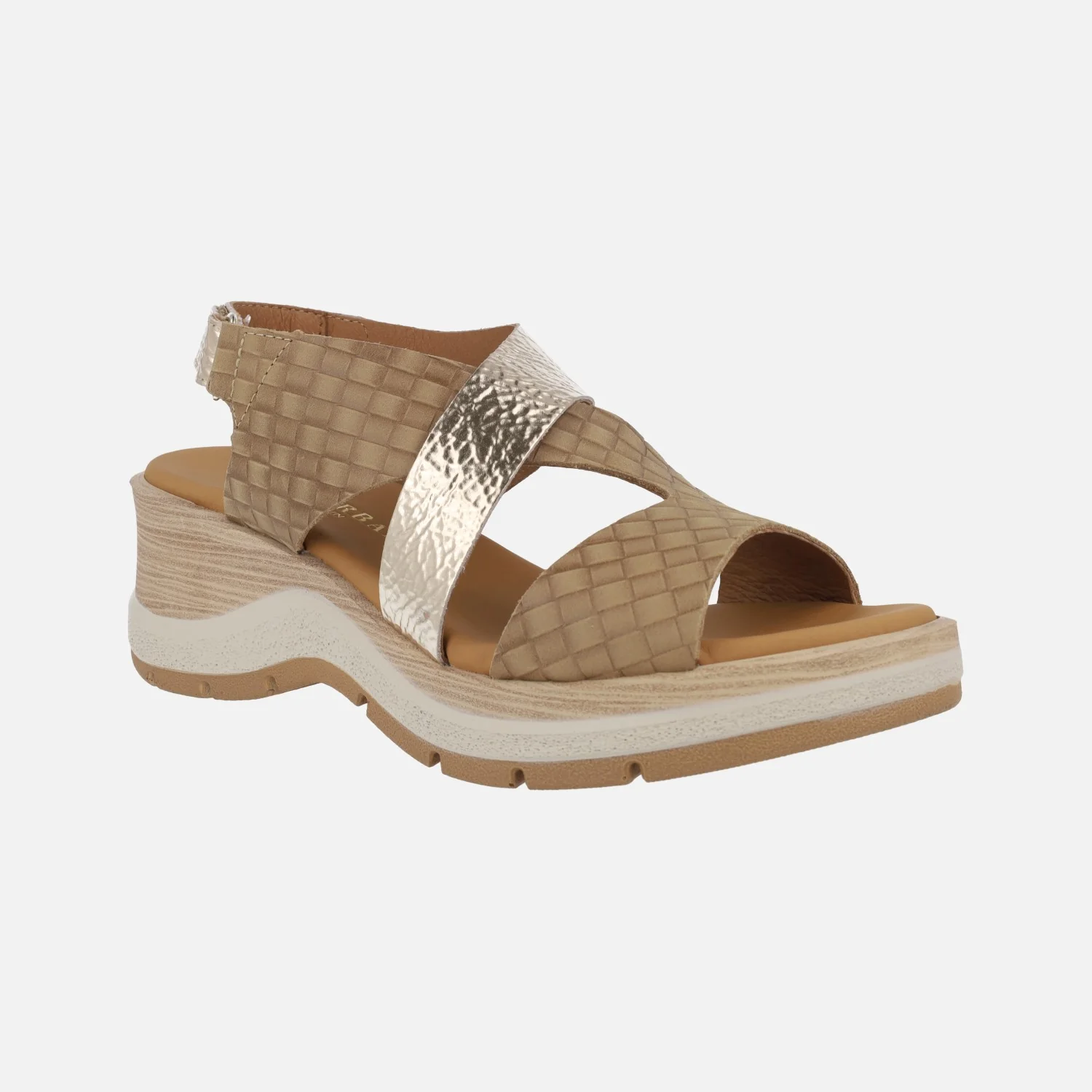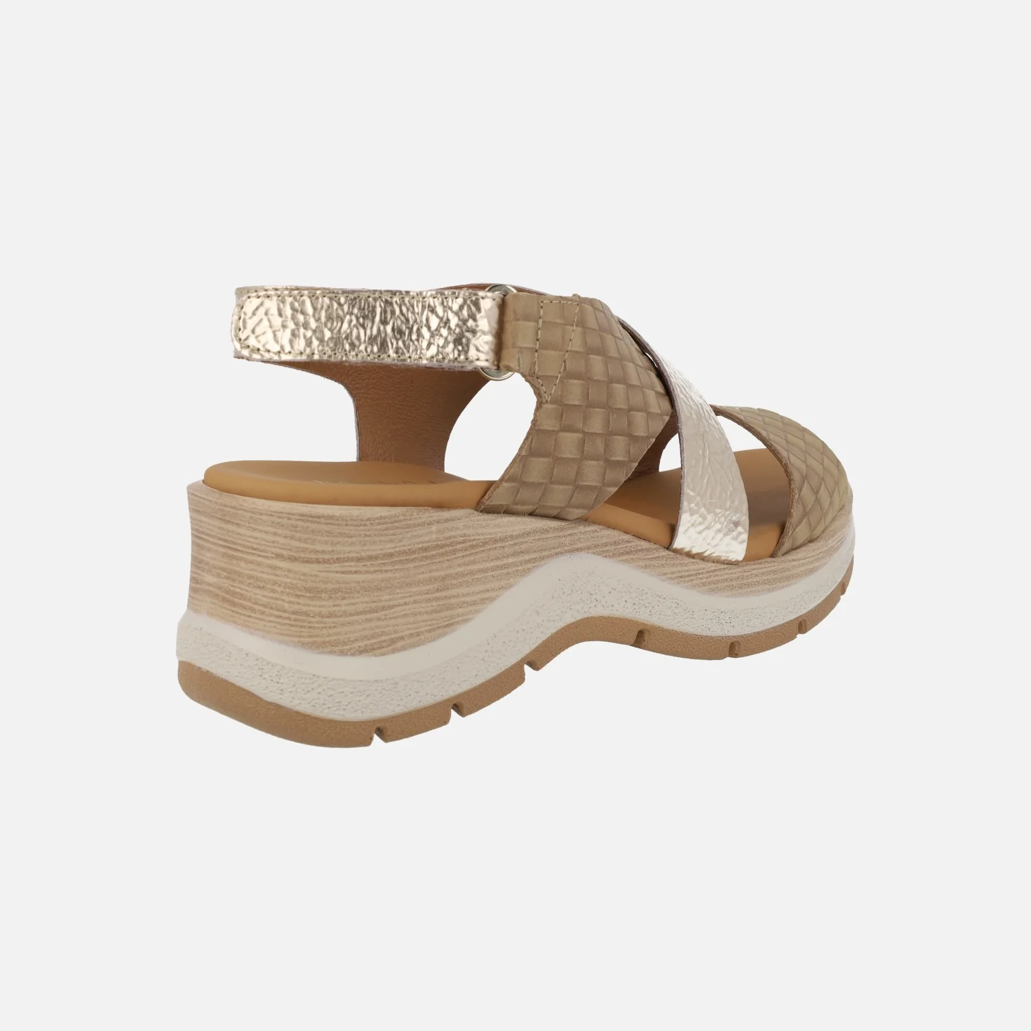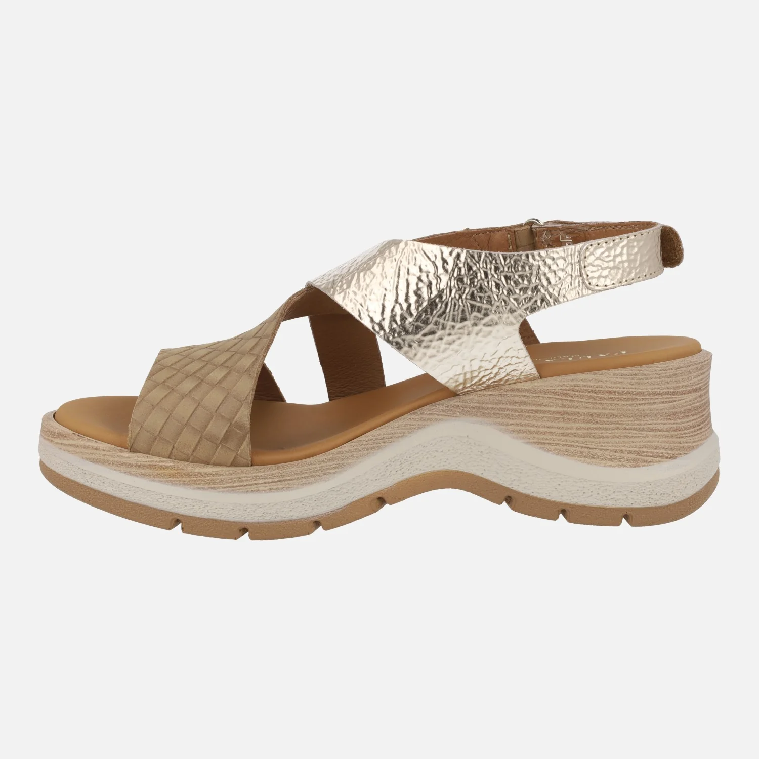Sandalias Paula Urban modelo 27-671 en combinado de nobuck camel y piel metalizada platino (oro claro). Sandalias de piel con tira al talón y cierre de velcro. El nobuck está troquelado haciendo efecto trenzado. Forro y planta de piel. Cuña imitando madera, con una altura trasera de 6 cms (3 cms parte delantera). Made in Spain.