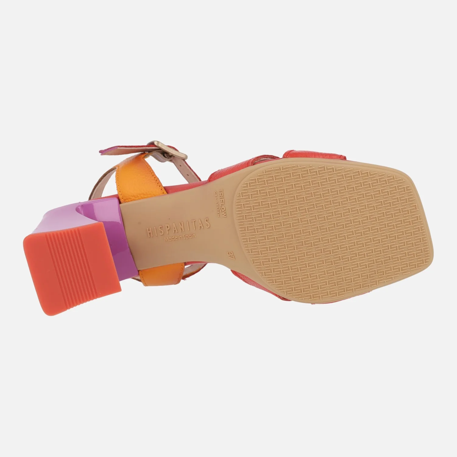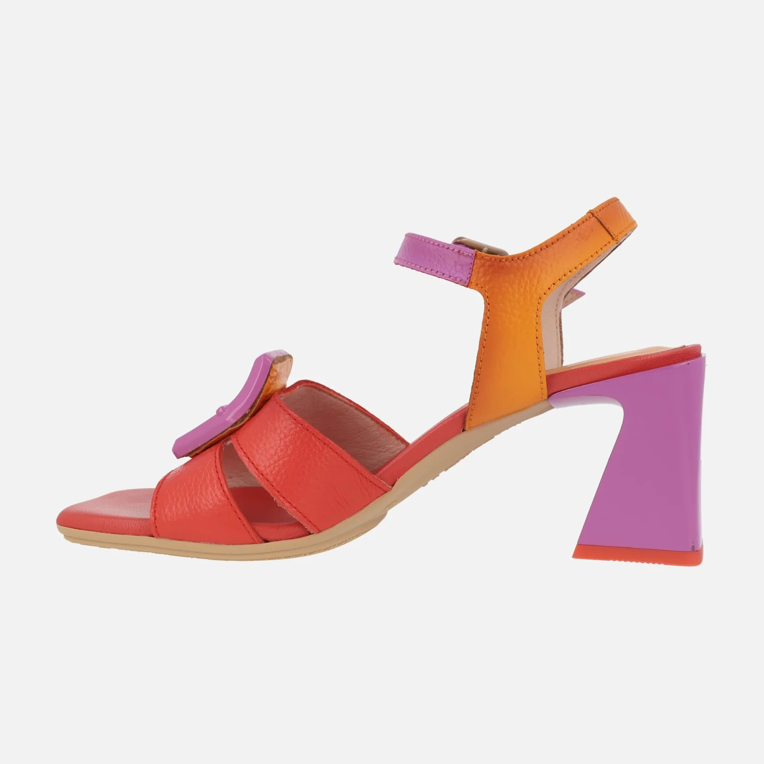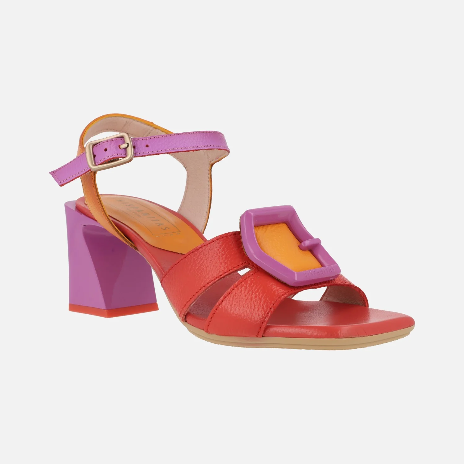 Preciosas y elegantes sandalias para mujer de la marca Hispanitas, modelo chv243272, disponibles en tres combinaciones: fucsia/naranja/rojo coral , camel/beige y azul marino/celeste. Sandalias de tacón con exteriores en piel, tira al tobillo con cierre de hebilla. Adorno de hebilla en pasta en el empeine. Interior mixto de piel y tejido. Tacones de 7 cms de altura.