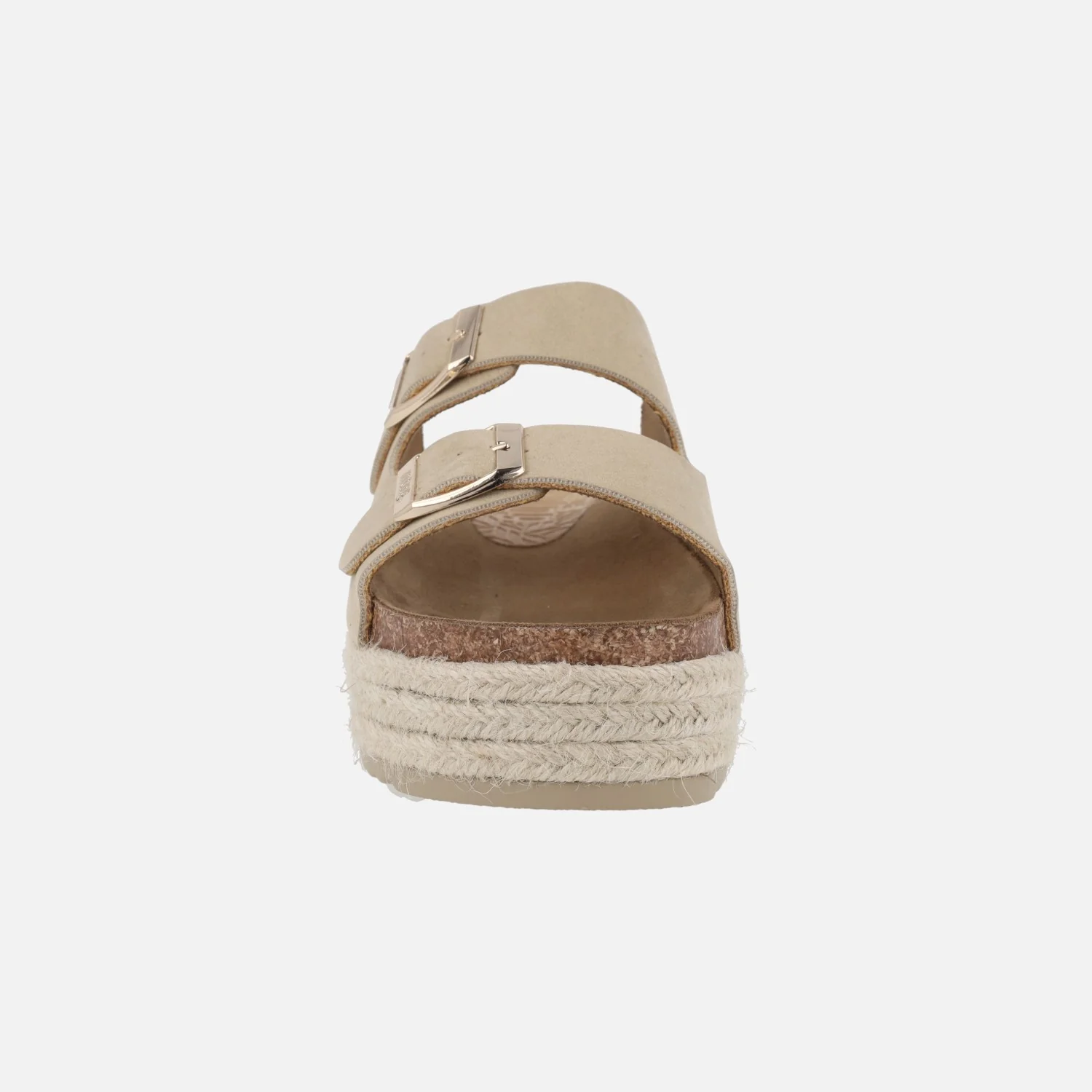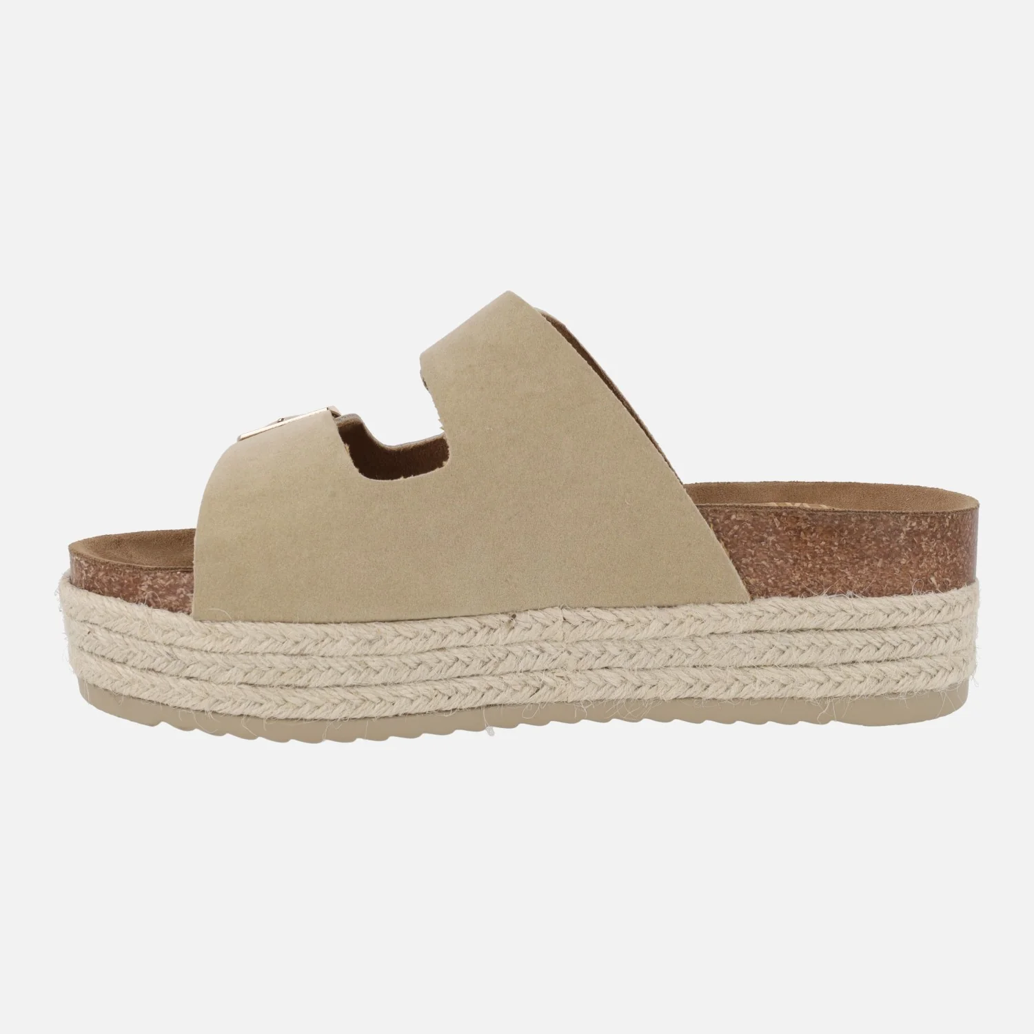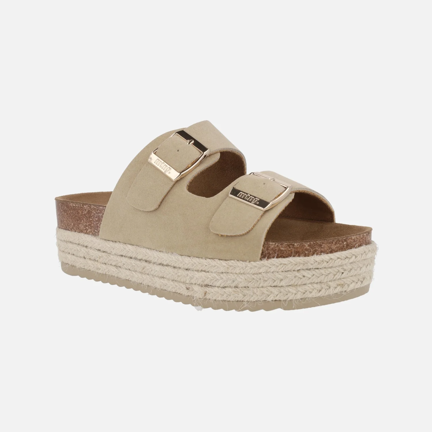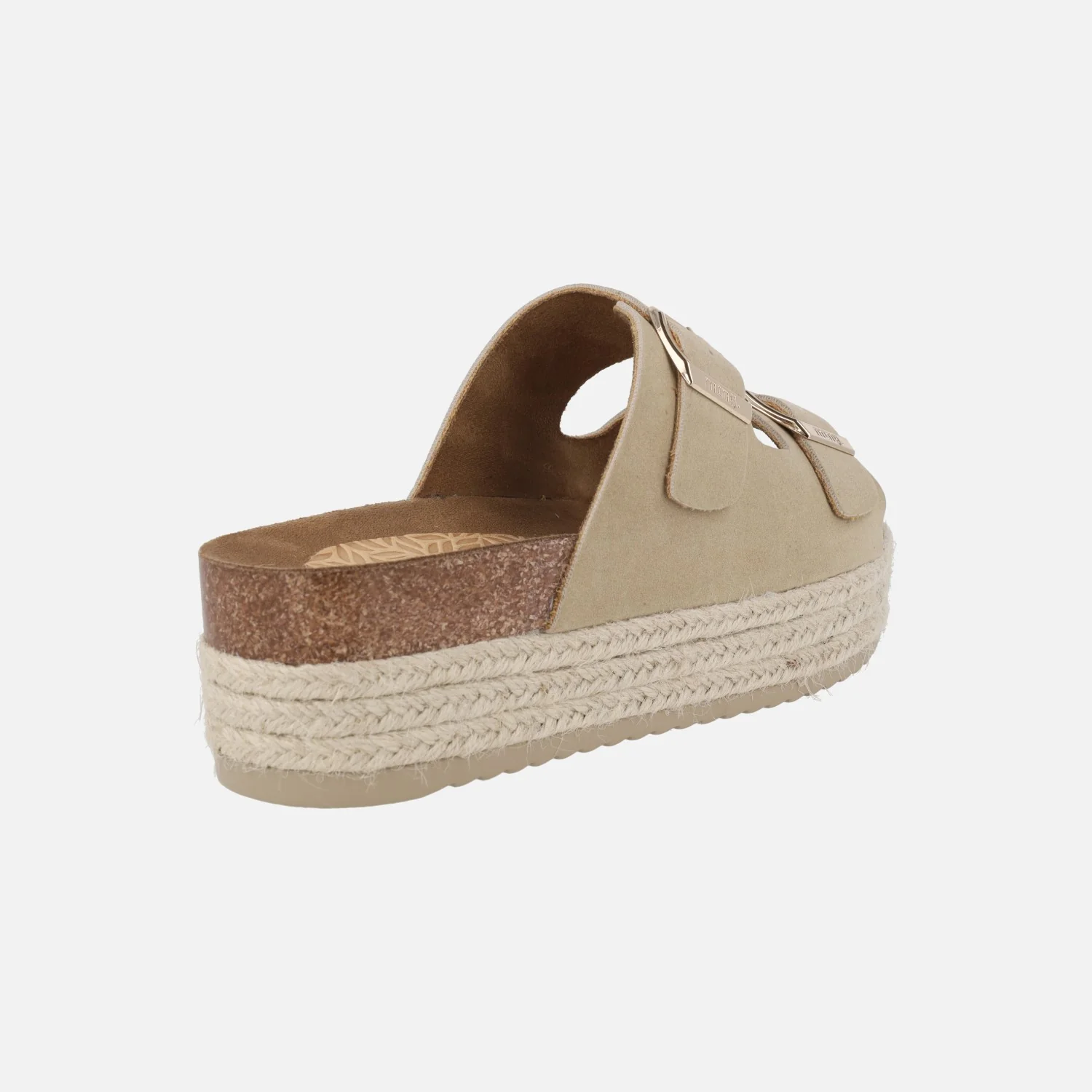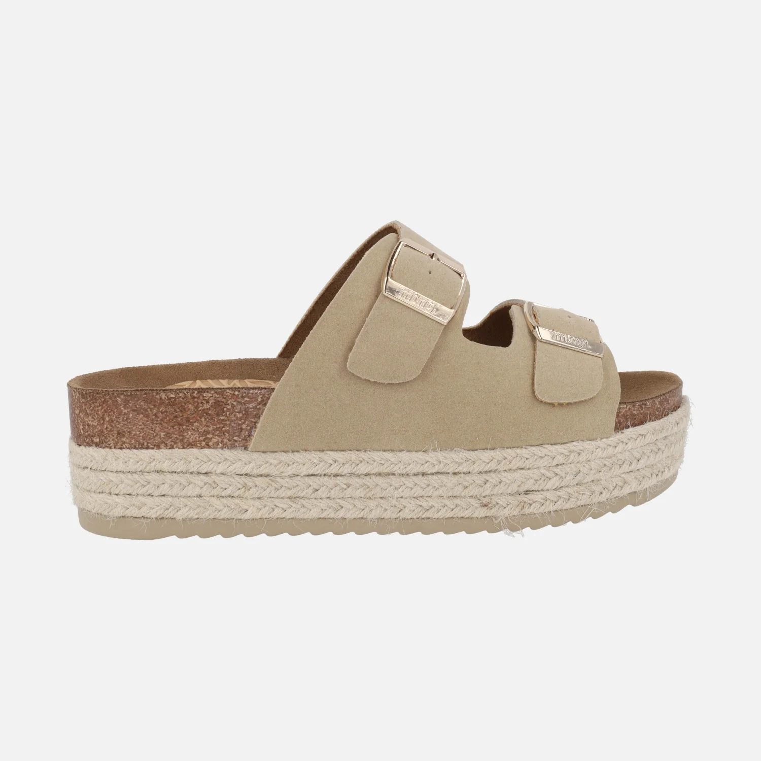Sandalias estilo bio de la marca Mustang modelo 53043 Zongle Arena. Sandalias elaboradas en materiales textiles y sintéticos con cierre doble de hebilla en color dorado. Interior mixto de tejido y piel. Plataforma de 5,5 cms de altura trasera (4 cms parte delantera).