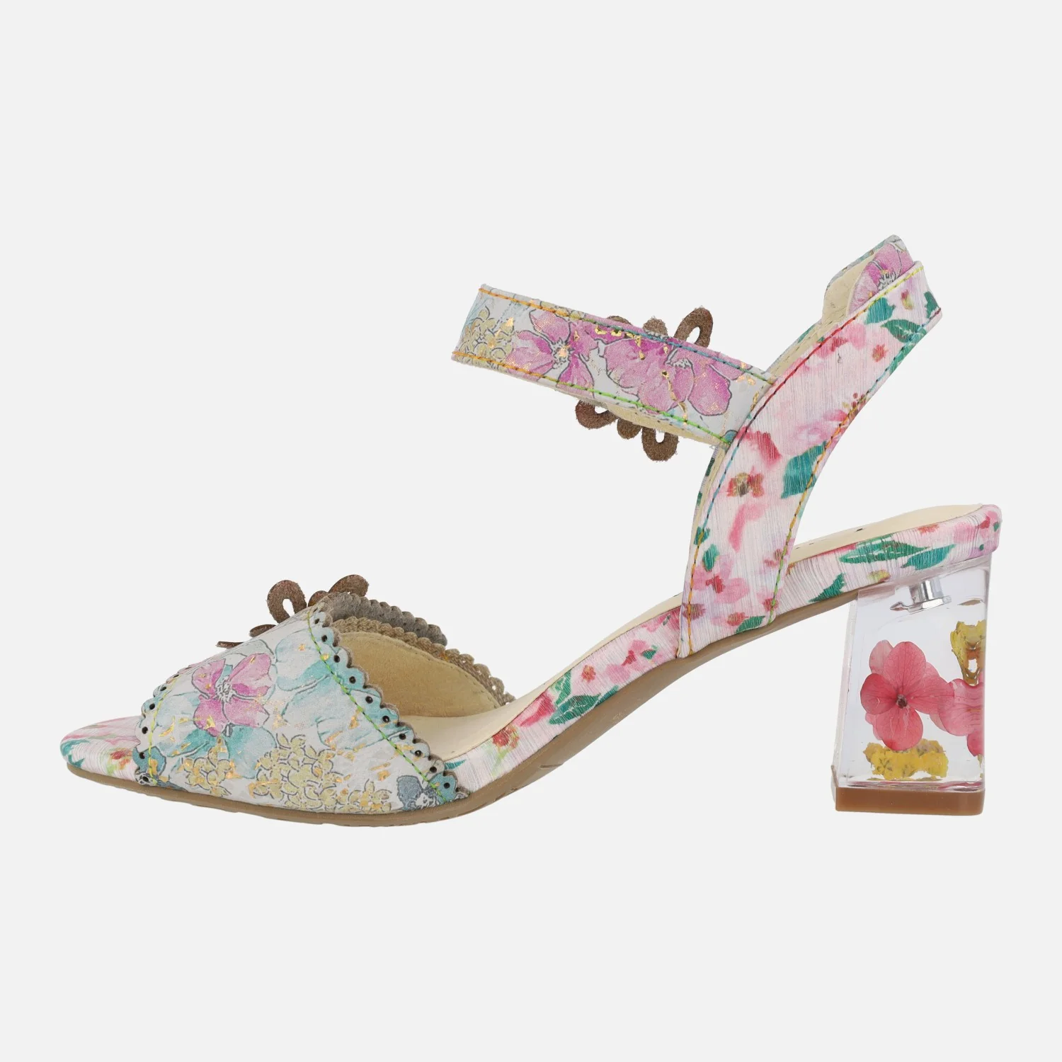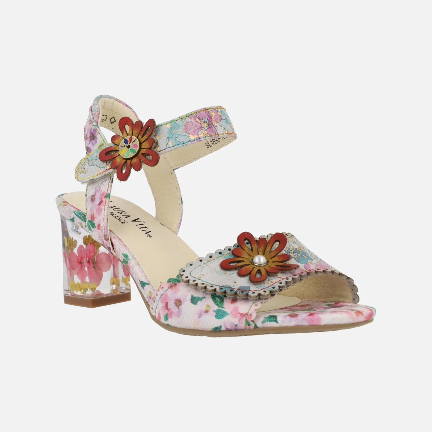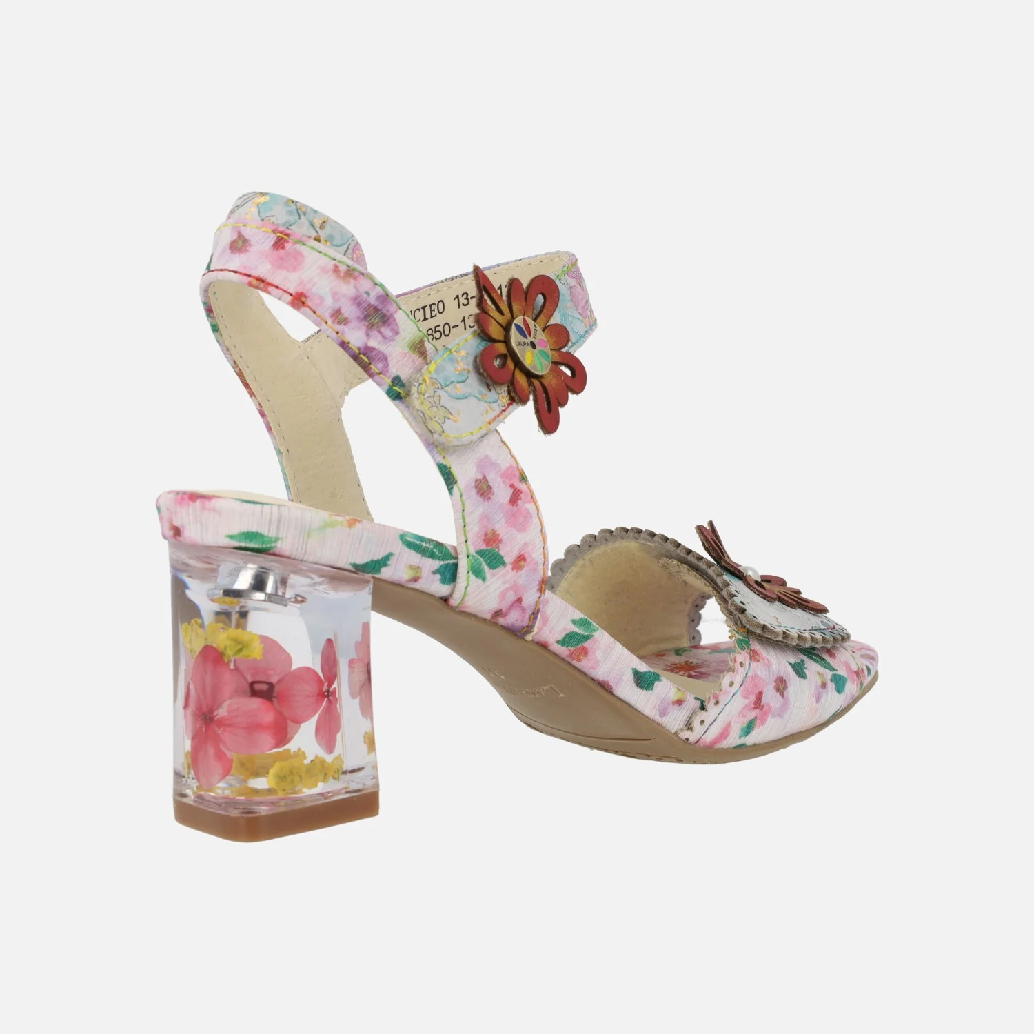 Elegantes sandalias para mujer Laura Vita, modelo Lucieo 13 Cerise. Sandalias elaboradas en piel y tejido combinando distintos colores, donde predominan el blanco y los tonos rosas. Tira al empeine con cierre de velcro y adorno de flor superpuesta. Tira al tobillo también con otro adorno de flor y velcro. Interior mixto de piel y tejido. Piso fino de goma. Tacones de metacrilato transparente con flores, de una altura de 8 cms.