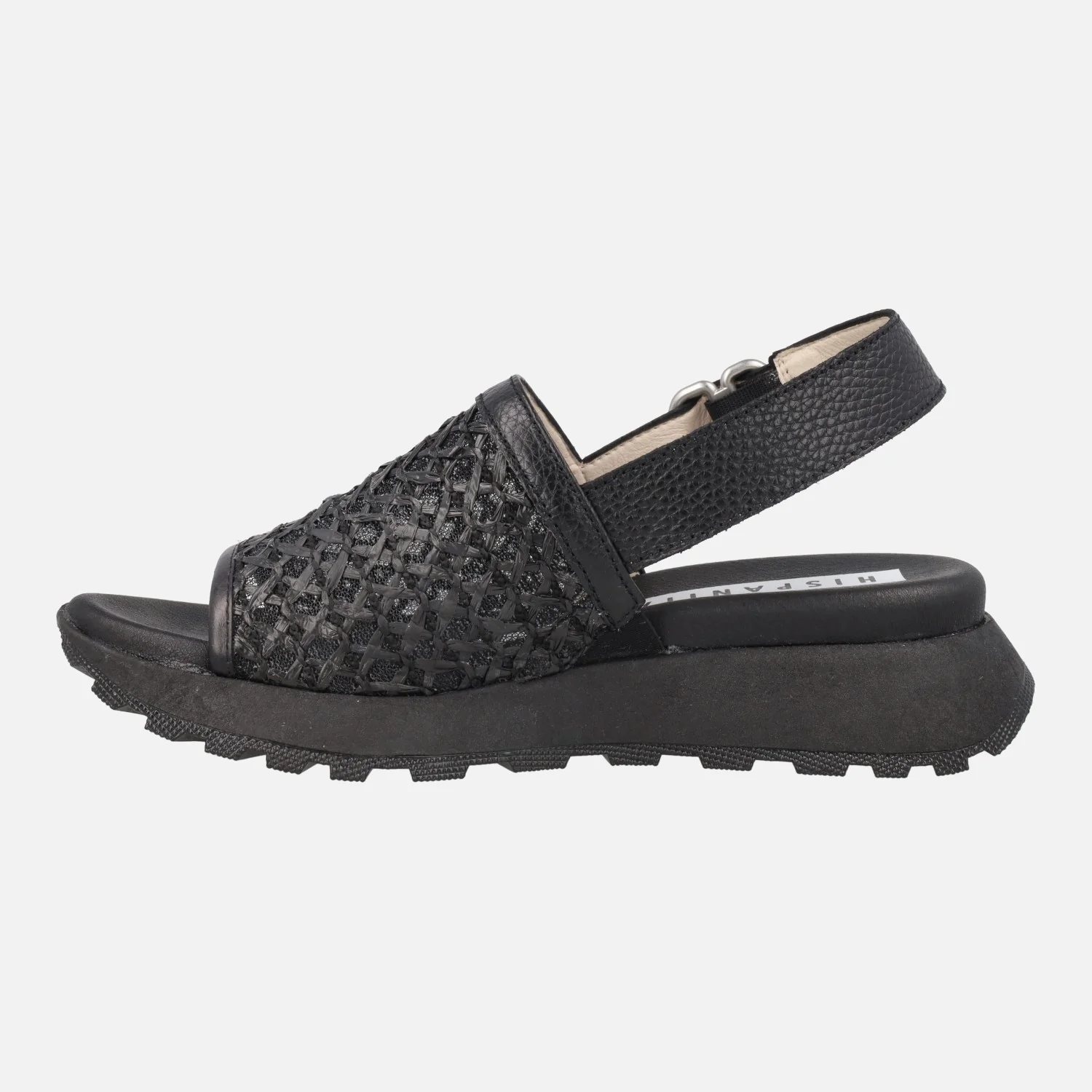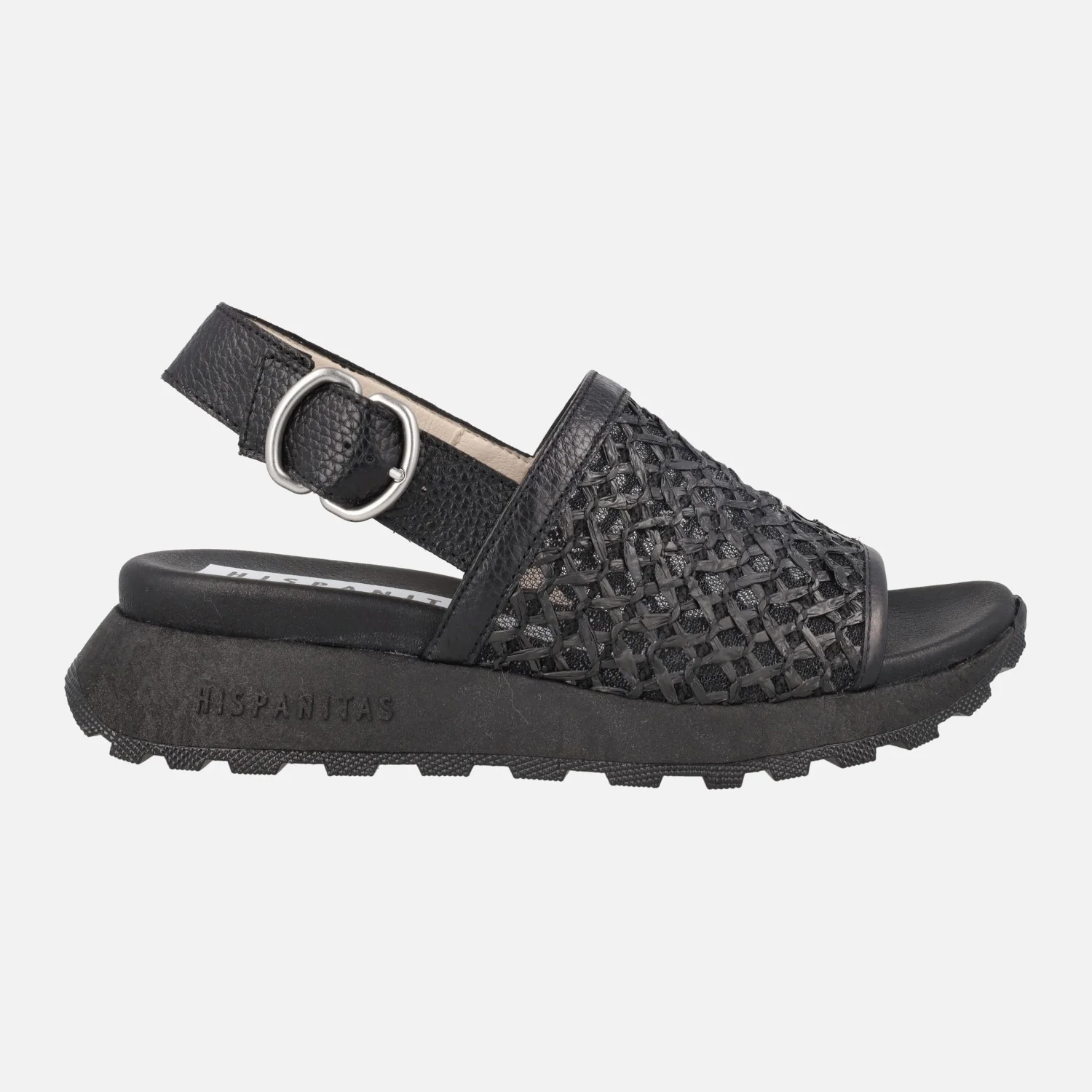 Nuevas sandalias Hispanitas modelo RHV264757, disponibles en negro (black) y en camel (desert/almond). Sandalias formadas por una tira ancha en la parte delantera, elaborada en tejido rafia y piel. Tira de piel al talón con cierre ajustable de hebilla. Interior mixto en piel y tejido. Piso sintético, de 5 cm de altura trasera (2 cm parte delantera). Tecnología TRIFLOW de triple almohadillado para un gran confort al caminar. Made in SPain.