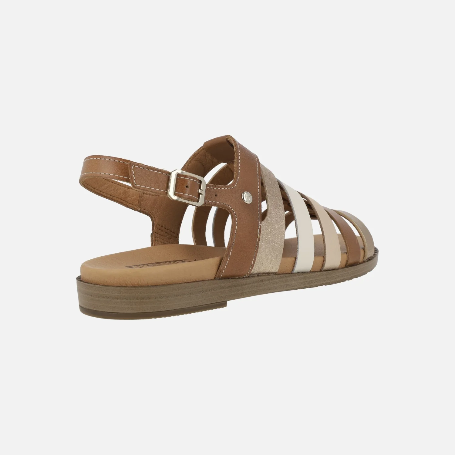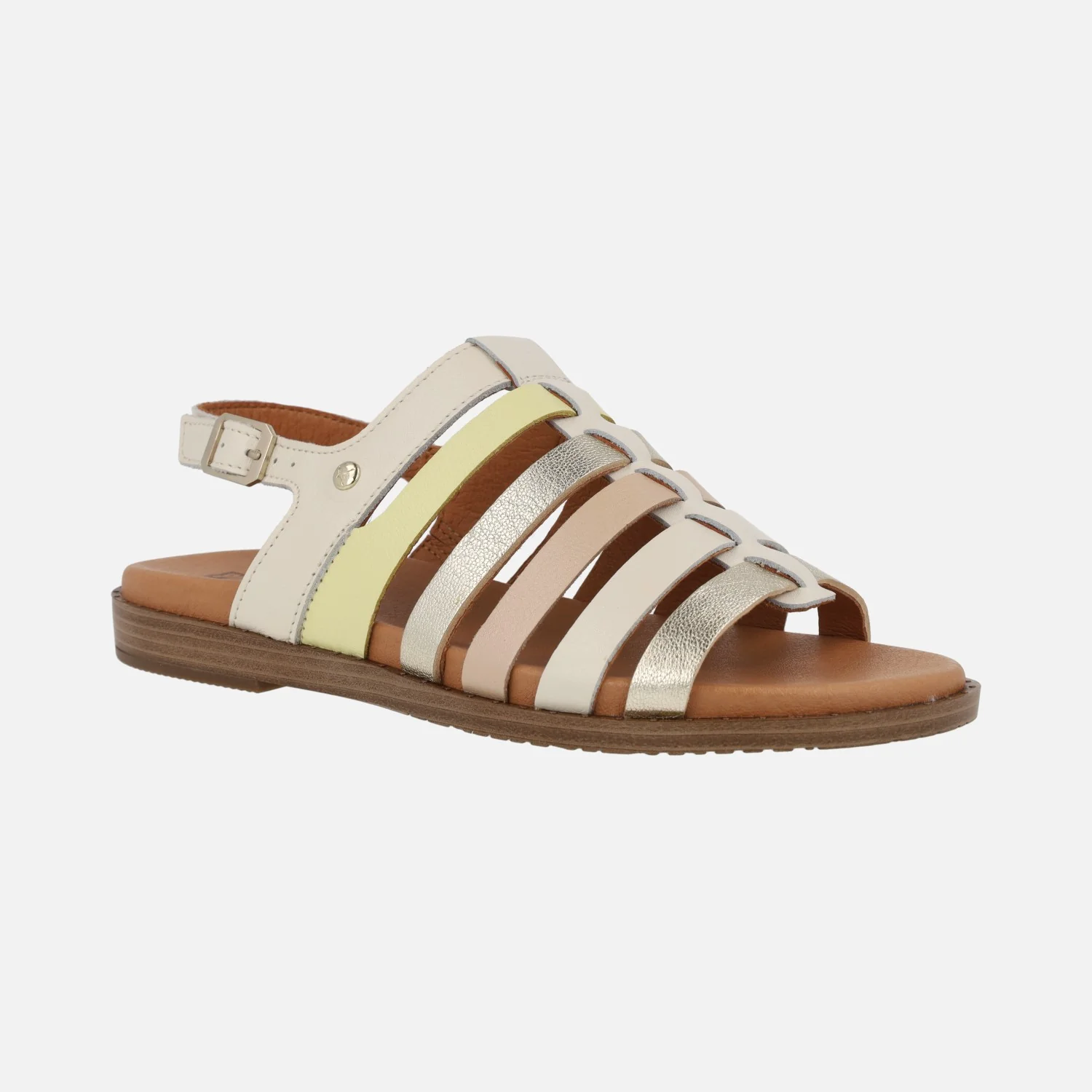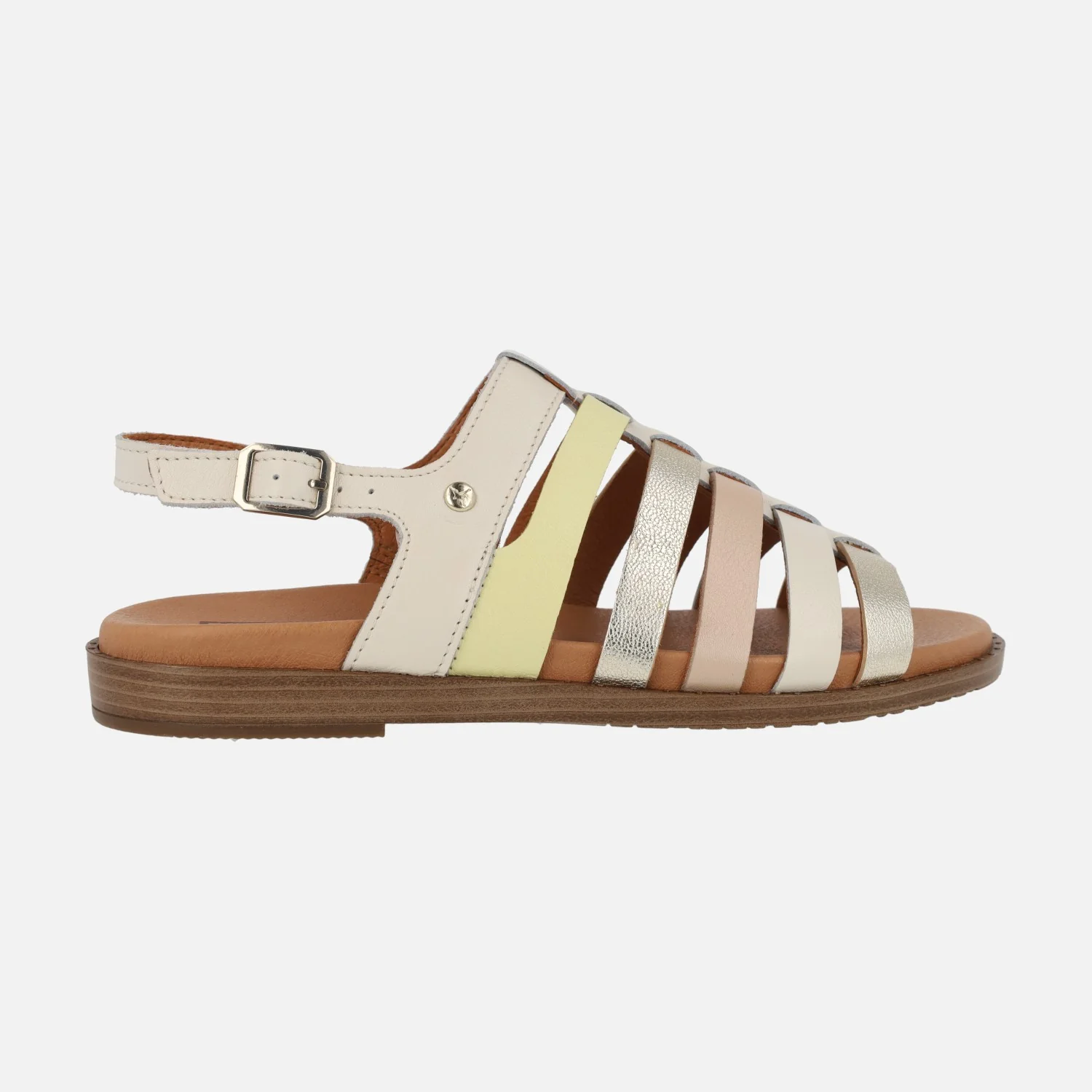 Sandalias planas para mujer de la marca Pikolinos, modelo Formentera W8Q-0799C1, disponibles en combinado nata (beige/nude/platino/amarillo) o en combinado brandy (cuero/oro/beige/nude). Sandalias de piel formadas por tiras y con una tira al talón con cierre de hebilla. Interiores de piel, planta acolchada. Piso sintético, de 2,5 cms de altura trasera.