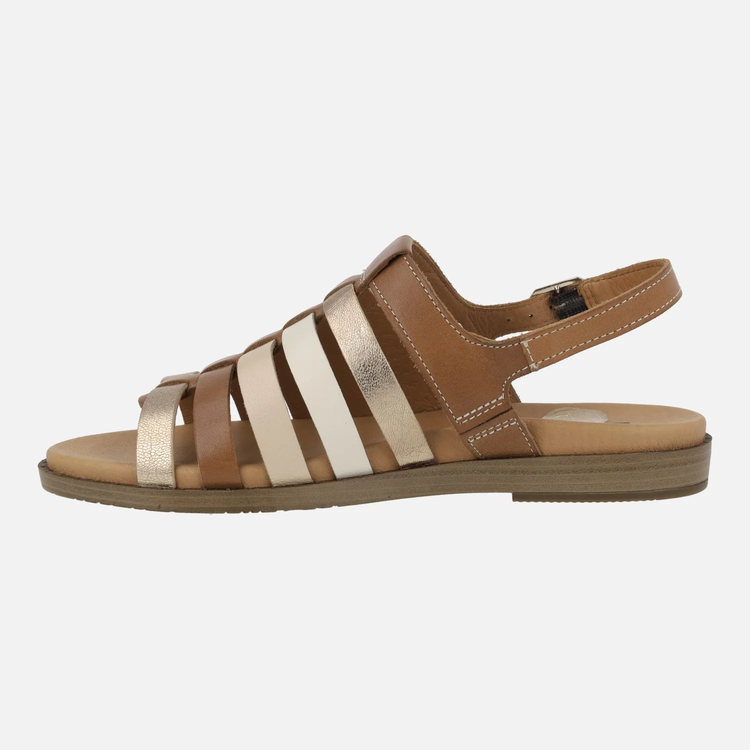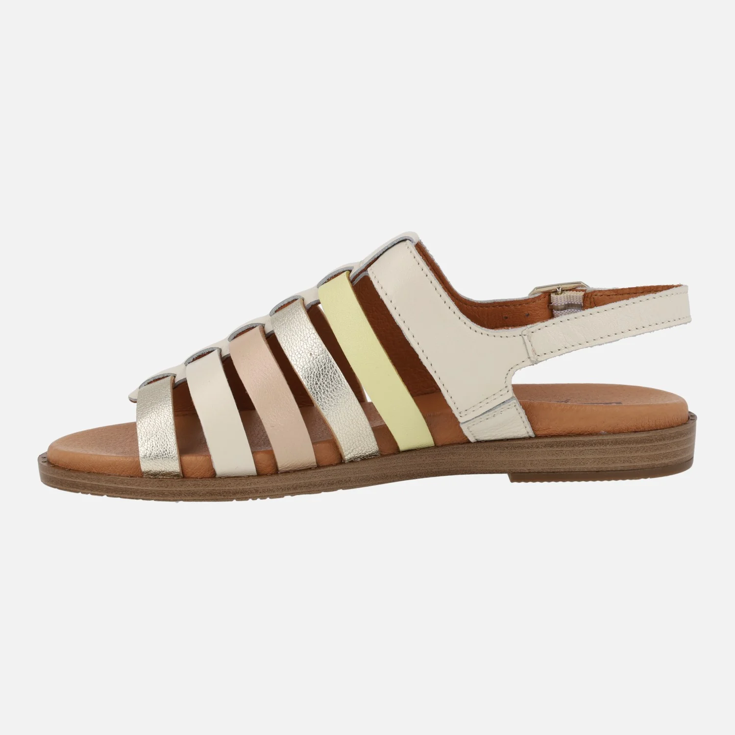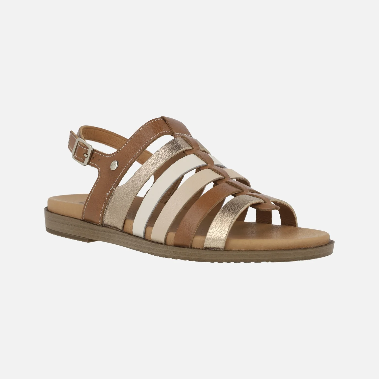Sandalias planas para mujer de la marca Pikolinos, modelo Formentera W8Q-0799C1, disponibles en combinado nata (beige/nude/platino/amarillo) o en combinado brandy (cuero/oro/beige/nude). Sandalias de piel formadas por tiras y con una tira al talón con cierre de hebilla. Interiores de piel, planta acolchada. Piso sintético, de 2,5 cms de altura trasera.