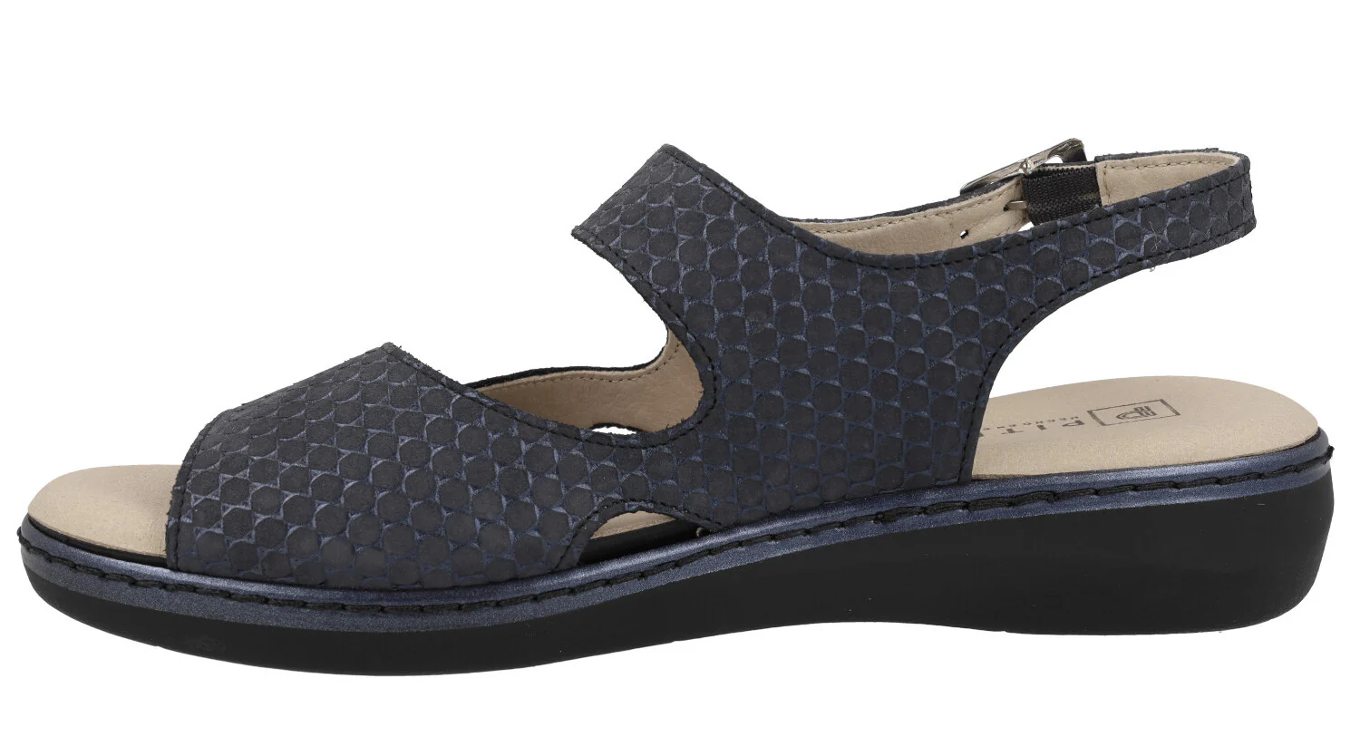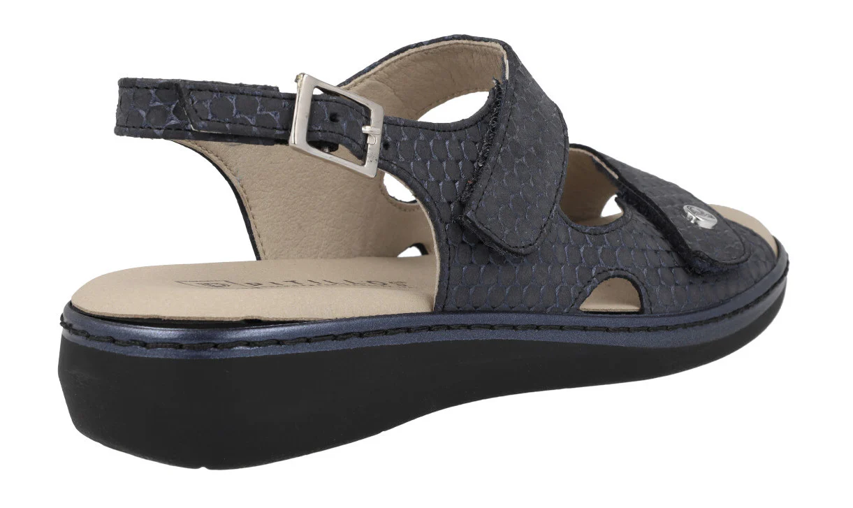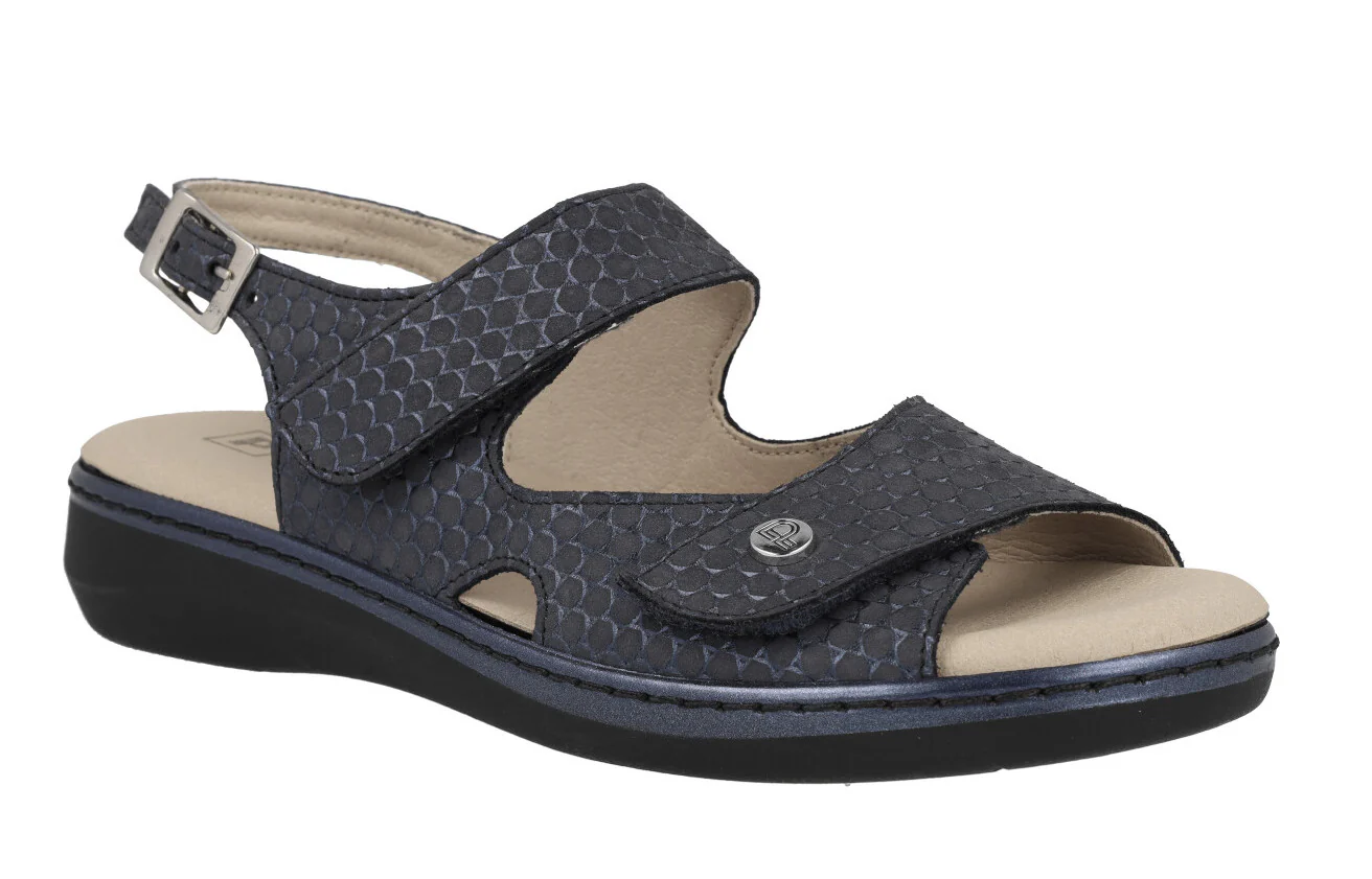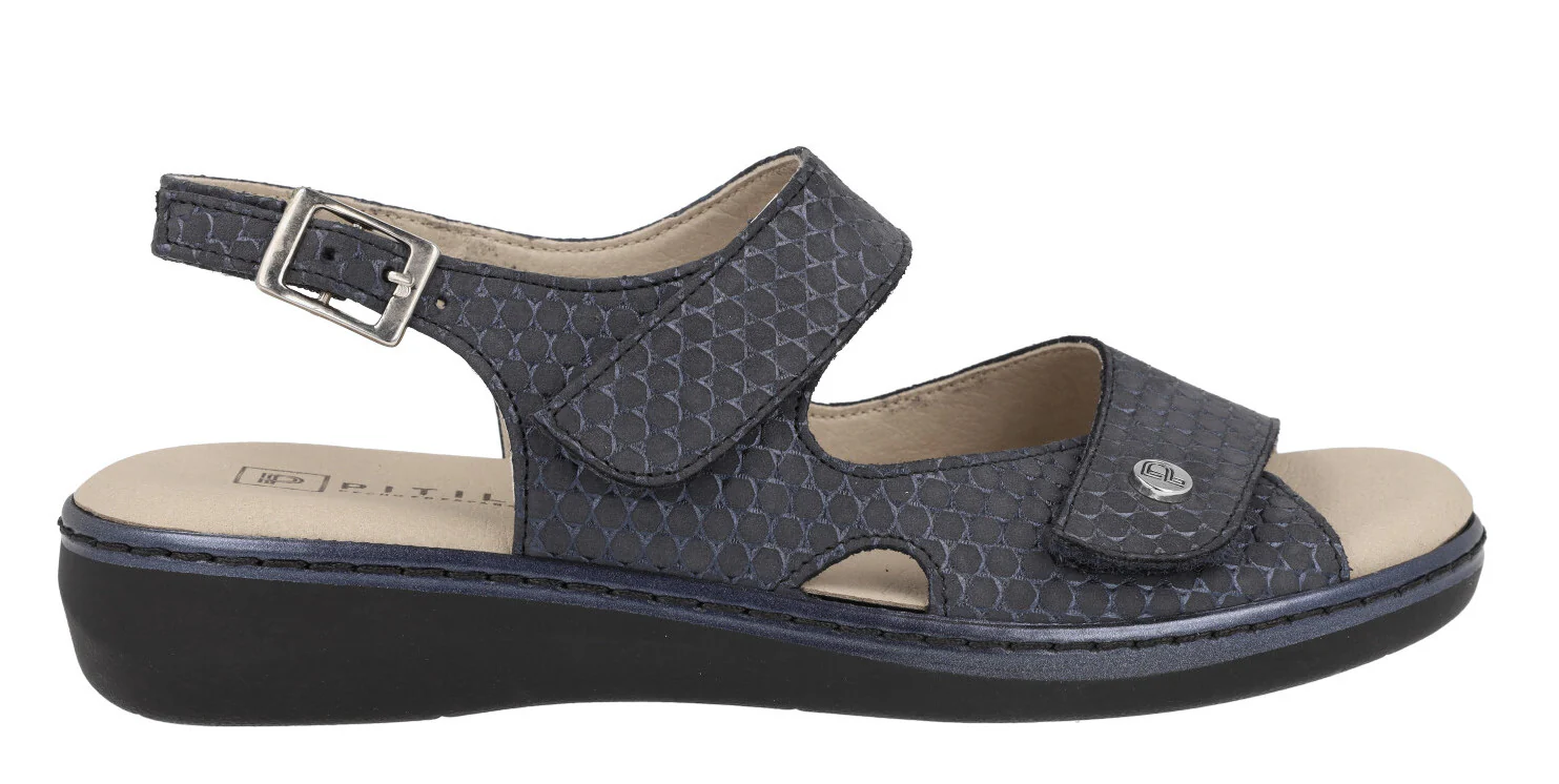Sandalias confort para mujer de la marca Pitillos modelo 5000 azul. Sandalias confort elaboradas en piel grabada azul marino, con dos tiras ajustables con velcro y una trasera con hebilla. Forro y planta textil estilo microfibra. Planta extraíble. Piso de goma de 3,5 cms (1,5 cms parte delantera). Made in SPain.