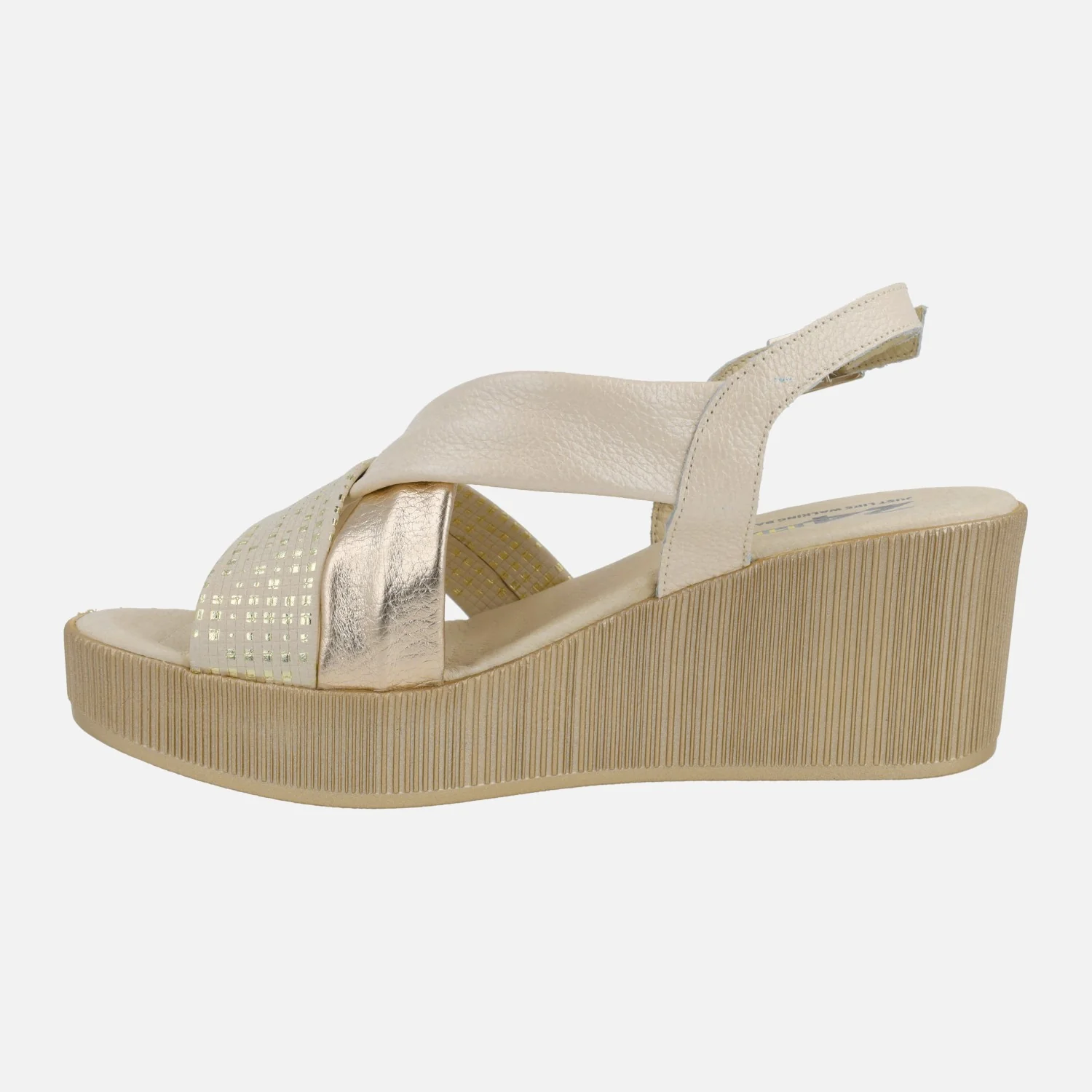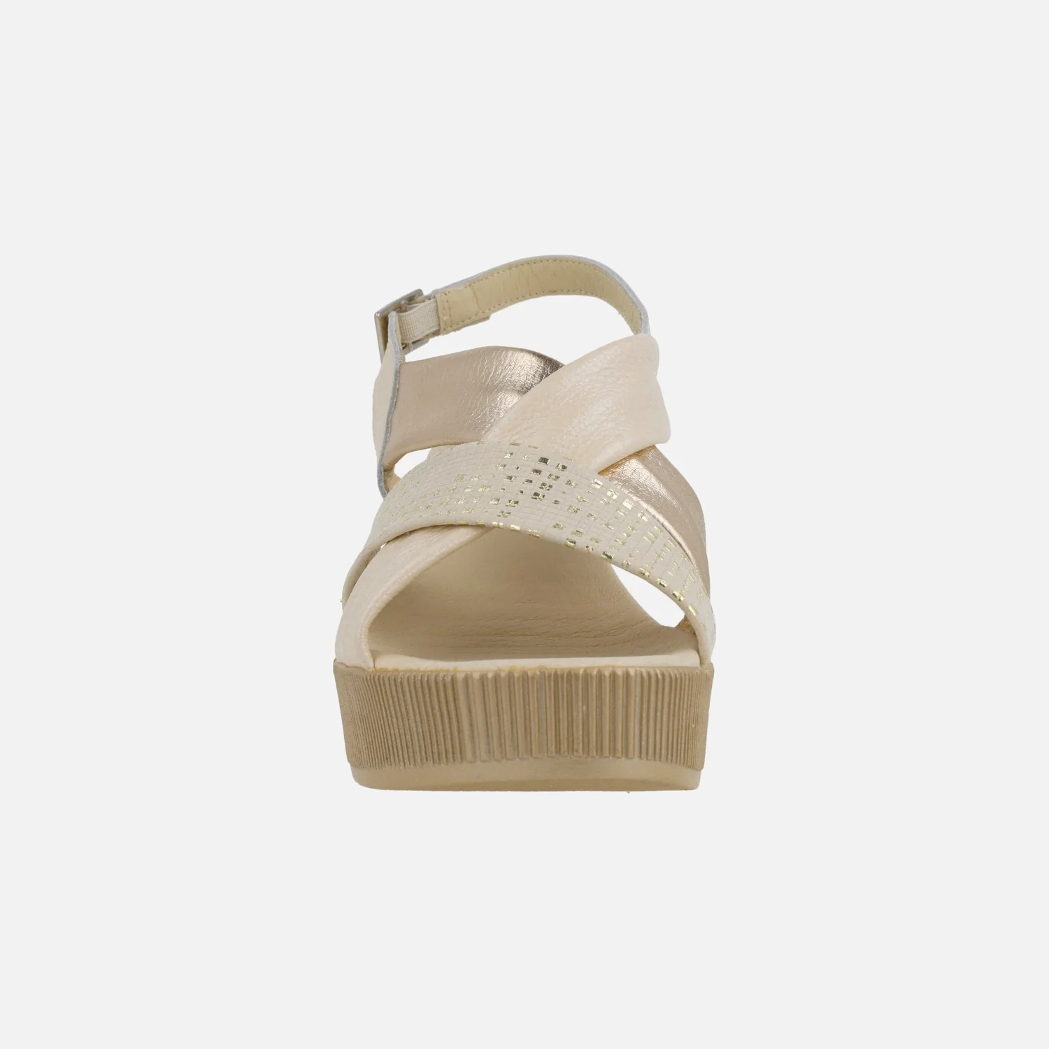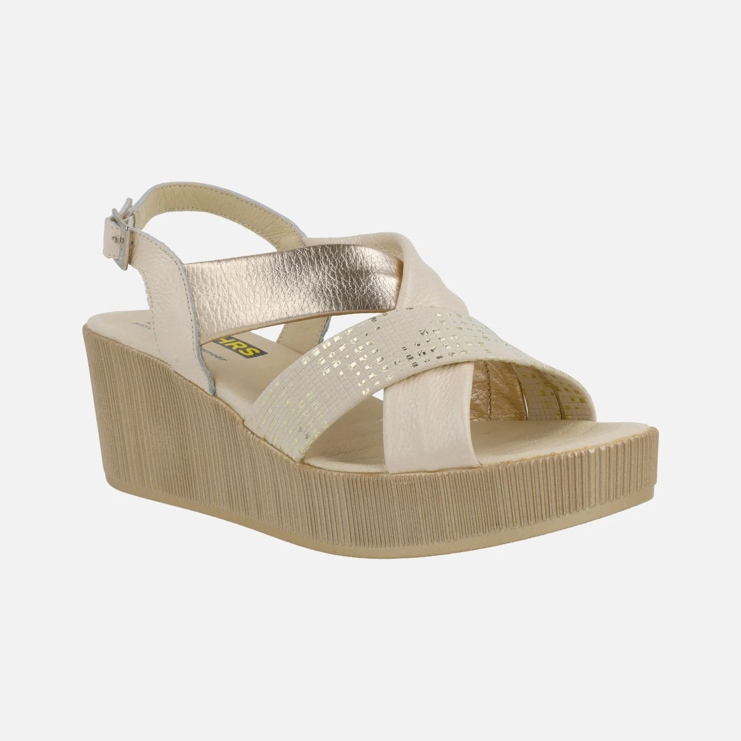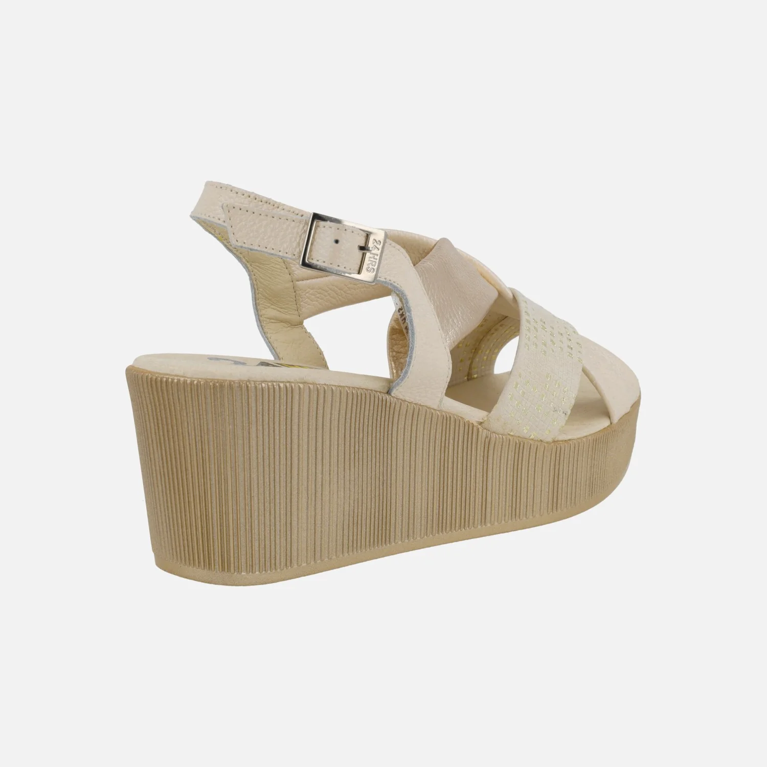 Sandalias de piel para mujer de la marca 24 Horas modelo 26481 Combi Lino. Sandalias formadas por tiras anchas de piel que se cruzan en la pala, en distintos acabados: piel, piel metalizada, nobuck grabado… combinando beige y dorados. Tira al talón con cierre de hebilla ajustable. Interiores forrados de piel, con planta acolchada. Cuña alta de 7 cms de altura trasera (3,5 cms plataforma delantera).