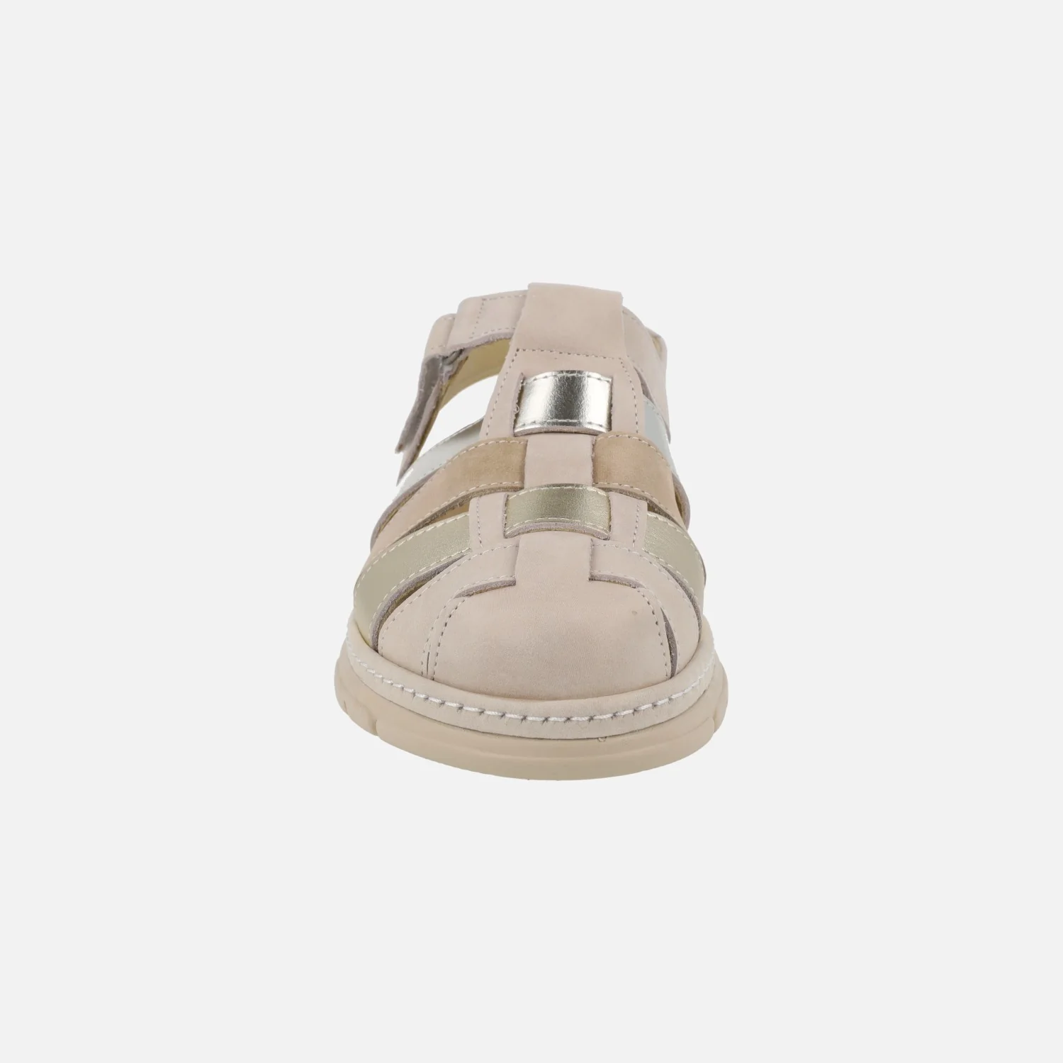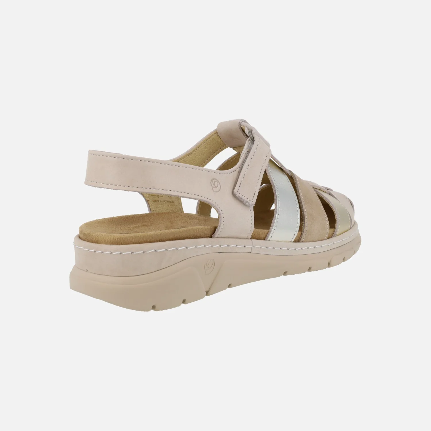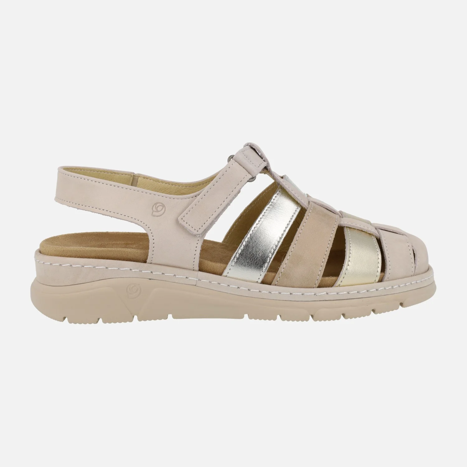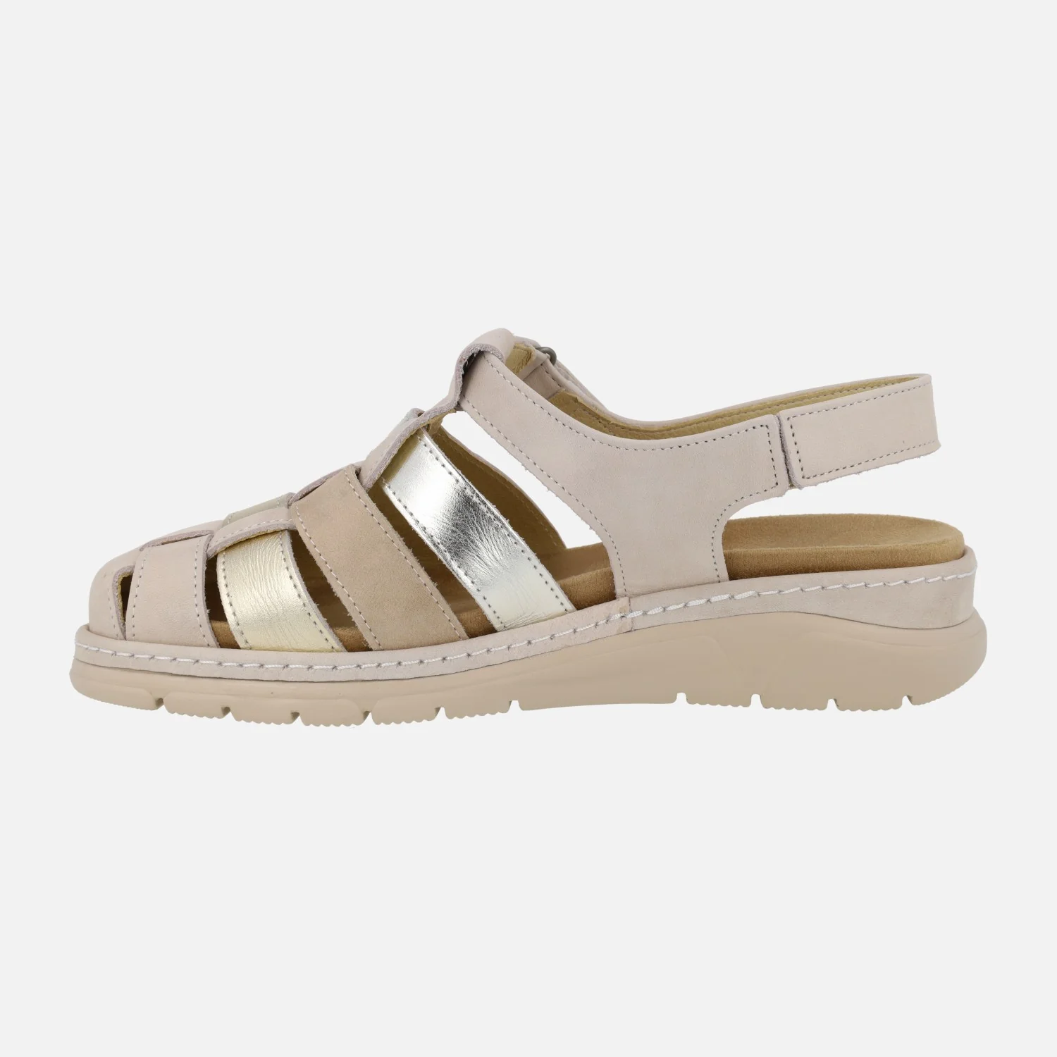 Sandalias de piel combinadas de la marca Suave by Leyland, modelo 3369 Oro. Sandalias con la parte delantera semi abierta, formada por tiras combinando beige, oro, taupe… Cierre al empeine con velcro, para mayor comodidad. Exterior de piel, interior mixto en piel y tejido. Tira al talón con pequeño elástico para mejor calce y sujeción. Plantillas extraíbles. Piso de goma con 4,5 cms de altura trasera (2,5 cms).