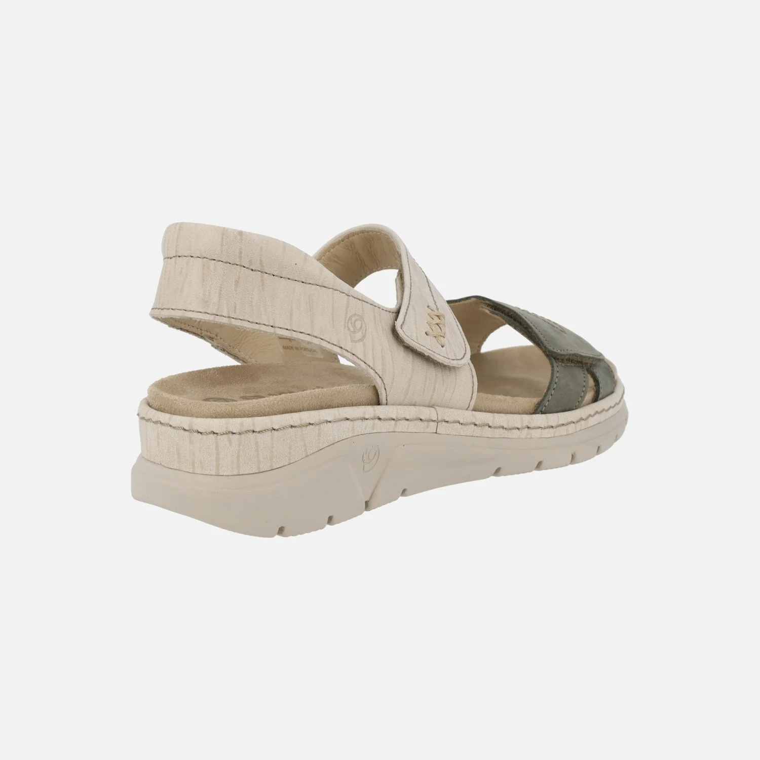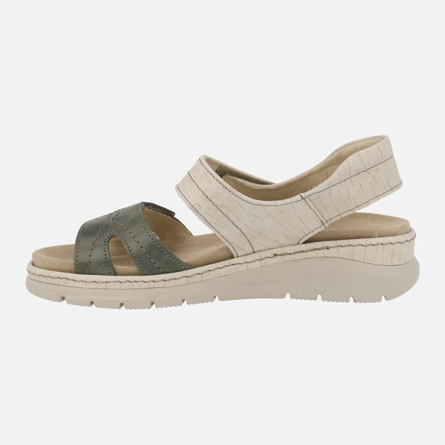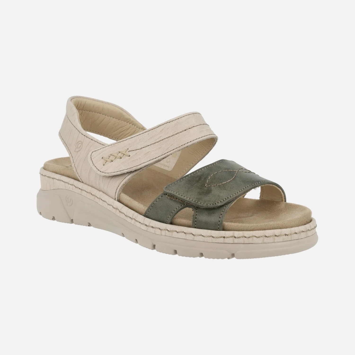 Sandalias confort de estilo deportivo marca Suave by Leyland, modelo 3350 Beige/Verde. Sandalias con cierre de velcros, tanto en la pala como al tobillo. Elaboradas en piel combinando beige y verde kaki. Forro de piel, plantillas extraíbles en tejido. Piso de goma, de 4,5 cms de altura trasera (2.5 cms parte delantera).