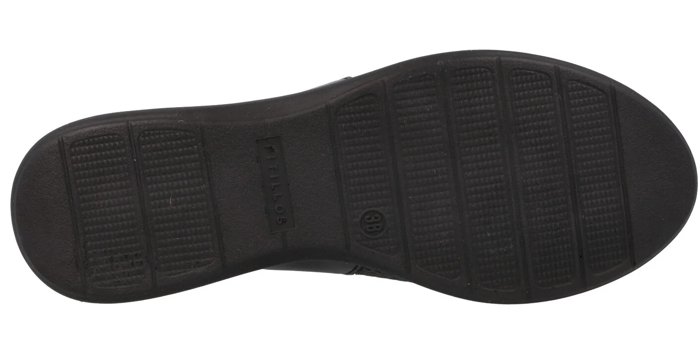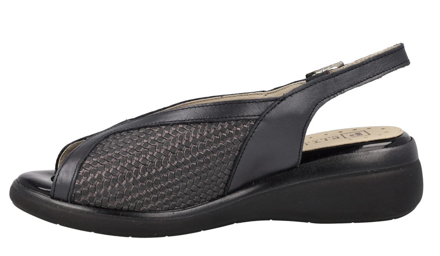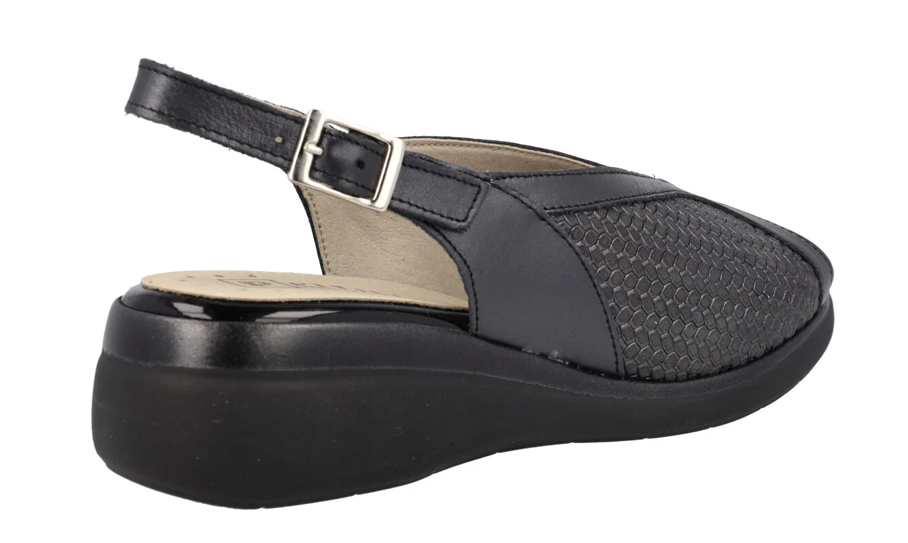 Sandalias negras de piel de la marca española Pitillos modelo 5015 Negro. Sandalias confort, elaboradas en piel negra, combinando piel lisa y efecto trenzado, con ligero brillo metalizado. Tira al talón con cierre de hebilla. Forro y planta textil. Cuña baja, muy ligera, de 5 cms de altura trasera. Made in SPain.