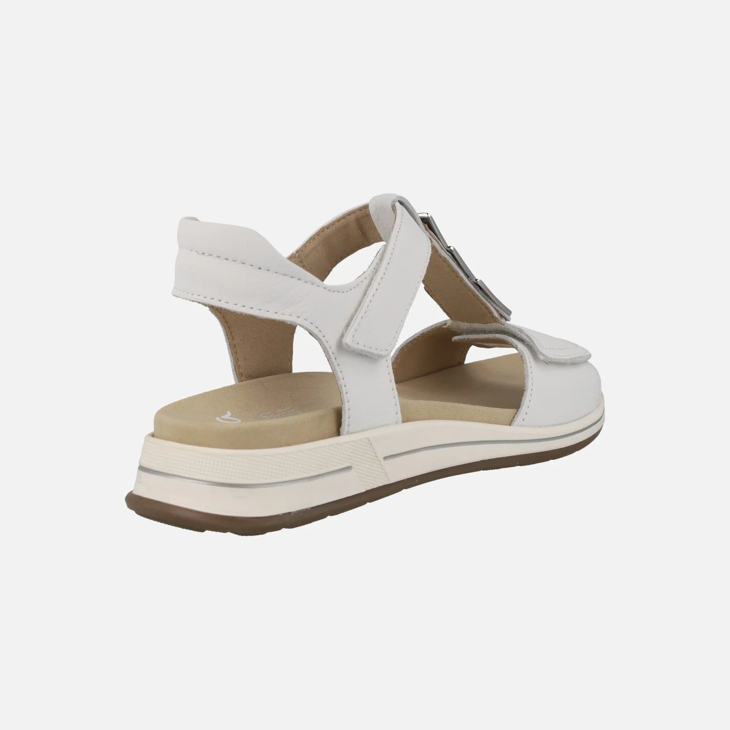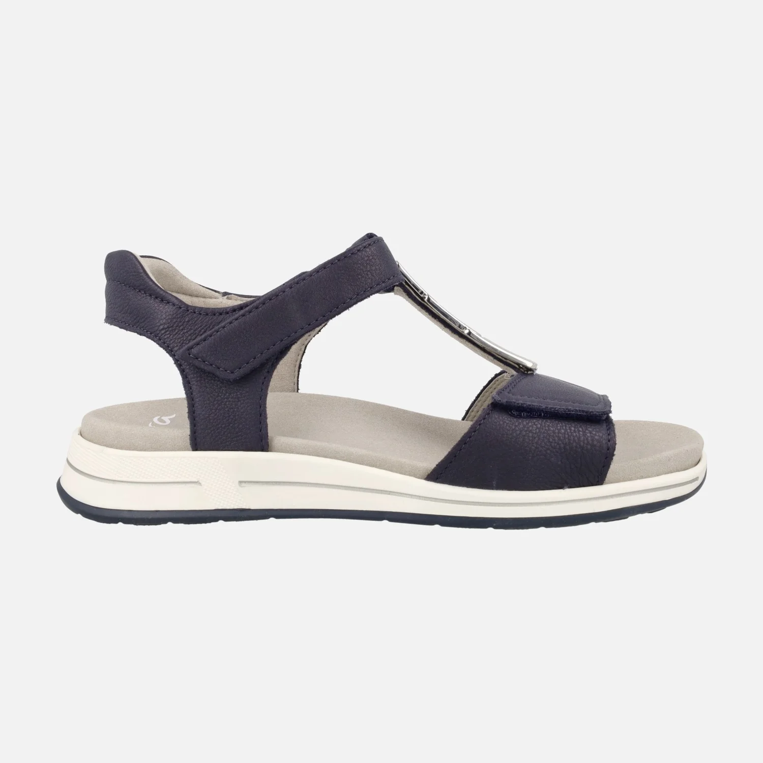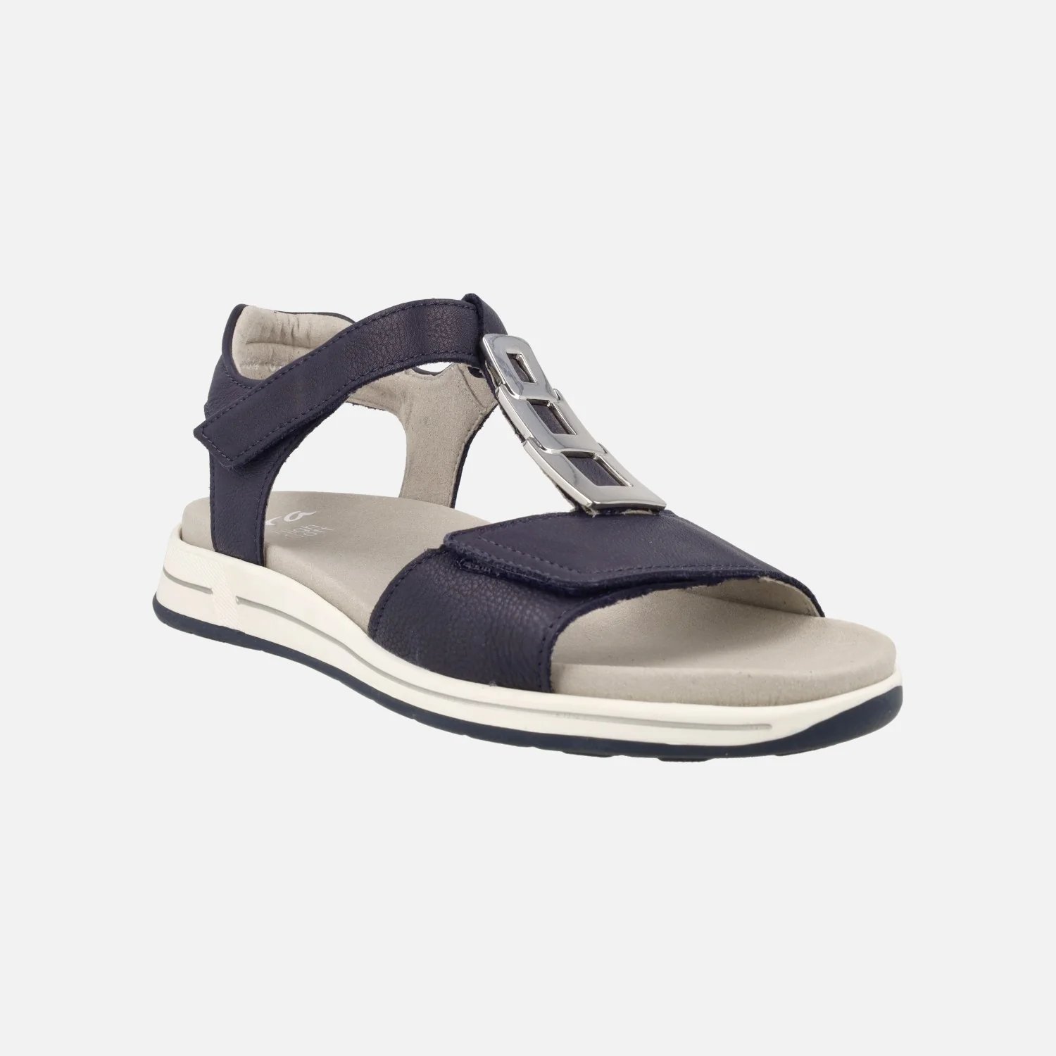 Sandalias confort para mujer de la marca Ara, modelo 1234804, disponibles en blanco y en azul. Sandalias de piel con cierre de velcros, en la parte delantera y al tobillo. Adorno metálico en el empeine. Interior textil con plantillas extraíbles. Piso de goma con 3 cm de altura trasera (1,5 cm parte delantera).
