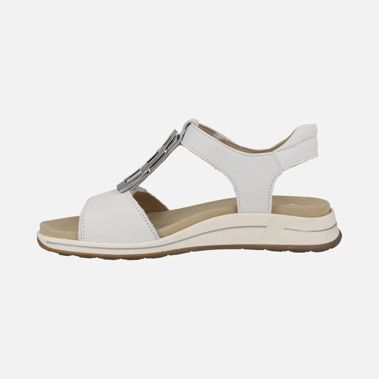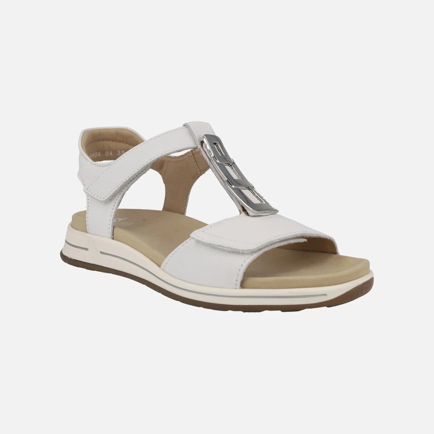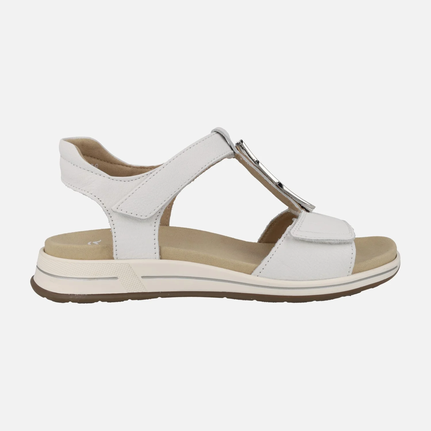 Sandalias confort para mujer de la marca Ara, modelo 1234804, disponibles en blanco y en azul. Sandalias de piel con cierre de velcros, en la parte delantera y al tobillo. Adorno metálico en el empeine. Interior textil con plantillas extraíbles. Piso de goma con 3 cm de altura trasera (1,5 cm parte delantera).