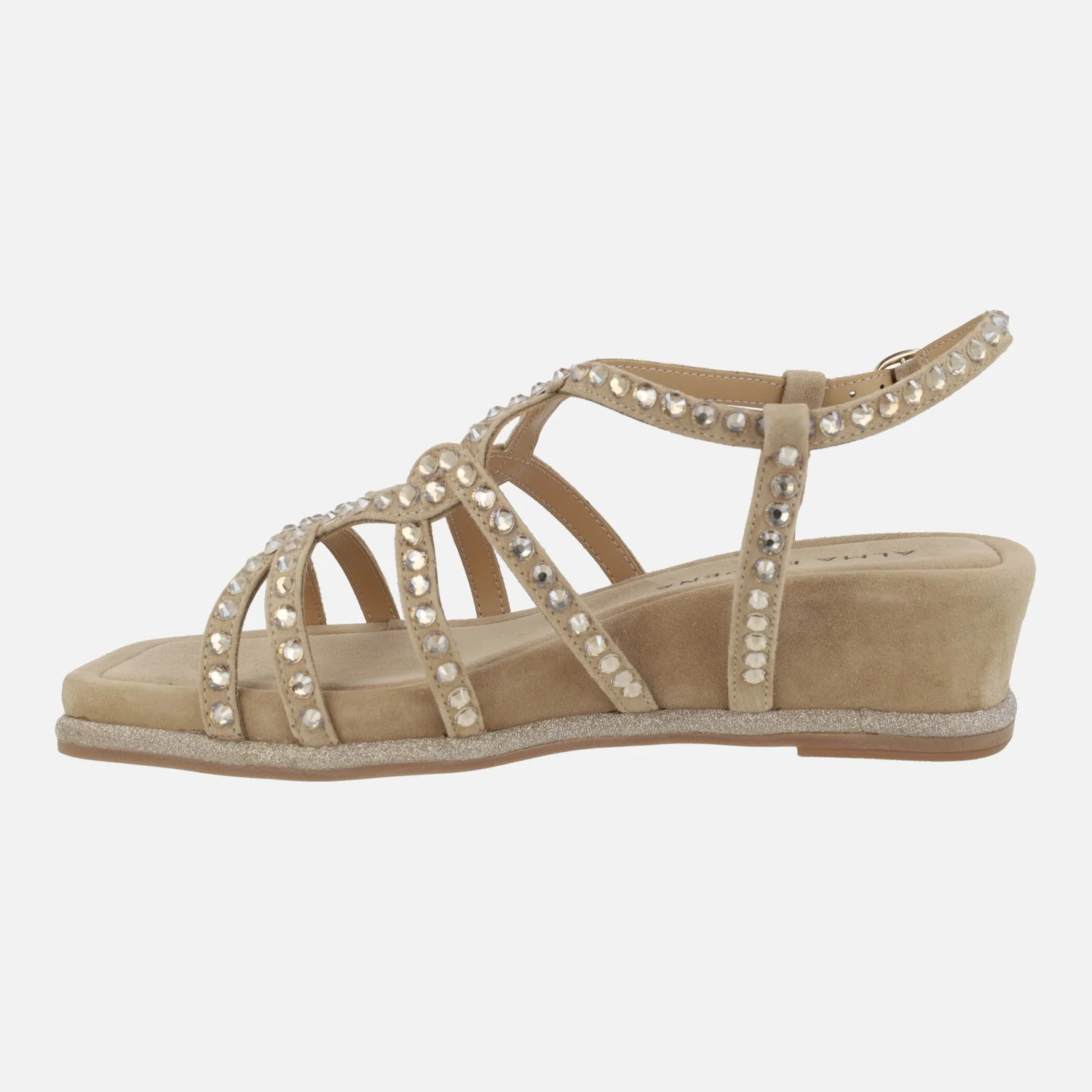 Preciosas sandalias joya de la marca Alma en Pena modelo V251752 Sand. Sandalias de piel ante color beige con detalle de cobertura de strass en las tiras. Cierre con hebilla dorada ajustable al tobillo. Cuña de 5 cms de altura trasera (2 cms parte delantera). Suela sintética con detalle de brillo.