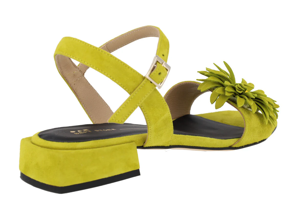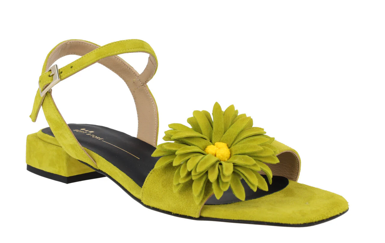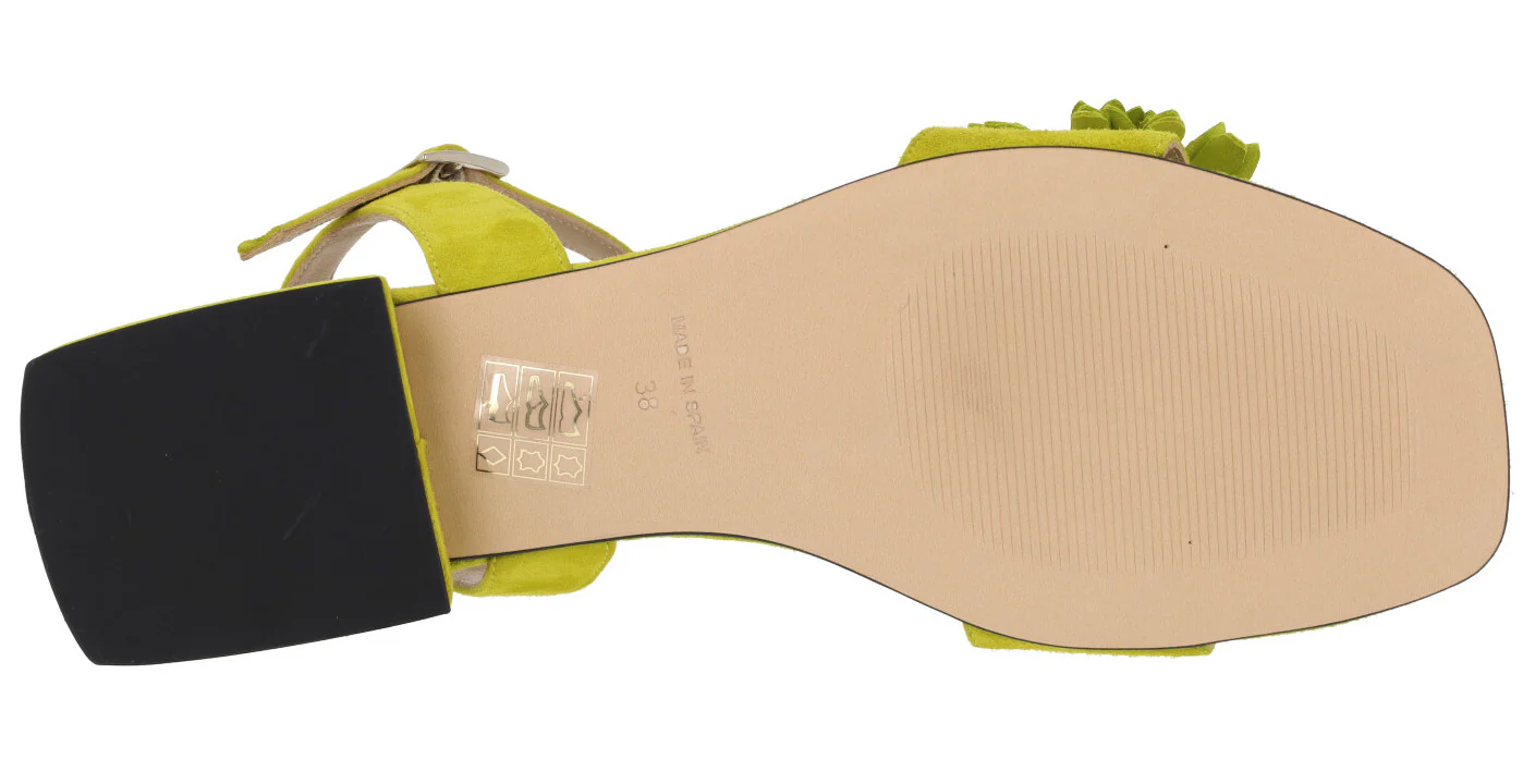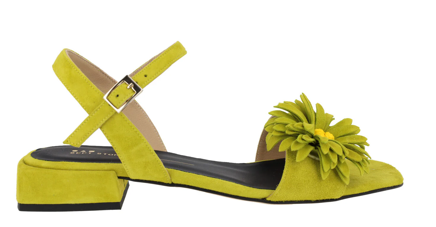 Preciosas sandalias de ante de la marca Sept Store, modelo 23136, disponible en Pistacho y en Lincolin. Sandalias de ante con adorno de flor al tono, disponibles en color pistacho (lima) y en Lincolin (camel), ambas flores llevan detalle de «polen» en amarillo. Cierre al tobillo con hebilla. Forro y planta de piel. Tacones cuadrados, bajos, de apenas 3 cms de altura. Made in SPain.