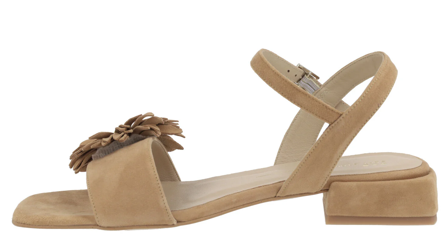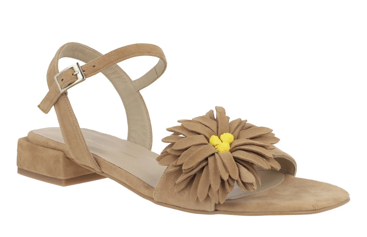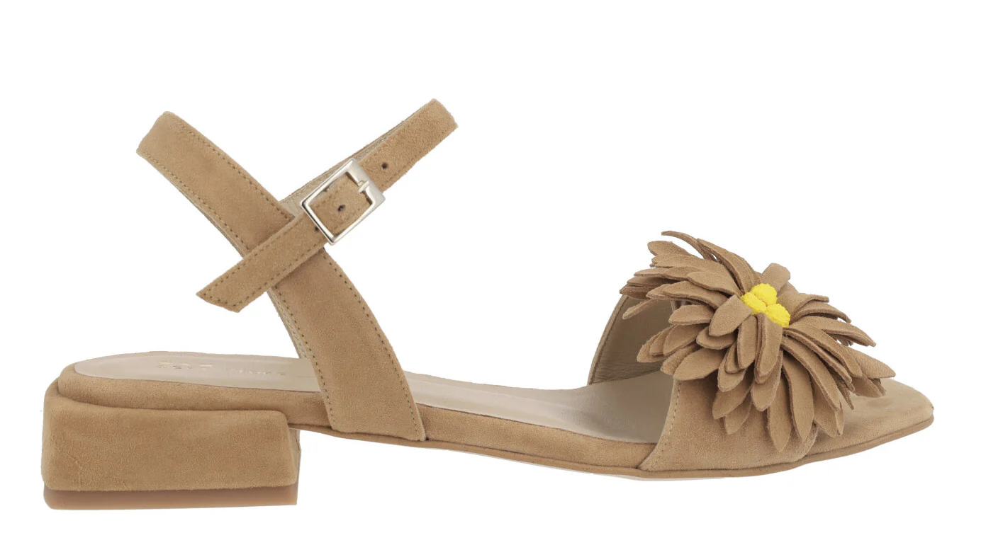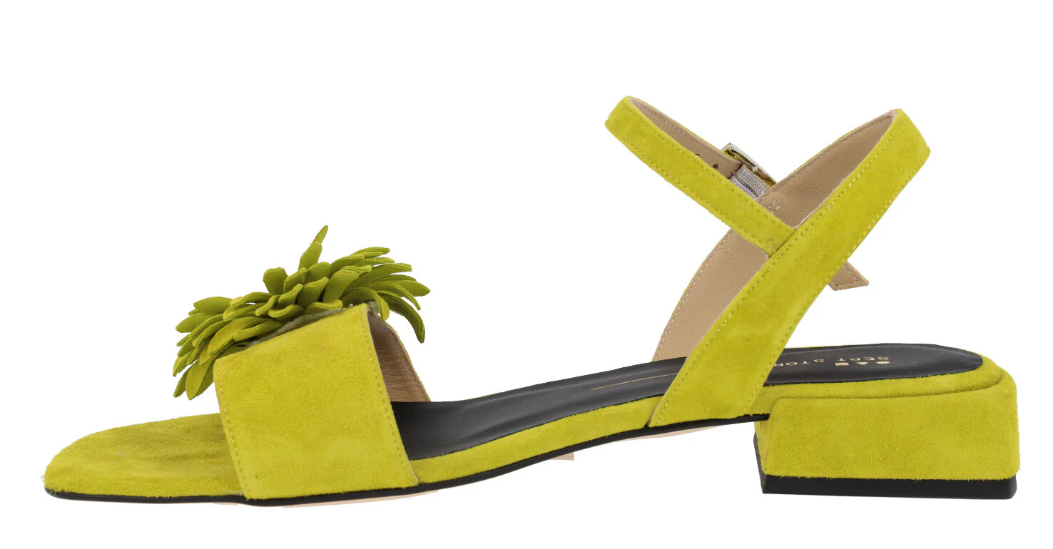 Preciosas sandalias de ante de la marca Sept Store, modelo 23136, disponible en Pistacho y en Lincolin. Sandalias de ante con adorno de flor al tono, disponibles en color pistacho (lima) y en Lincolin (camel), ambas flores llevan detalle de «polen» en amarillo. Cierre al tobillo con hebilla. Forro y planta de piel. Tacones cuadrados, bajos, de apenas 3 cms de altura. Made in SPain.