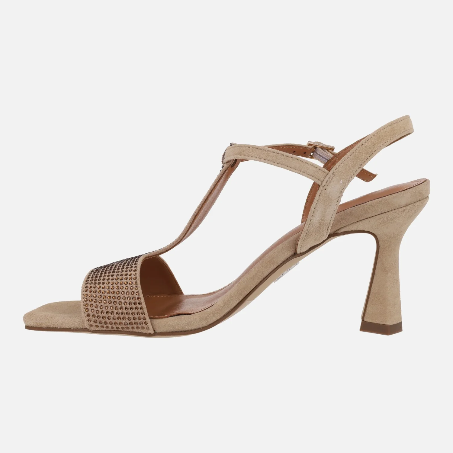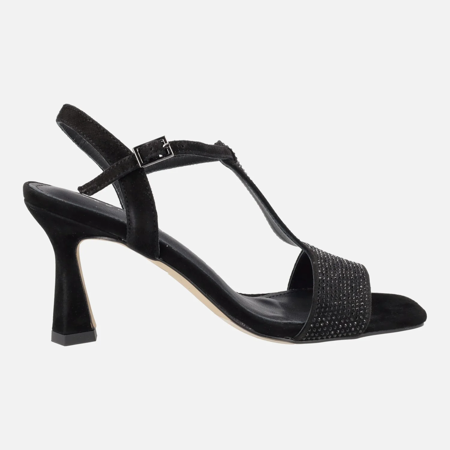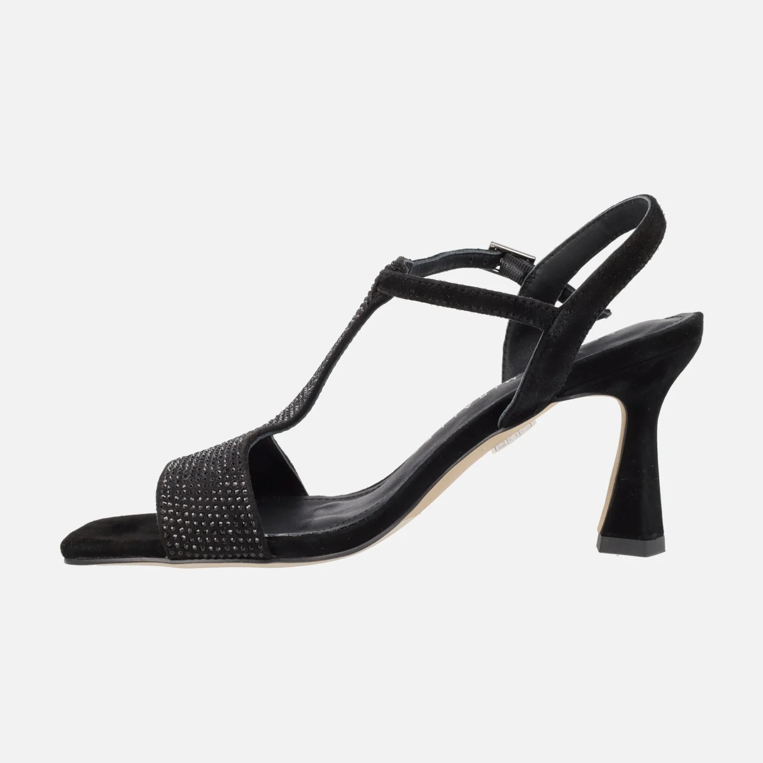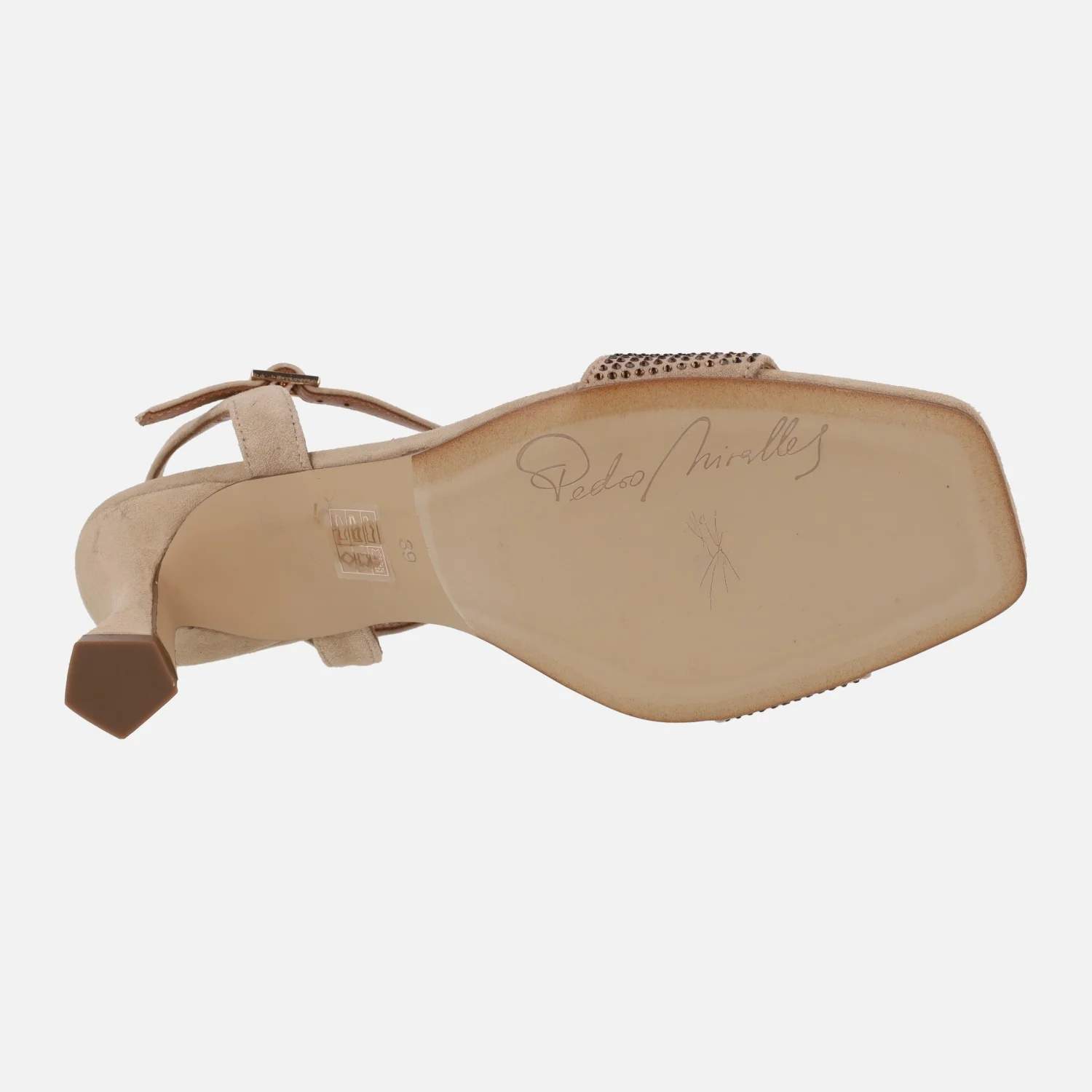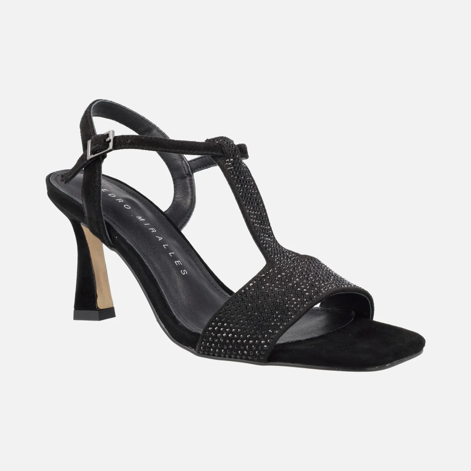 Preciosas sandalias de tacón de la marca Pedro Miralles, modelo Filipos 14415 en ante negro o ante habana. Sandalias elaboradas en ante, con cobertura de strass en la parte delantera y la pieza que cruza el empeine. Cierre de hebilla al tobillo. Interiores de piel. Tacones de 9 cms de altura. Made in Spain.