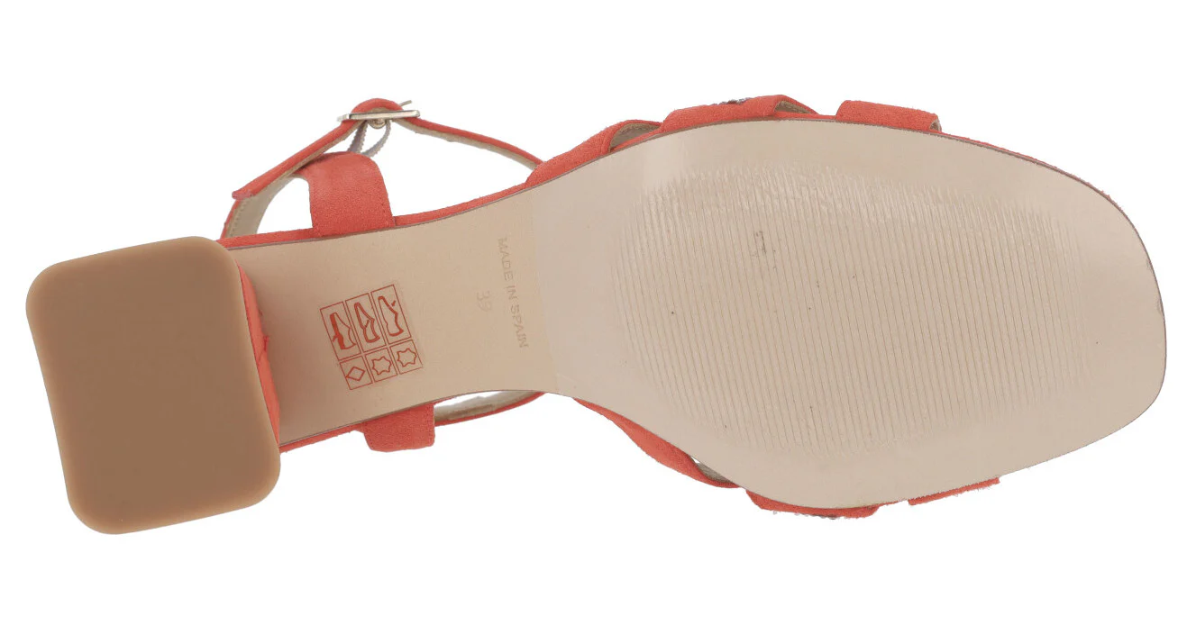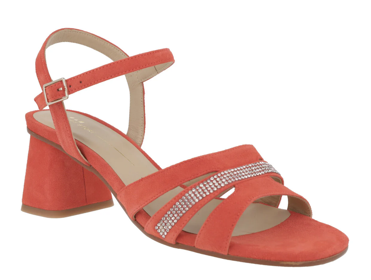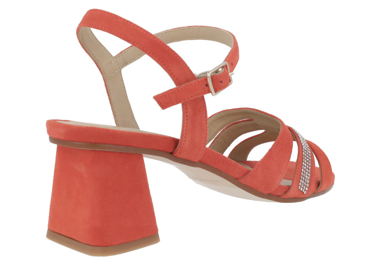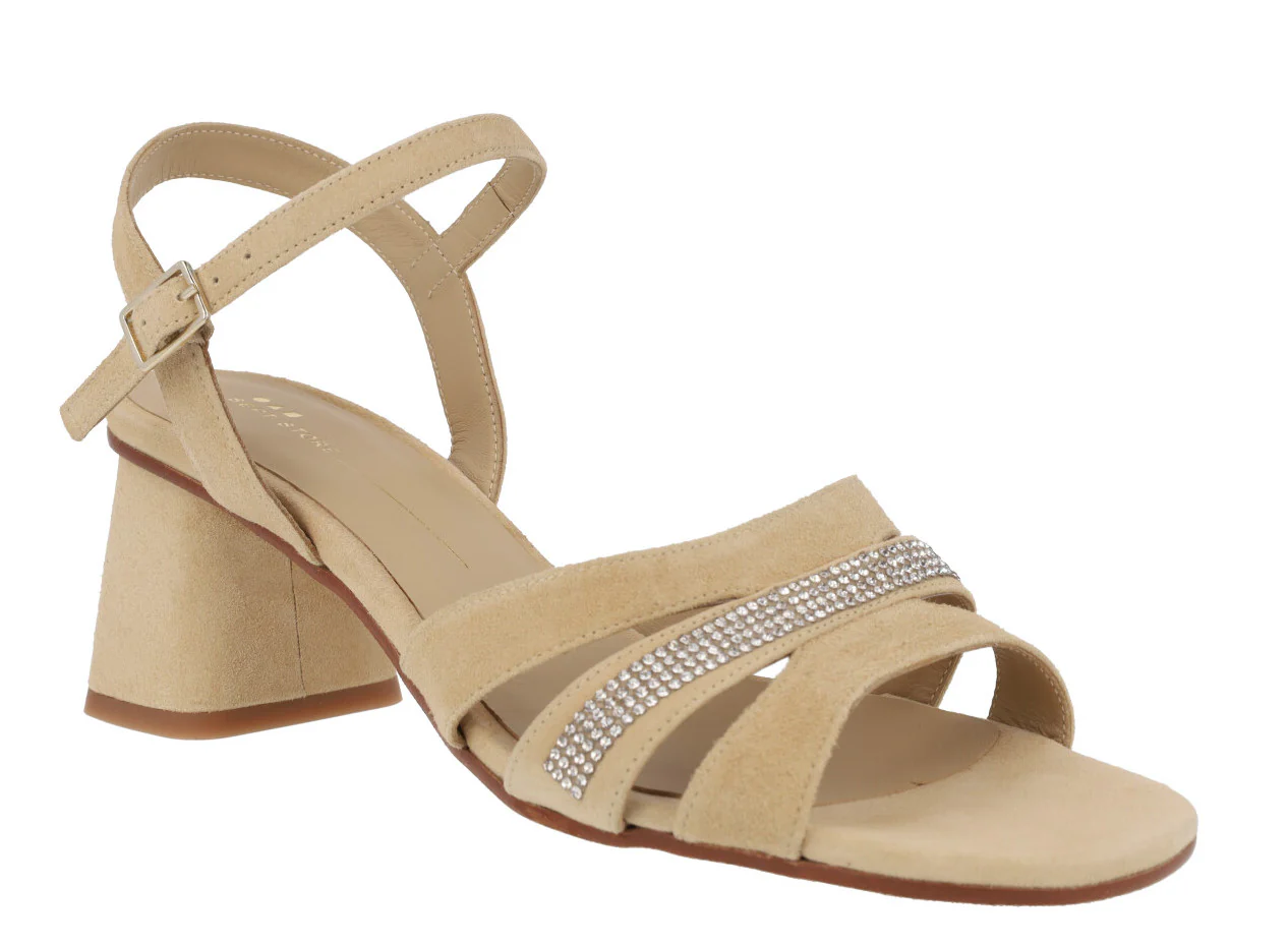 Sandalias de ante para mujer de la marca española Sept Store modelo 23-146, disponibles en color Sahara o Granadine. Elegantes sandalias elaboradas en ante color beige o coral, con detalle de tira de strass en la pala. Pulsera al tobillo con cierre de hebilla. Tacones anchos, forrados, de 7,5 cms de altura. Forro y planta de piel. Made in Spain.