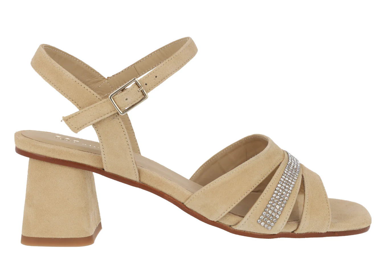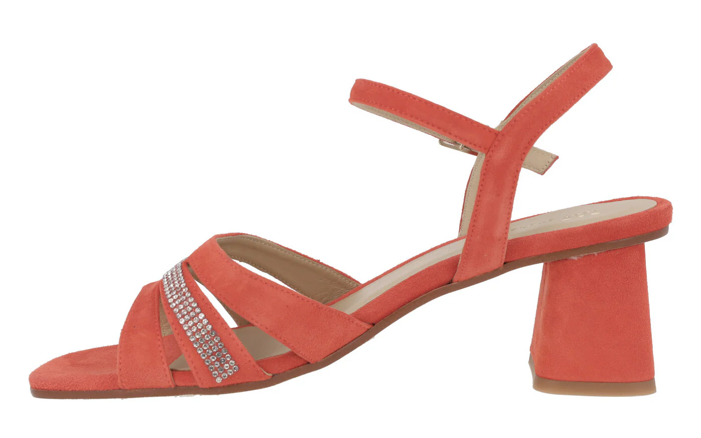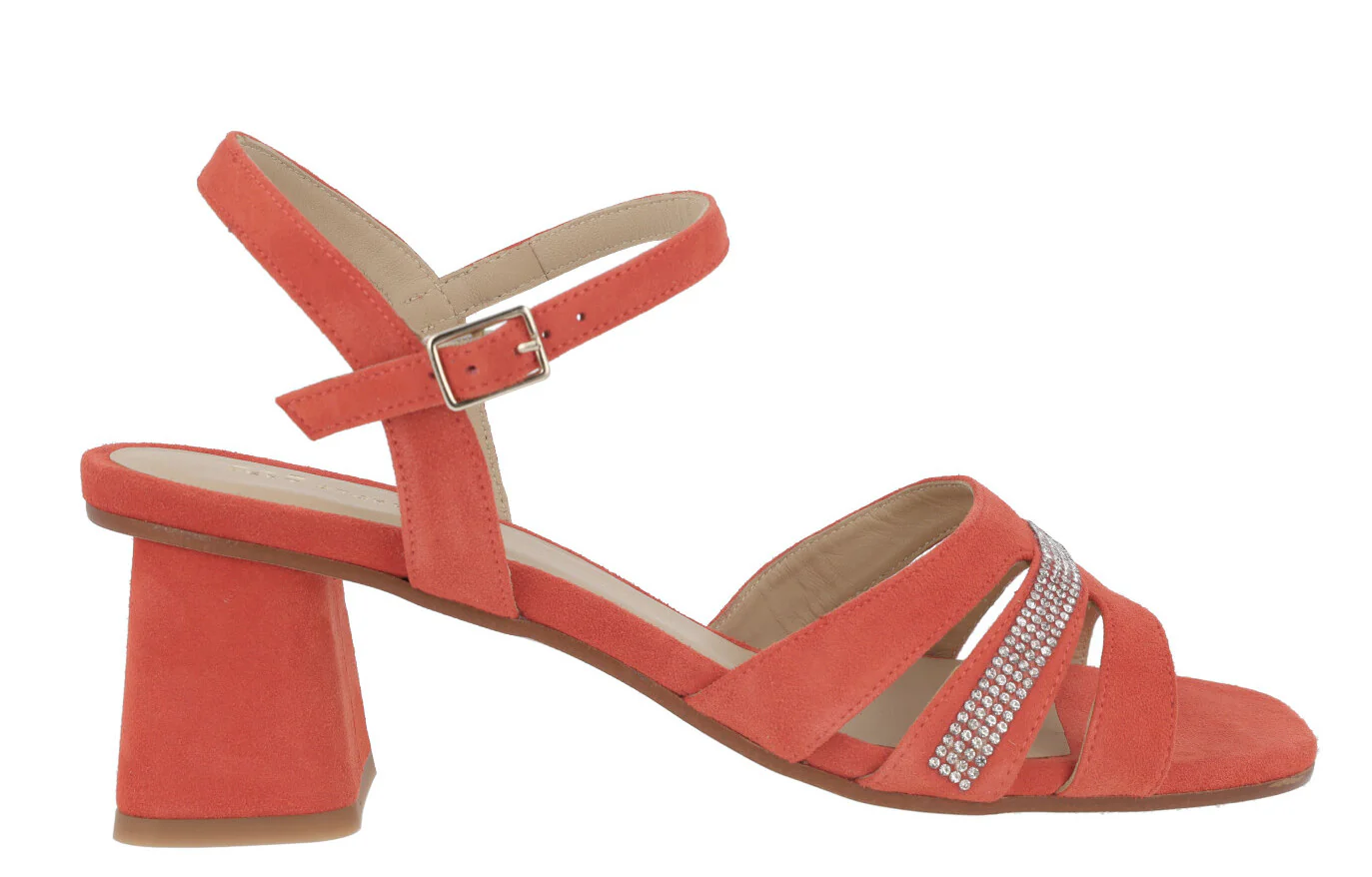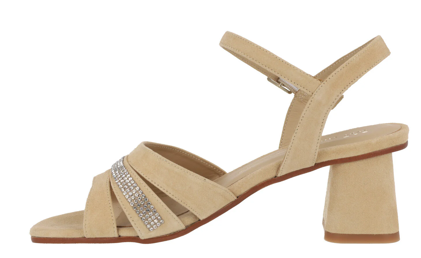 Sandalias de ante para mujer de la marca española Sept Store modelo 23-146, disponibles en color Sahara o Granadine. Elegantes sandalias elaboradas en ante color beige o coral, con detalle de tira de strass en la pala. Pulsera al tobillo con cierre de hebilla. Tacones anchos, forrados, de 7,5 cms de altura. Forro y planta de piel. Made in Spain.