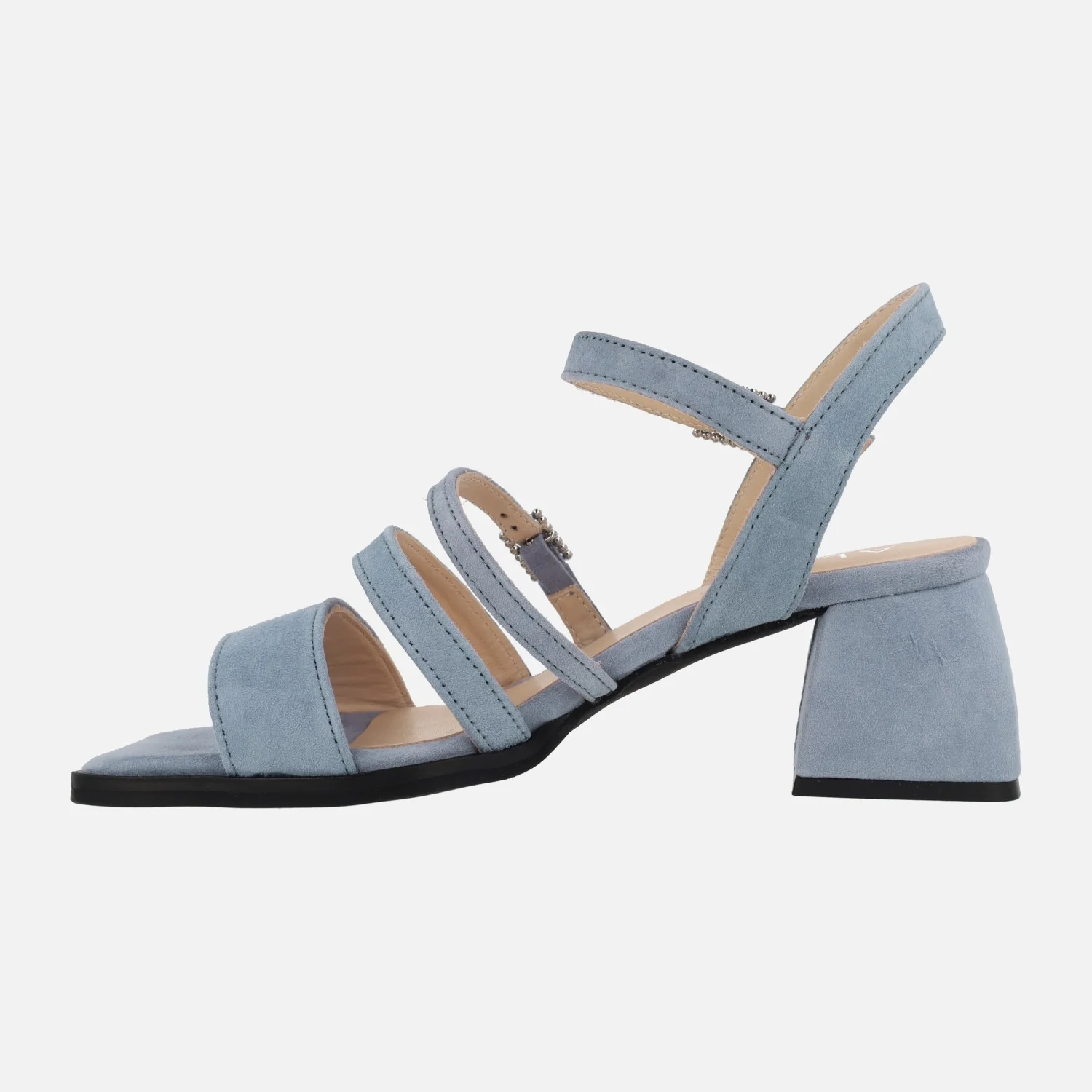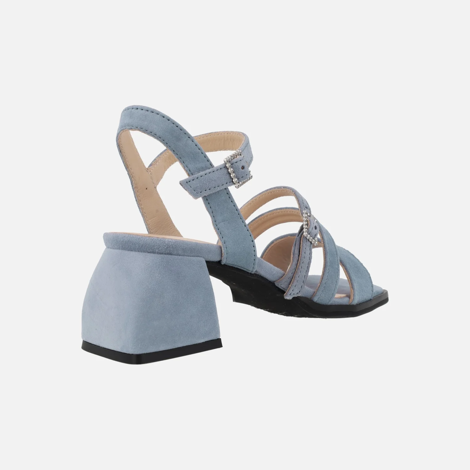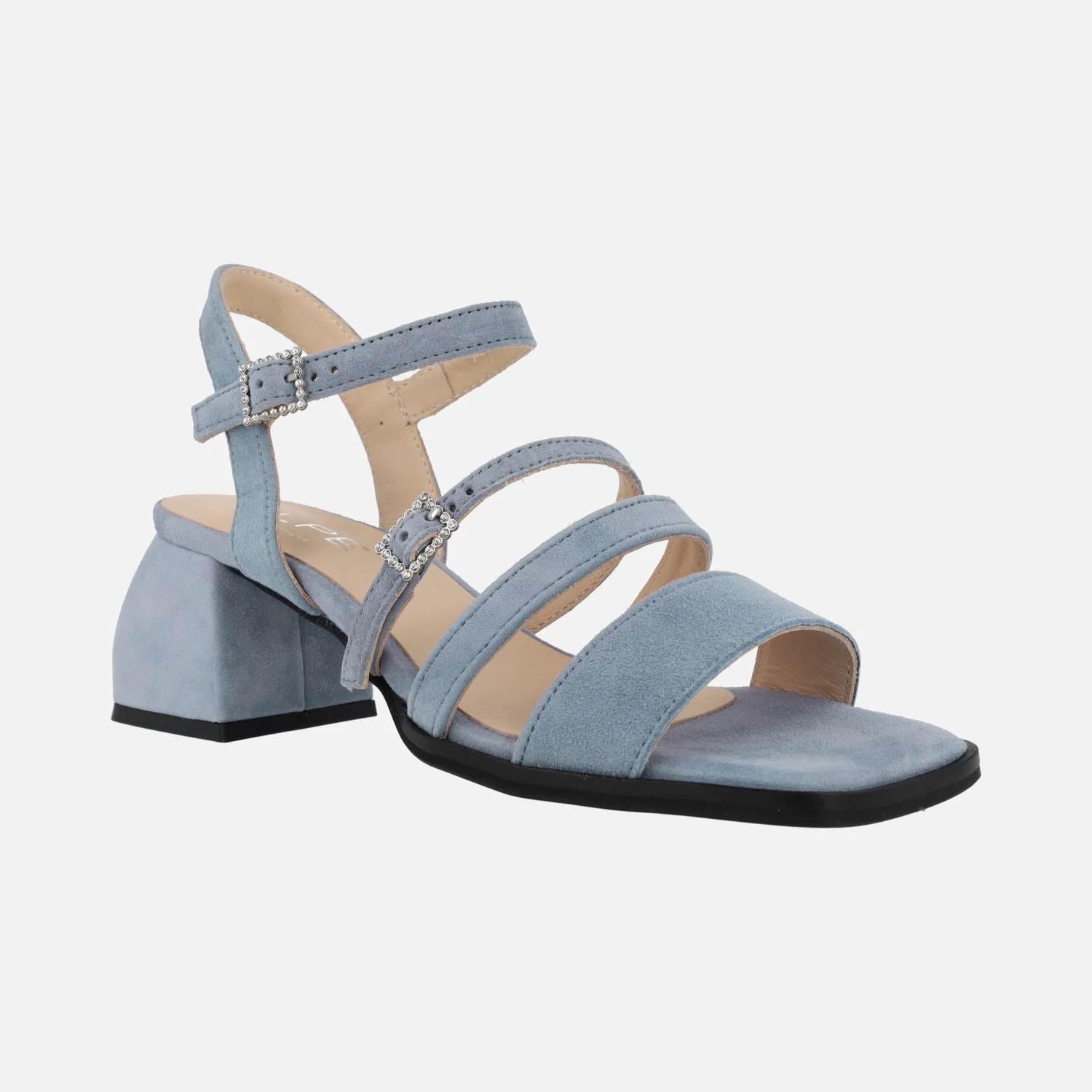 Sandalias de ante Alpe Dolly 5137, disponibles en tejano (azul celeste) y nude. Sandalias de tiras, dos de ellas ajustables gracias a sus hebillas. Interior textil. Tacones anchos forrados de ante, con 6,5 cms de altura. Made in Spain.
