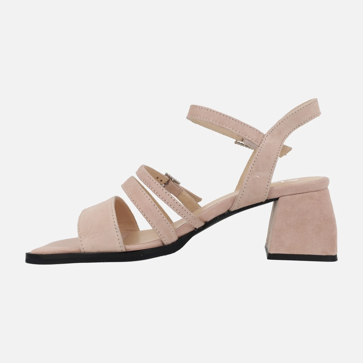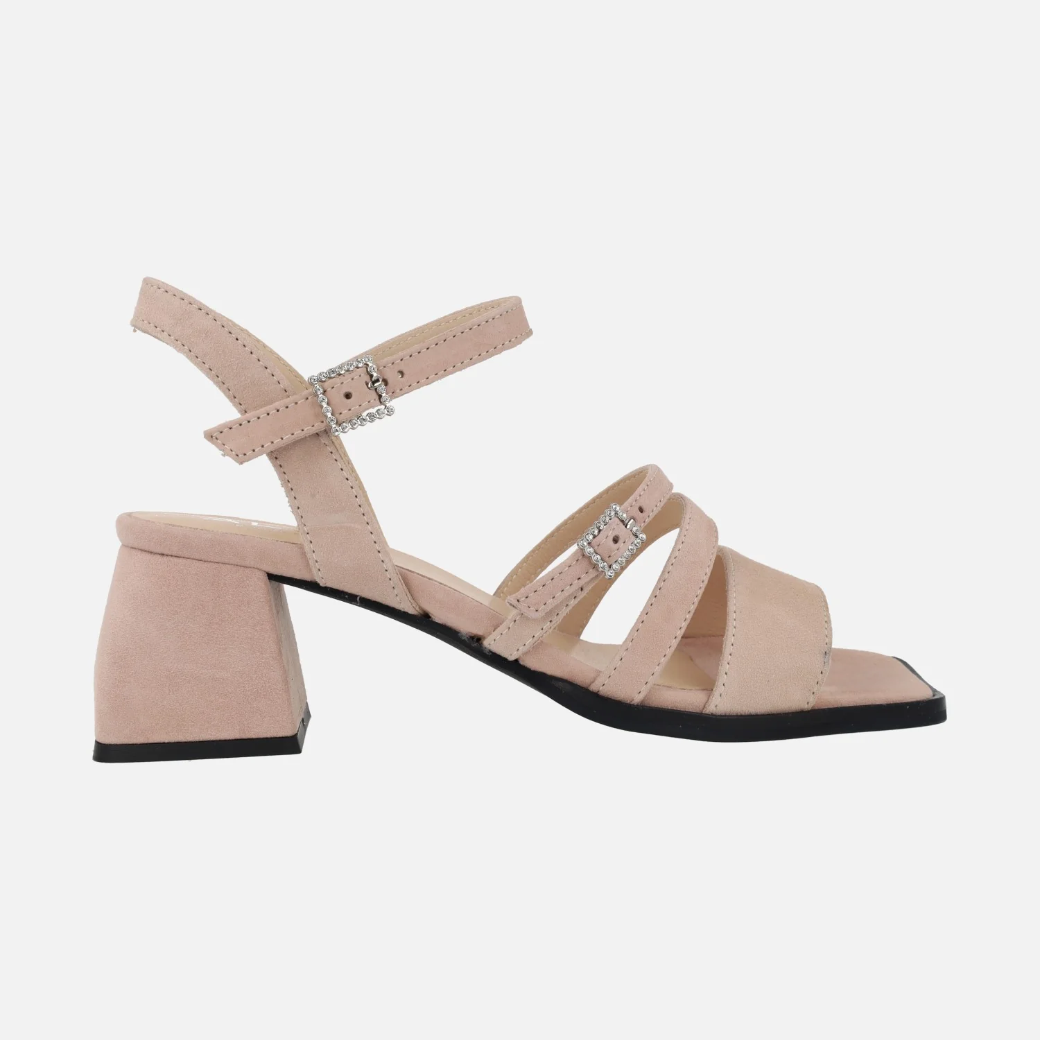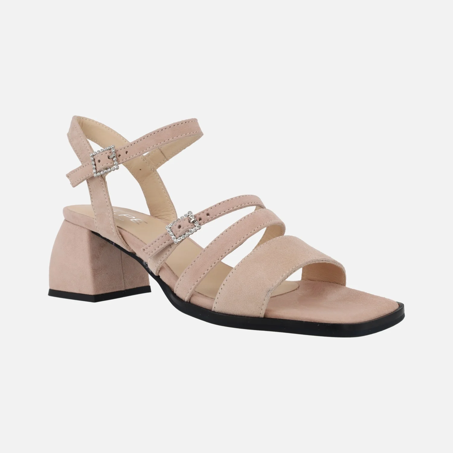 Sandalias de ante Alpe Dolly 5137, disponibles en tejano (azul celeste) y nude. Sandalias de tiras, dos de ellas ajustables gracias a sus hebillas. Interior textil. Tacones anchos forrados de ante, con 6,5 cms de altura. Made in Spain.