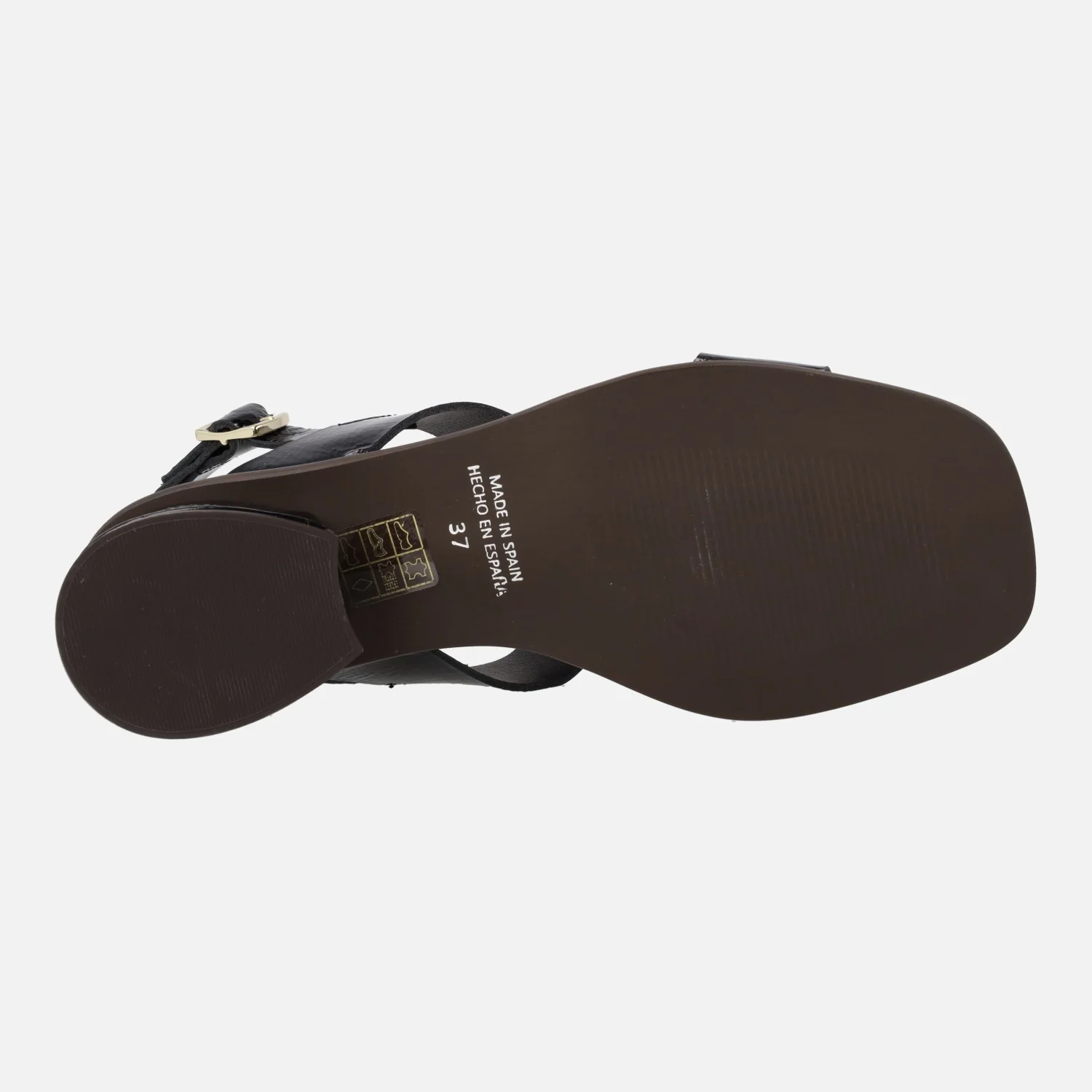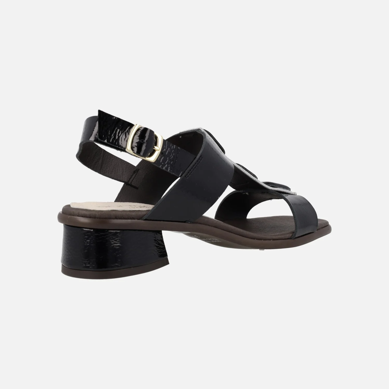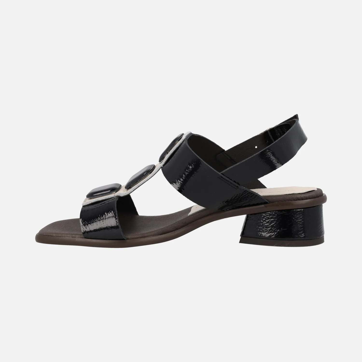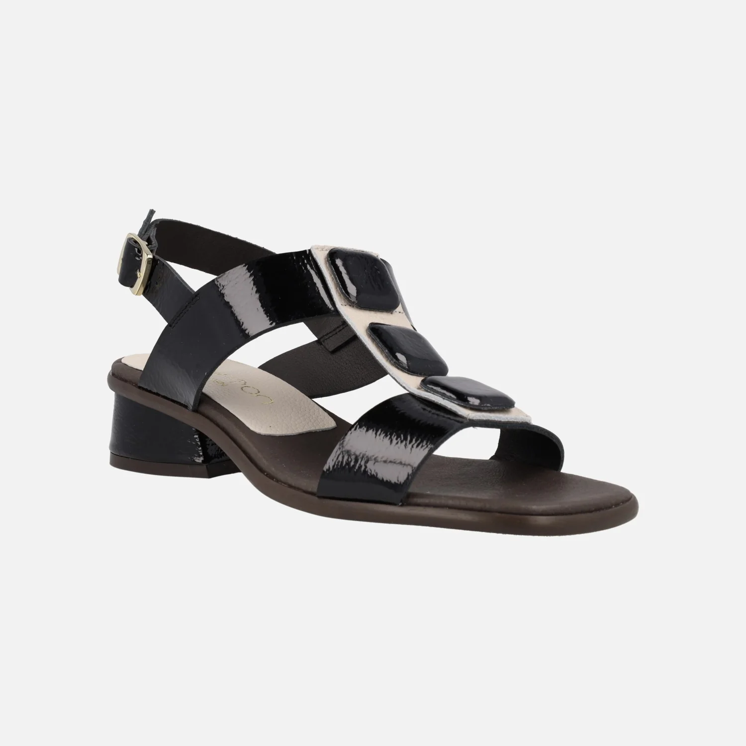 Sandalias de piel charol color negro marca Barminton modelo 12540. Sandalias de tacón bajo, elaboradas en charol negro, con detalles en beige y adorno de 3 botones cuadrados en la parte delantera. Tira al talón con cierre de hebilla. Interior mixto de piel y tejido. Piso sintético, con tacones anchos de 4 cms de altura. Made in Spain.