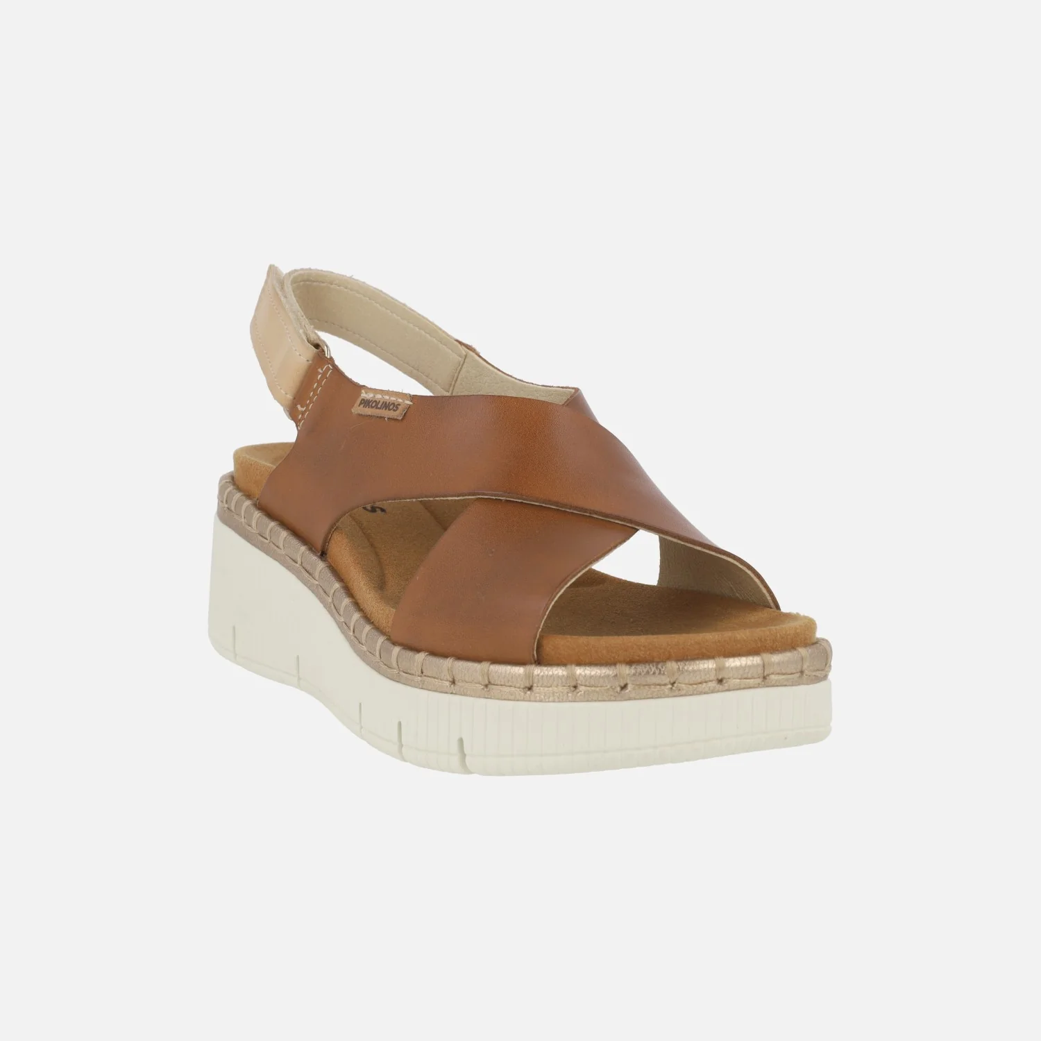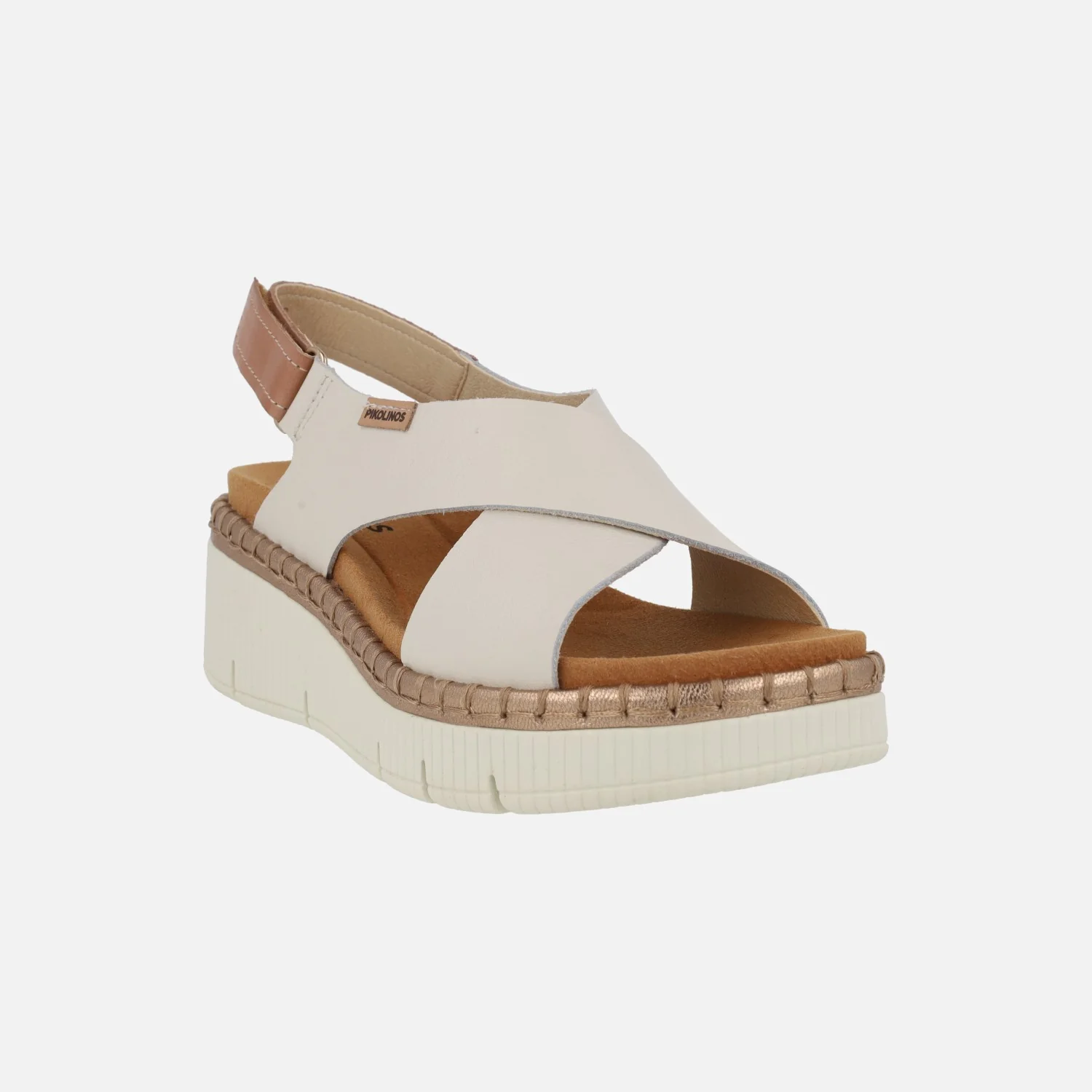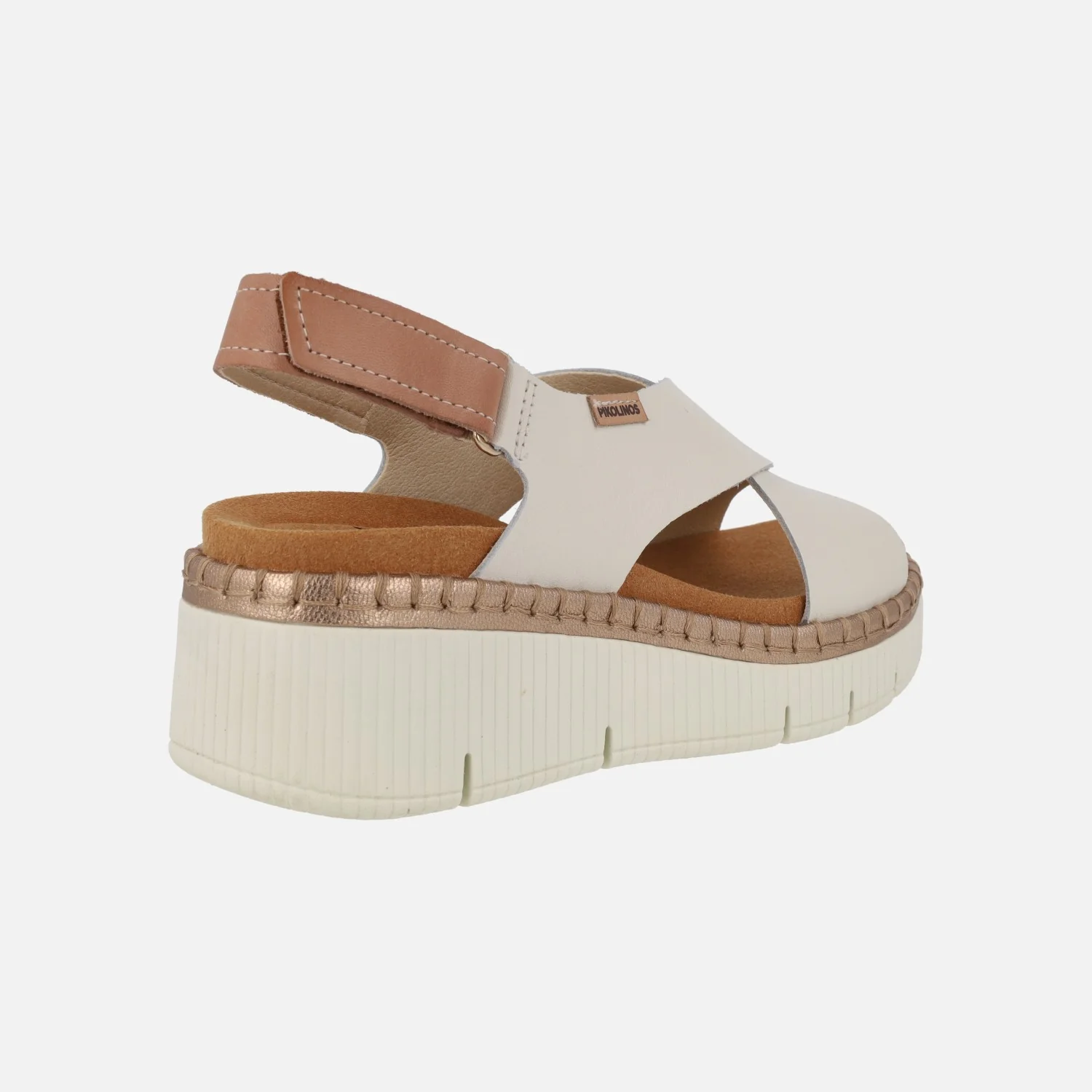 Sandalias de piel para mujer de la marca Pikolinos, modelo Gomera W0K-0606C1, disponibles en combinado nata (hielo) y brandy (cuero). Sandalias de piel con tira al talón y cierre de velcro ajustable. Interiores en tejido combinado con sintéticos. Cuña extra ligera, de 6 cm de altura en la parte de atrás (4 cm aproximadamente de plataforma delantera).
