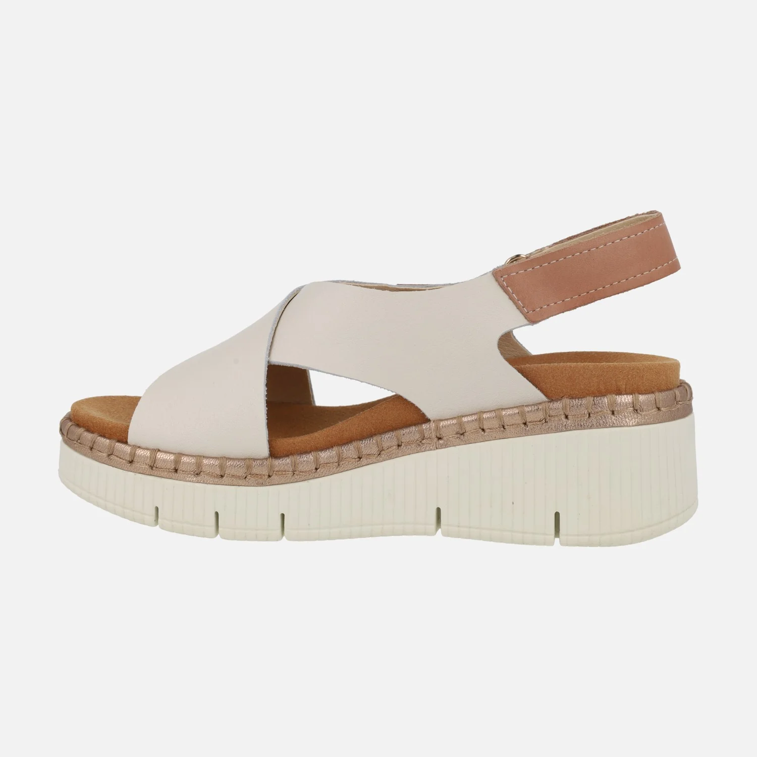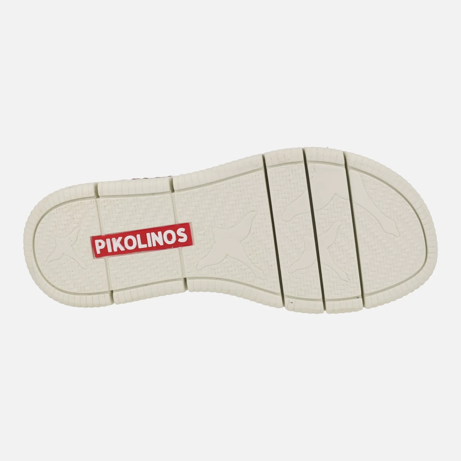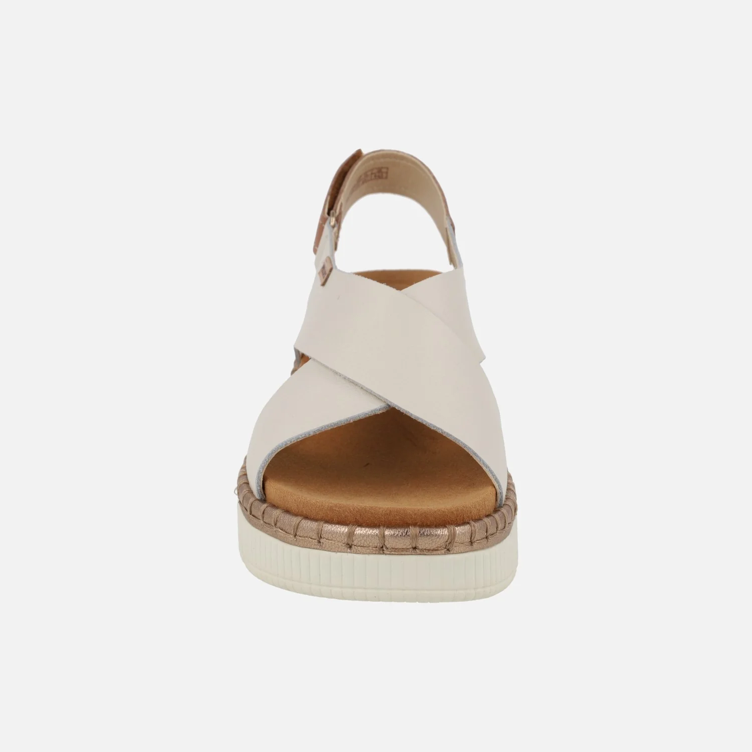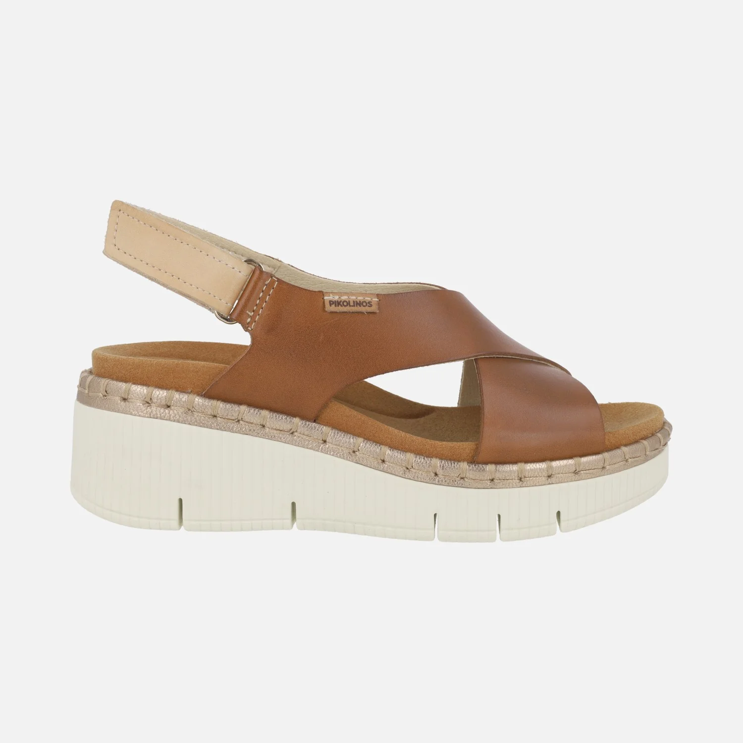 Sandalias de piel para mujer de la marca Pikolinos, modelo Gomera W0K-0606C1, disponibles en combinado nata (hielo) y brandy (cuero). Sandalias de piel con tira al talón y cierre de velcro ajustable. Interiores en tejido combinado con sintéticos. Cuña extra ligera, de 6 cm de altura en la parte de atrás (4 cm aproximadamente de plataforma delantera).