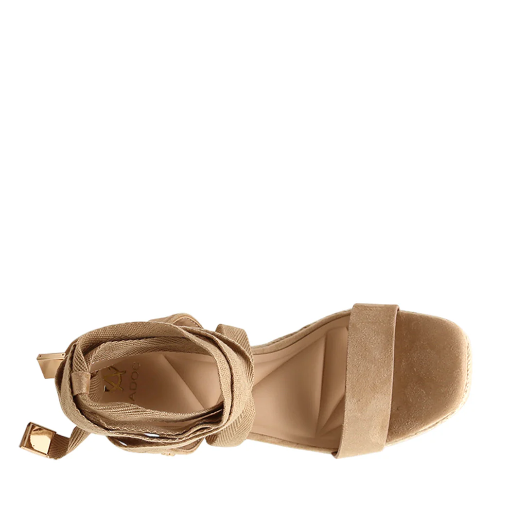 Sandalias de cuña Emilia para mujer color arena, altura 10.5 cm, material sintético. Silueta de impacto con acabado neutro que equilibra altura y versatilidad.