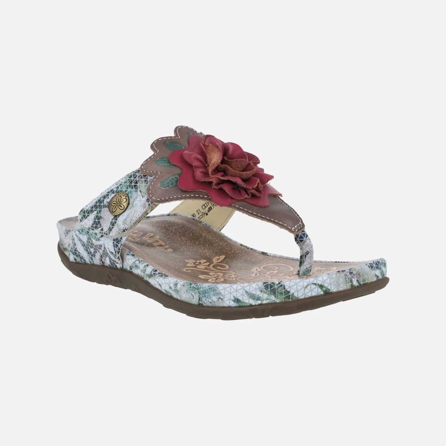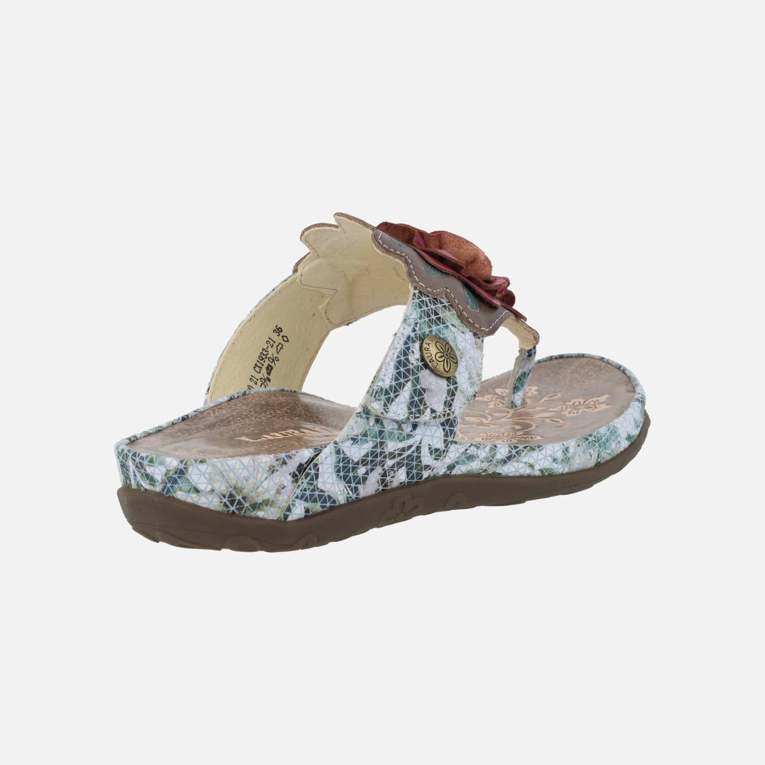 Sandalias para mujer de la marca Laura Vita modelo Liloo 21 gris. Sandalias con estampado, elaboradas en combinado de piel y tejido. Sandalias para dedo, estilo esclavas. Detalle de flor en la pala. Cierre de velcro. Piso de goma, con una altura trasera de 3,5 cms (2 cms parte delantera).