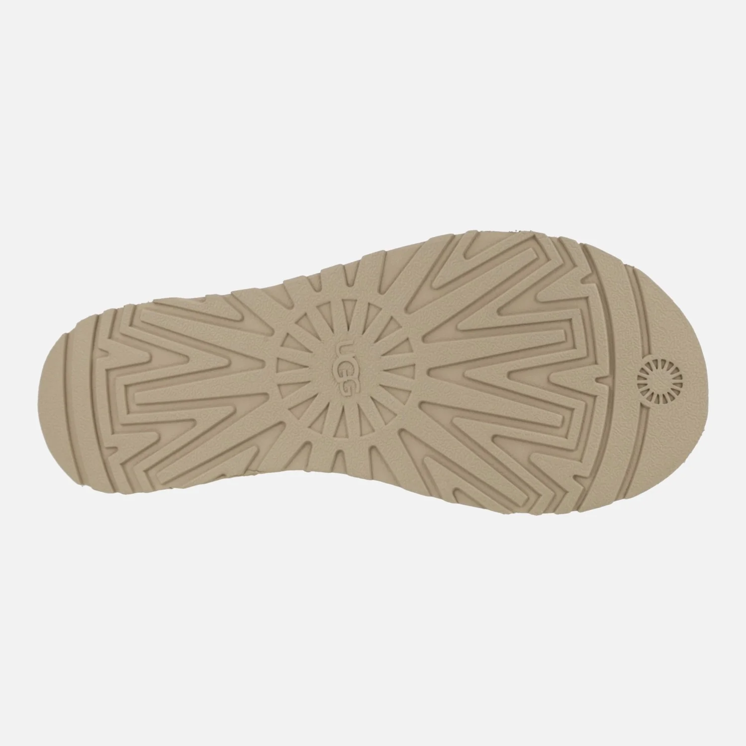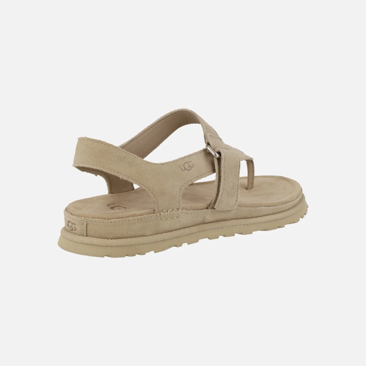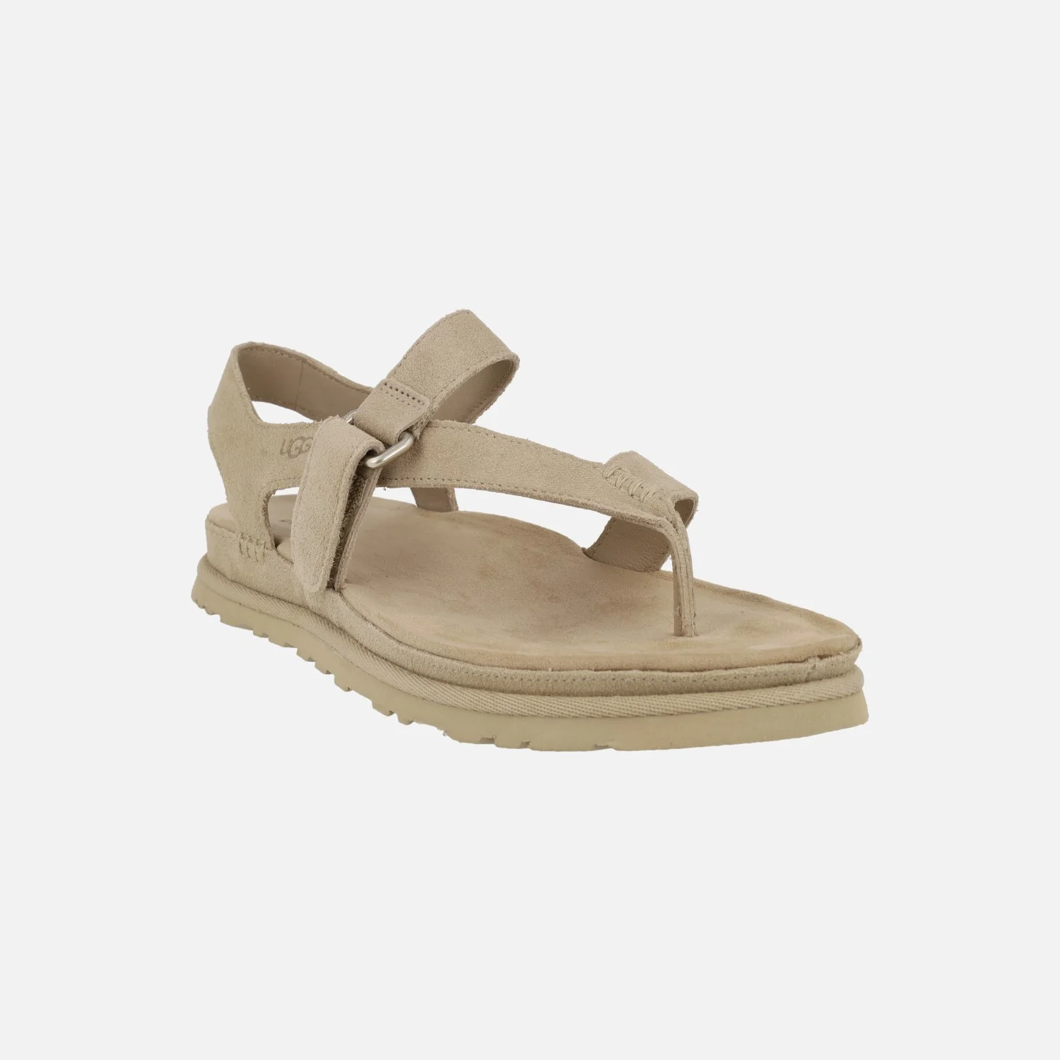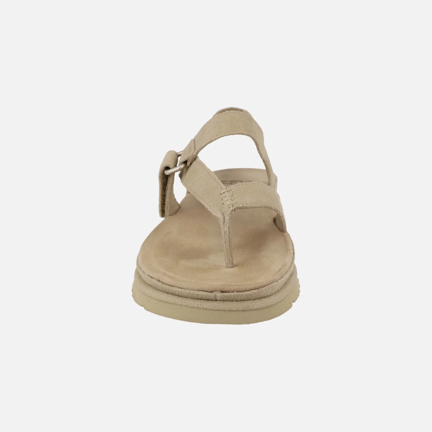 Sandalias para mujer de la marca UGG modelo Goldengaze toe post 1175134 Sand. Sandalias de ante color beige, con pieza de dedo y cierre de velcro ajustable. Interior y planta en combinado de tejido y piel. Suela de goma con una altura total junto con la plataforma de 3 cm en la parte trasera y 2,5 cm en la delantera.