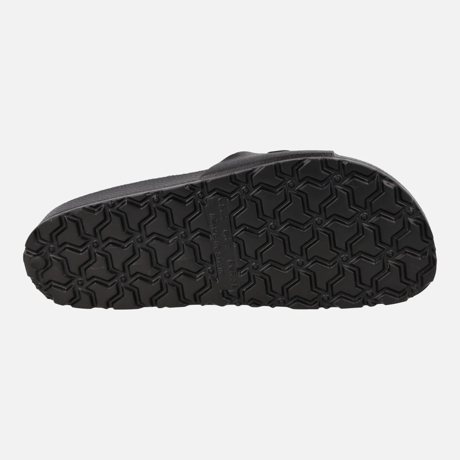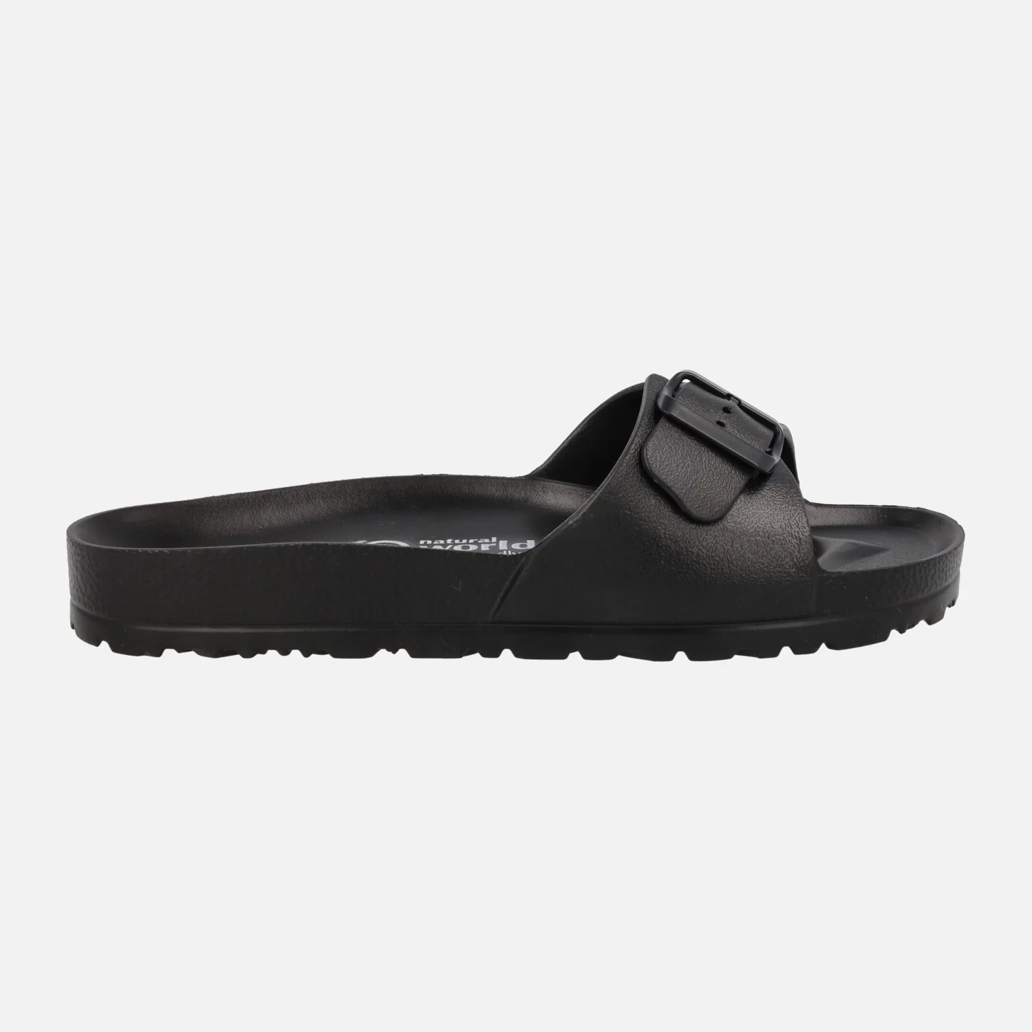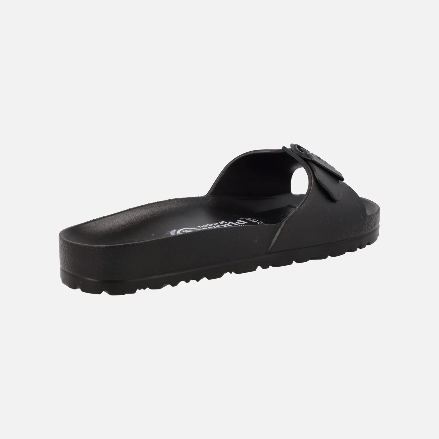 Sandalias estilo pala para mujer de la marca Natural World modelo 7054 Neli en negro. Sandalias de pala ancha con una hebilla. Fabricadas en goma EVA, muy ligeras. Ideales para la playa y la piscina. Altura total 3 cms.