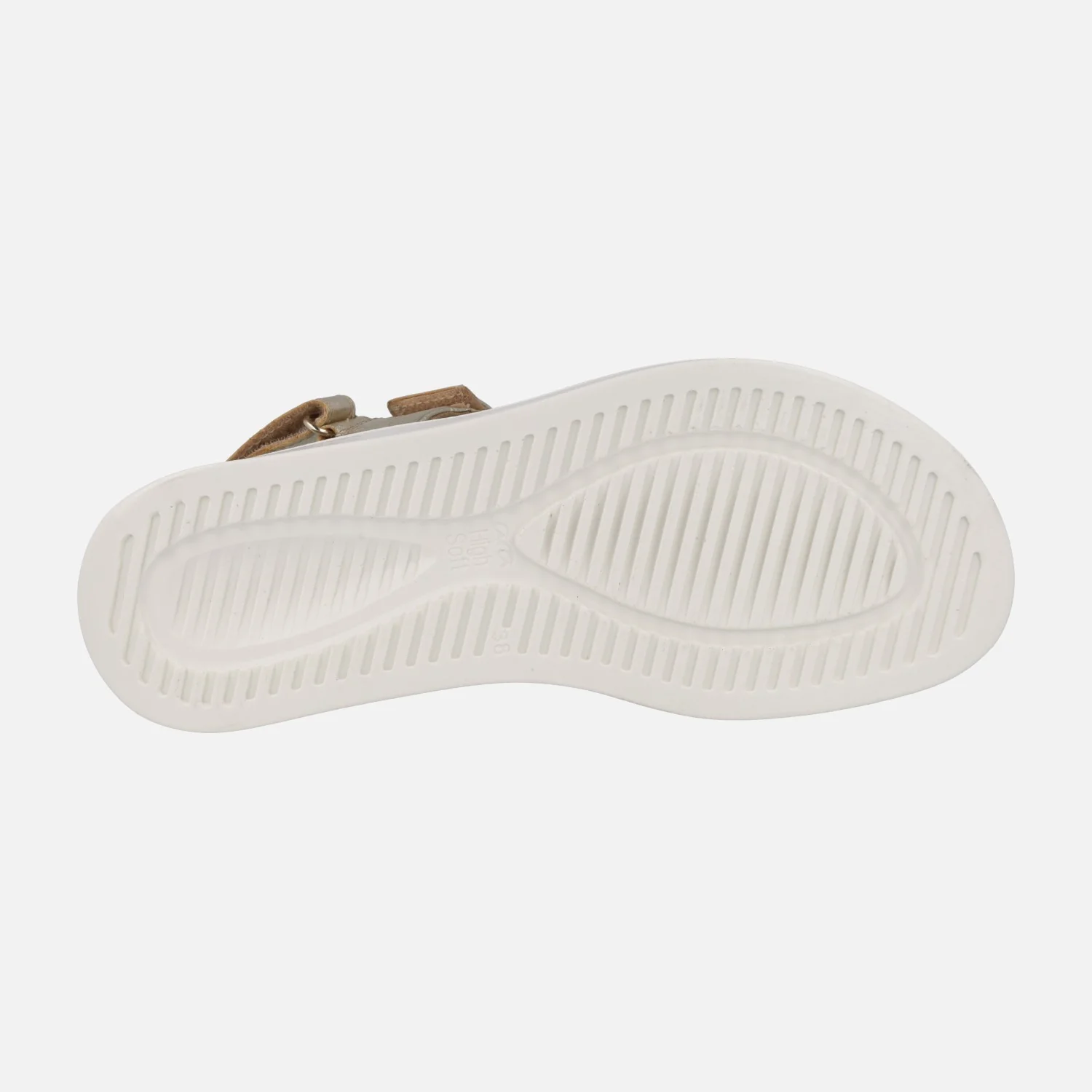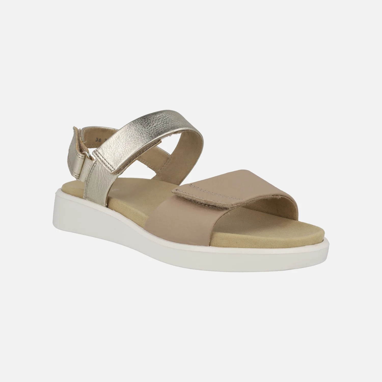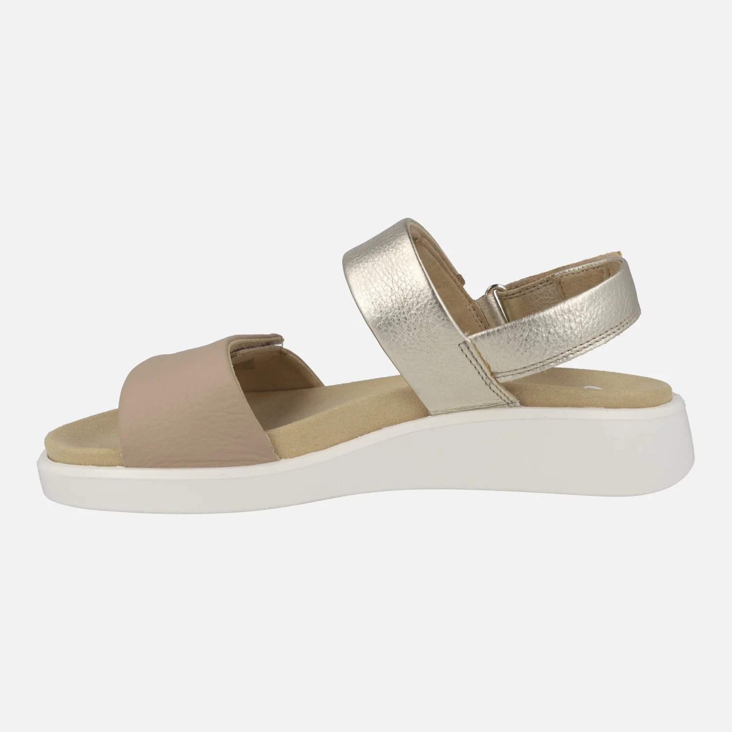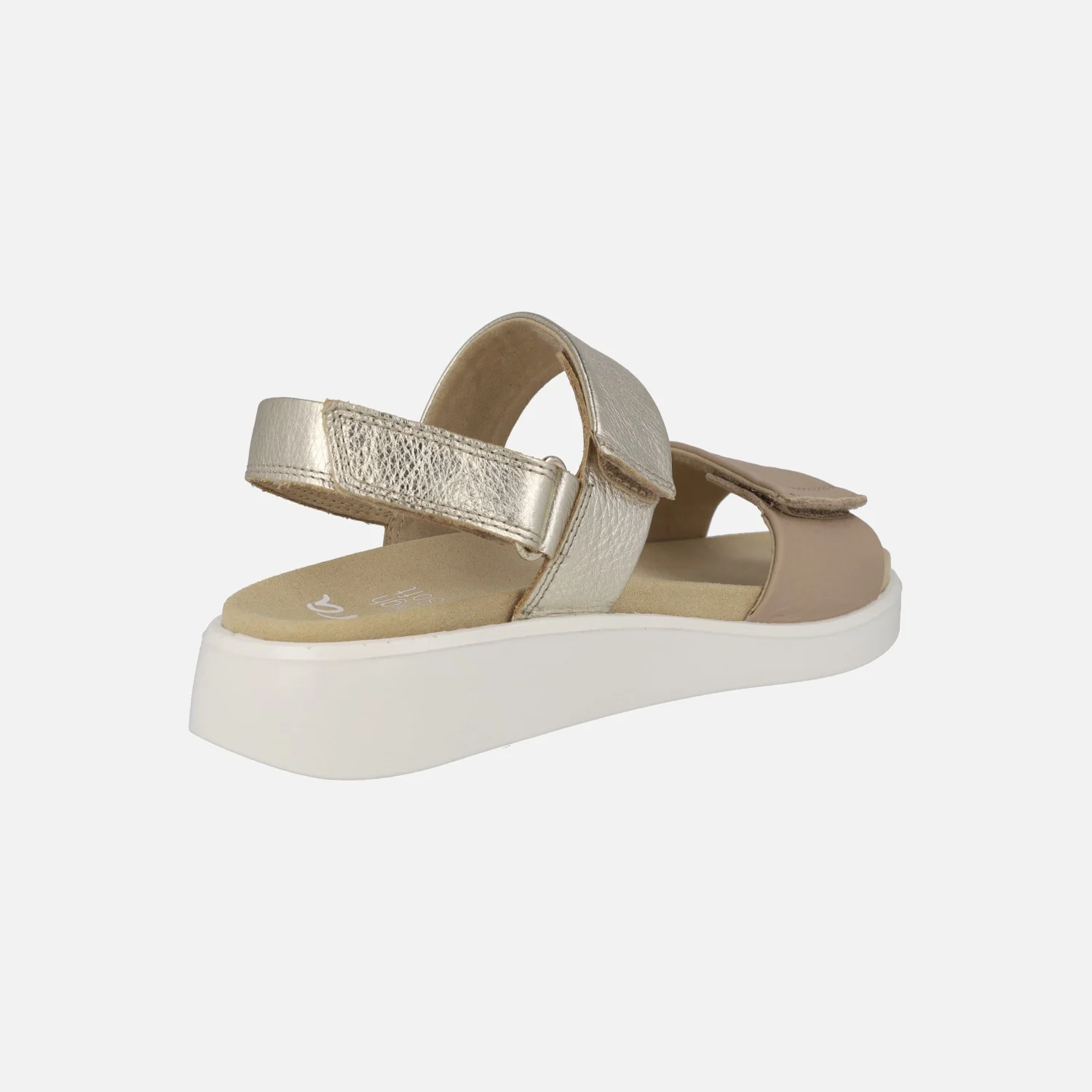 Sandalias de cuña de mujer en Piel Dorada combinada con Nobuck Taupe. Fabricadas por la marca Ara, modelo 12211401. Presenta dos tiras en la pala y otra tira en el talón. Todas abrochan con velcro. Interior y plantilla en material textil. Las plantillas son extraíbles y se fijan con un velcro al piso. El piso es de goma , con una altura de 4 cms. de altura en la parte trasera y 3 cms. en la delantera.