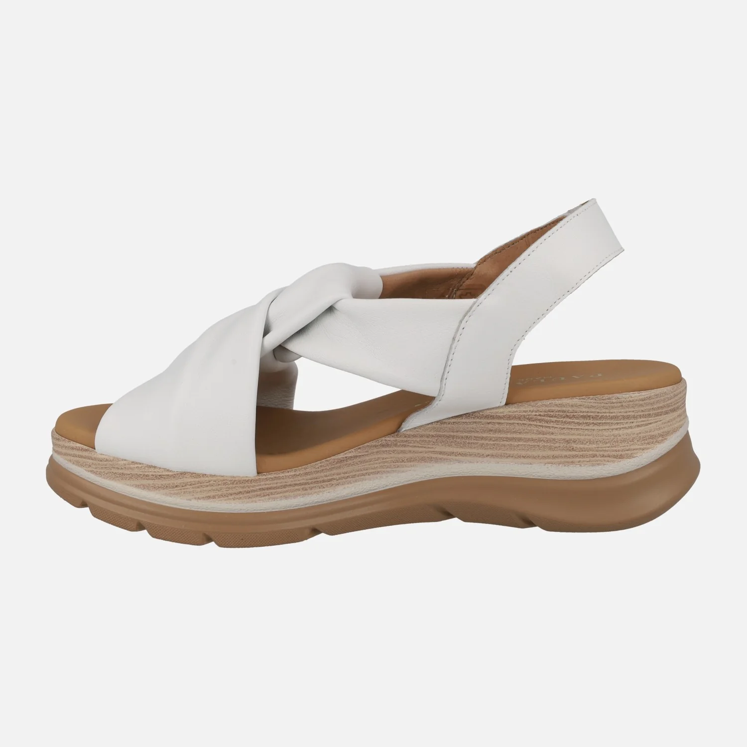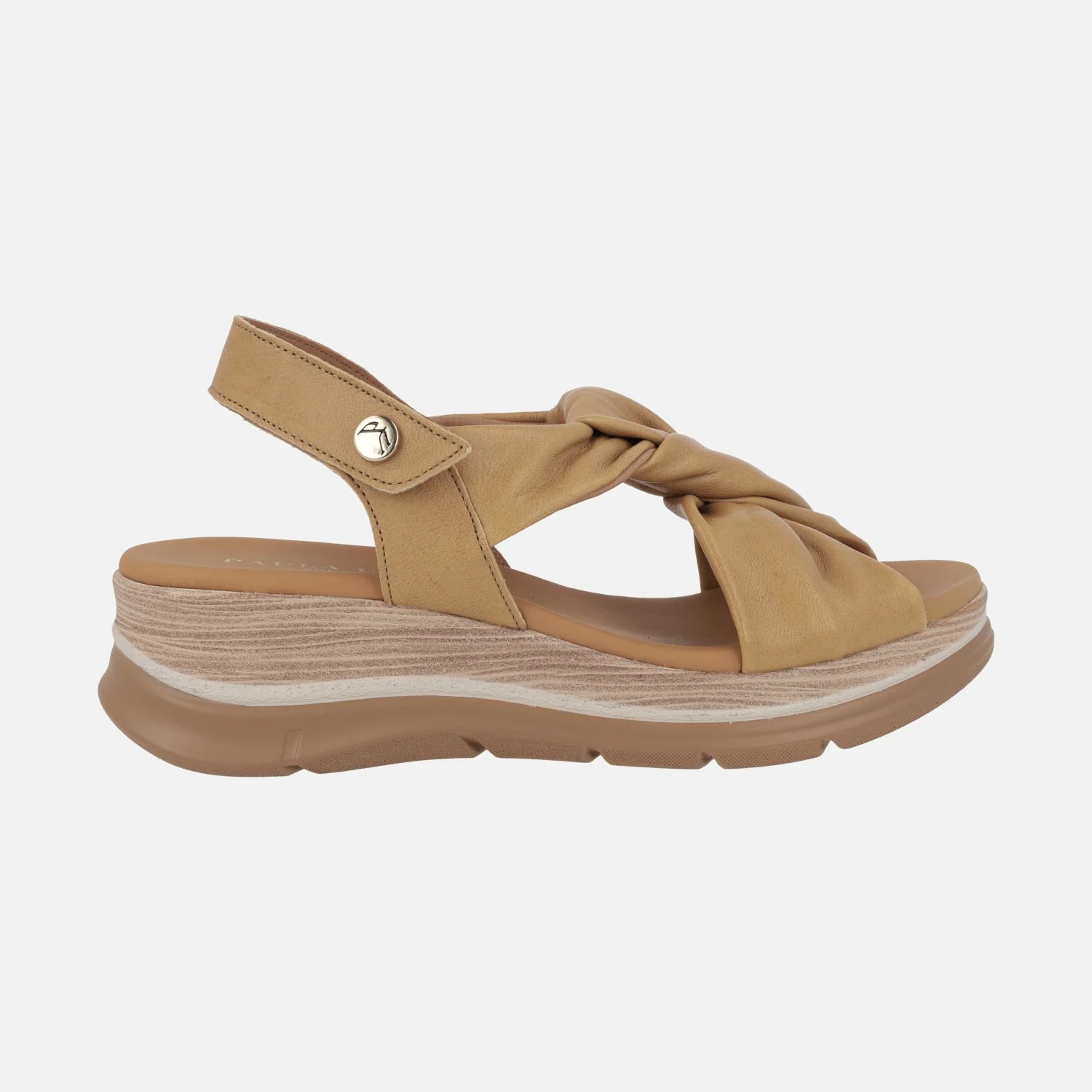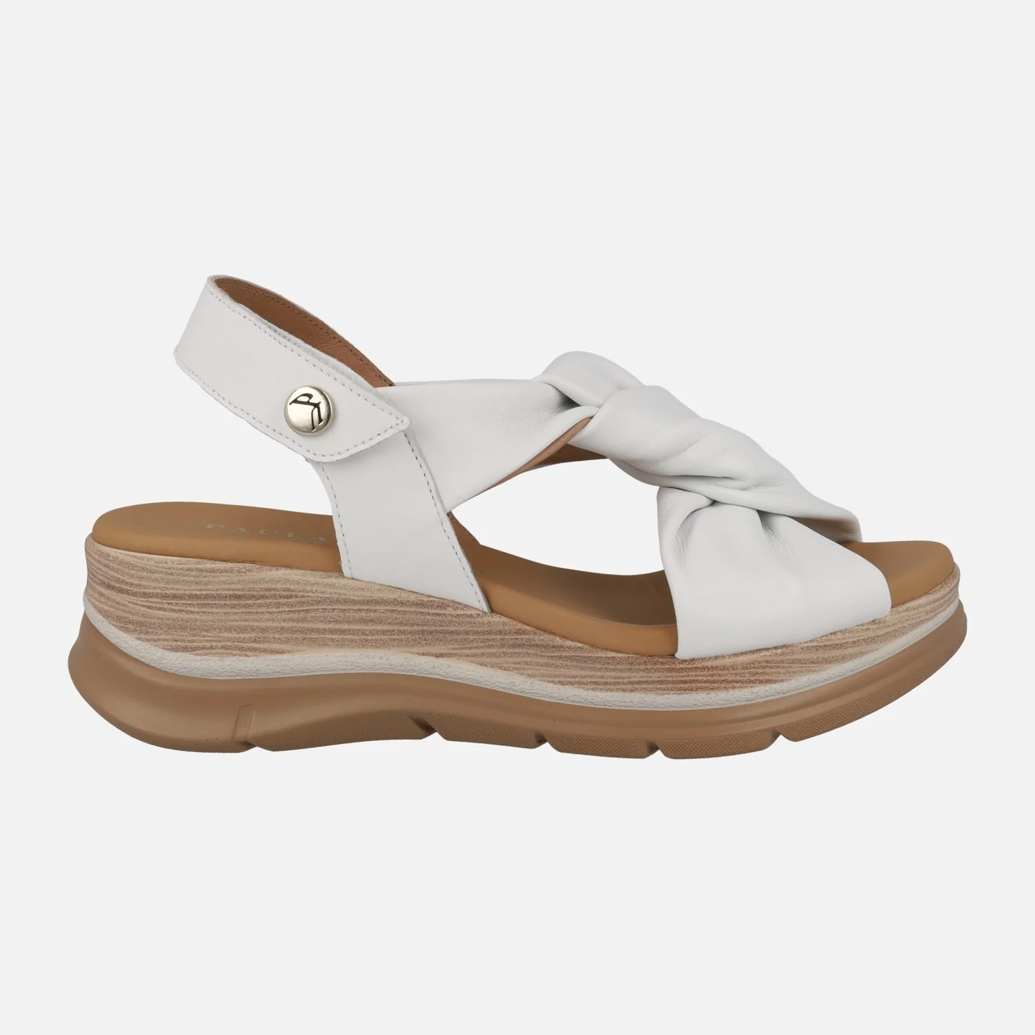 Sandalias de piel para mujer de la marca Paula Urban modelo 24-335 disponibles en Sunset blanco, azul o cuero. Cómodas sandalias de piel, con tiras entrelazadas haciendo un nudo. Tira al talón con cierre de velcro. Forro y planta de piel. Piso ligero que imita madera, con una altura trasera de 5 cms (3 cms en la parte delantera). Paula Urban, made in SPain.