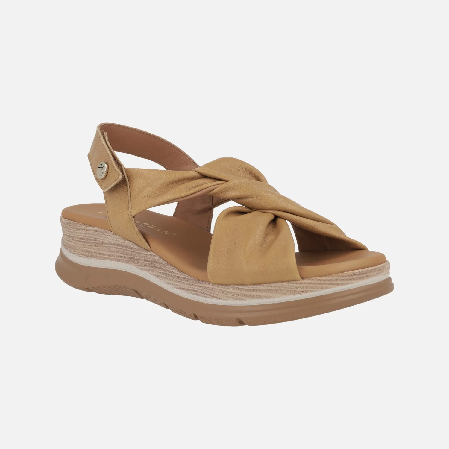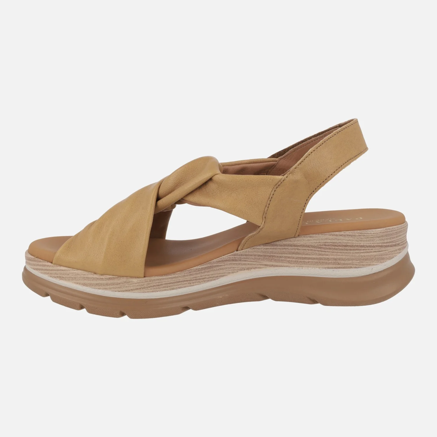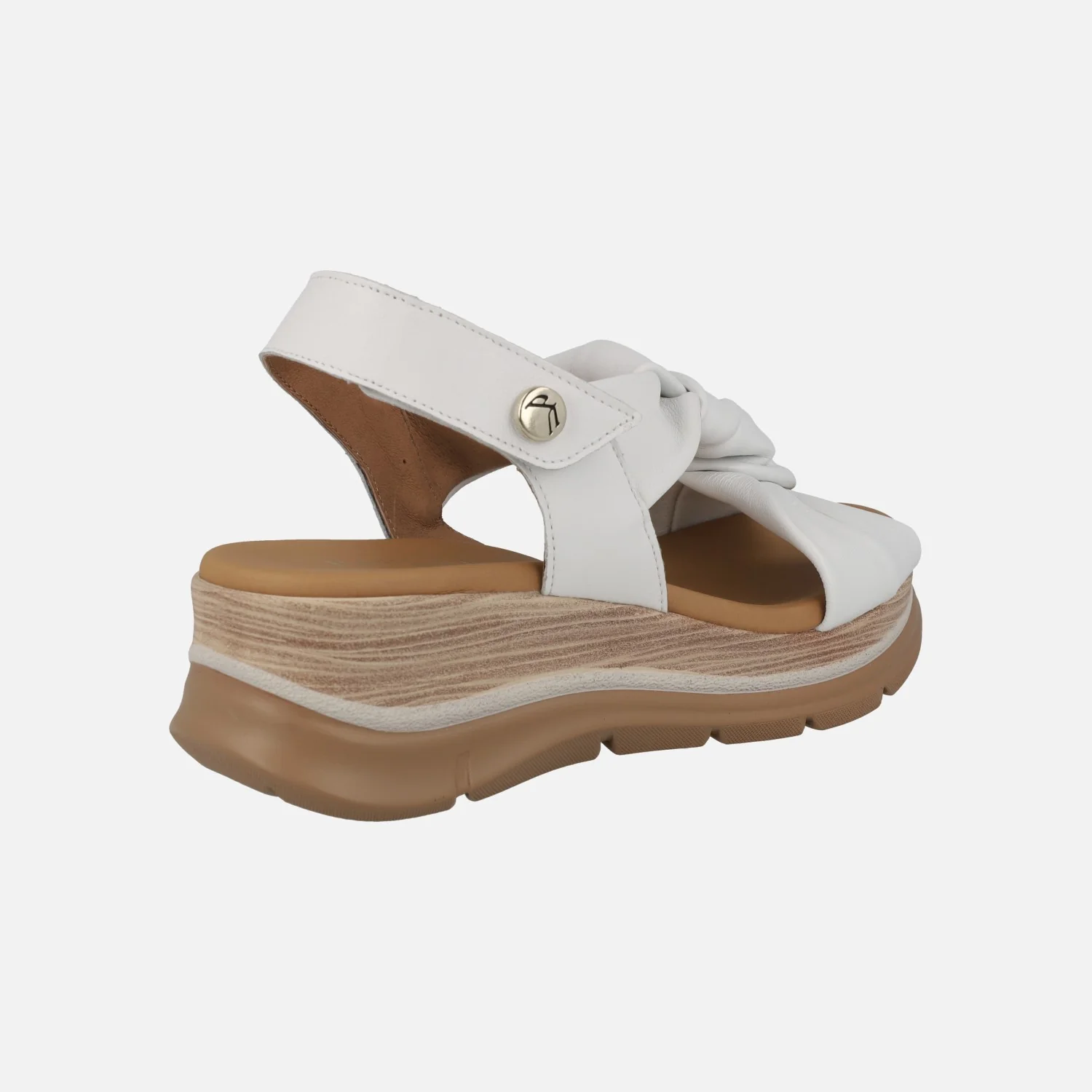 Sandalias de piel para mujer de la marca Paula Urban modelo 24-335 disponibles en Sunset blanco, azul o cuero. Cómodas sandalias de piel, con tiras entrelazadas haciendo un nudo. Tira al talón con cierre de velcro. Forro y planta de piel. Piso ligero que imita madera, con una altura trasera de 5 cms (3 cms en la parte delantera). Paula Urban, made in SPain.