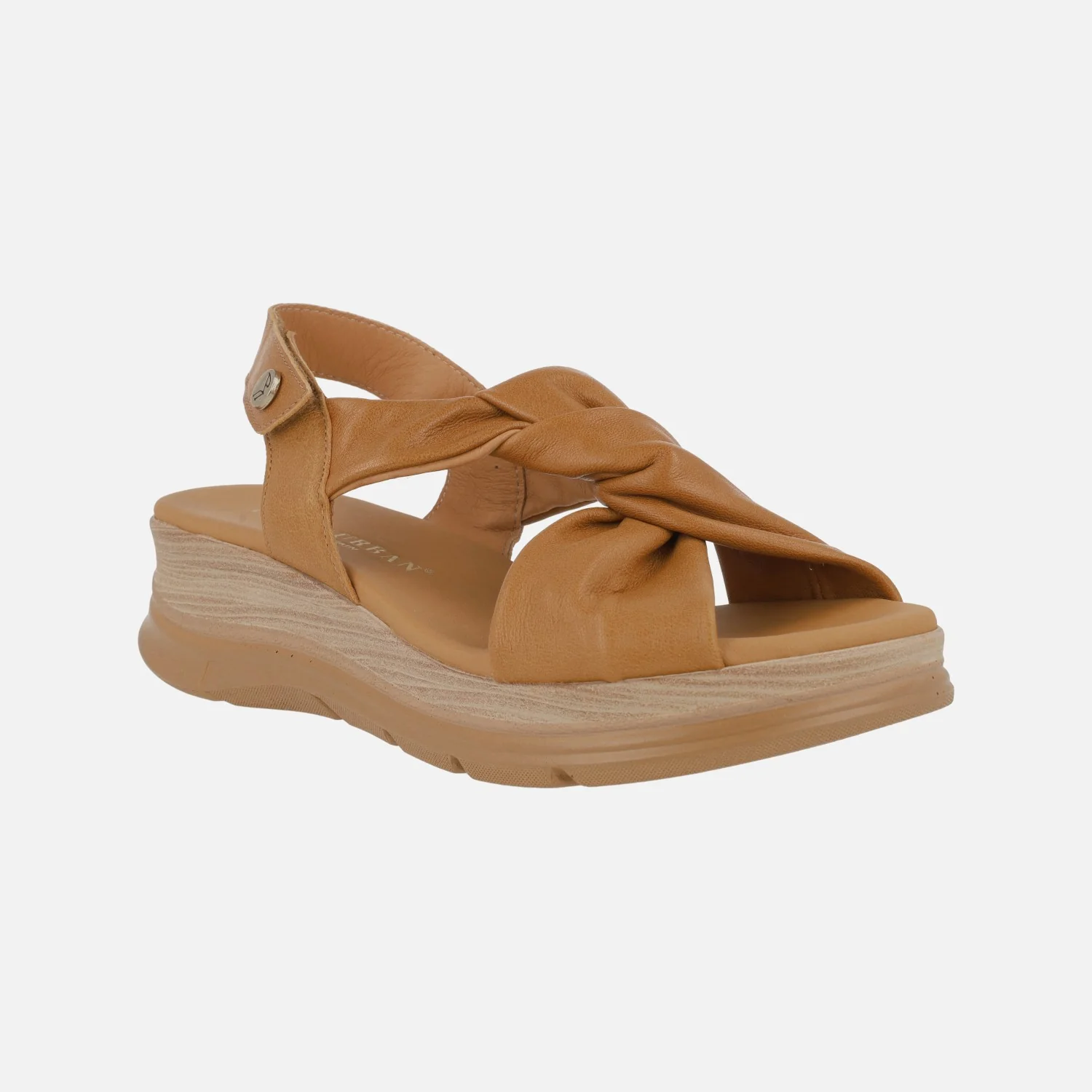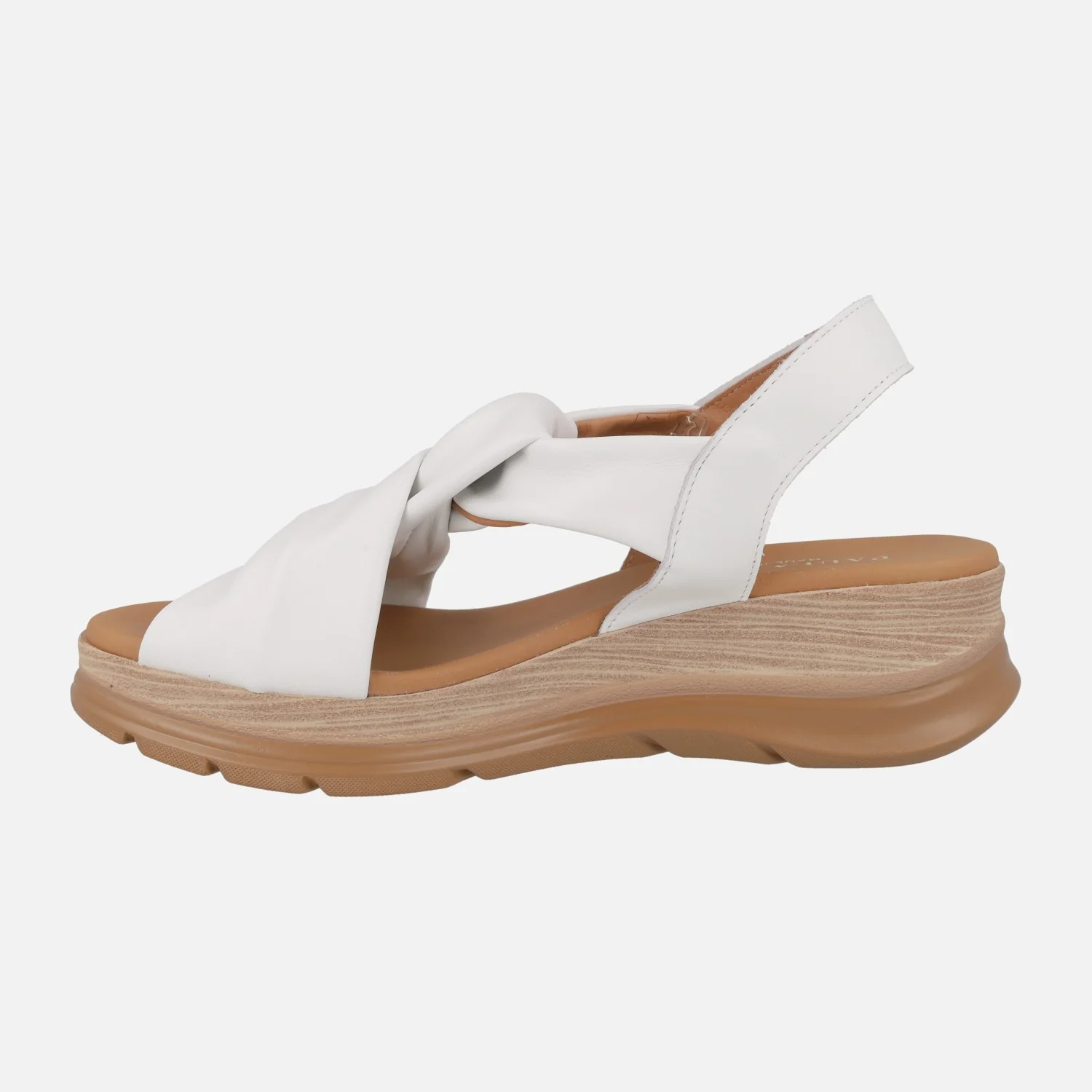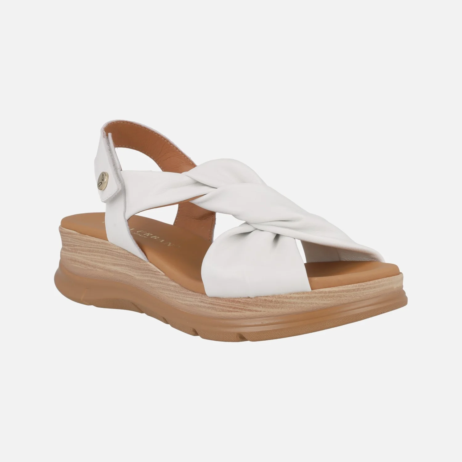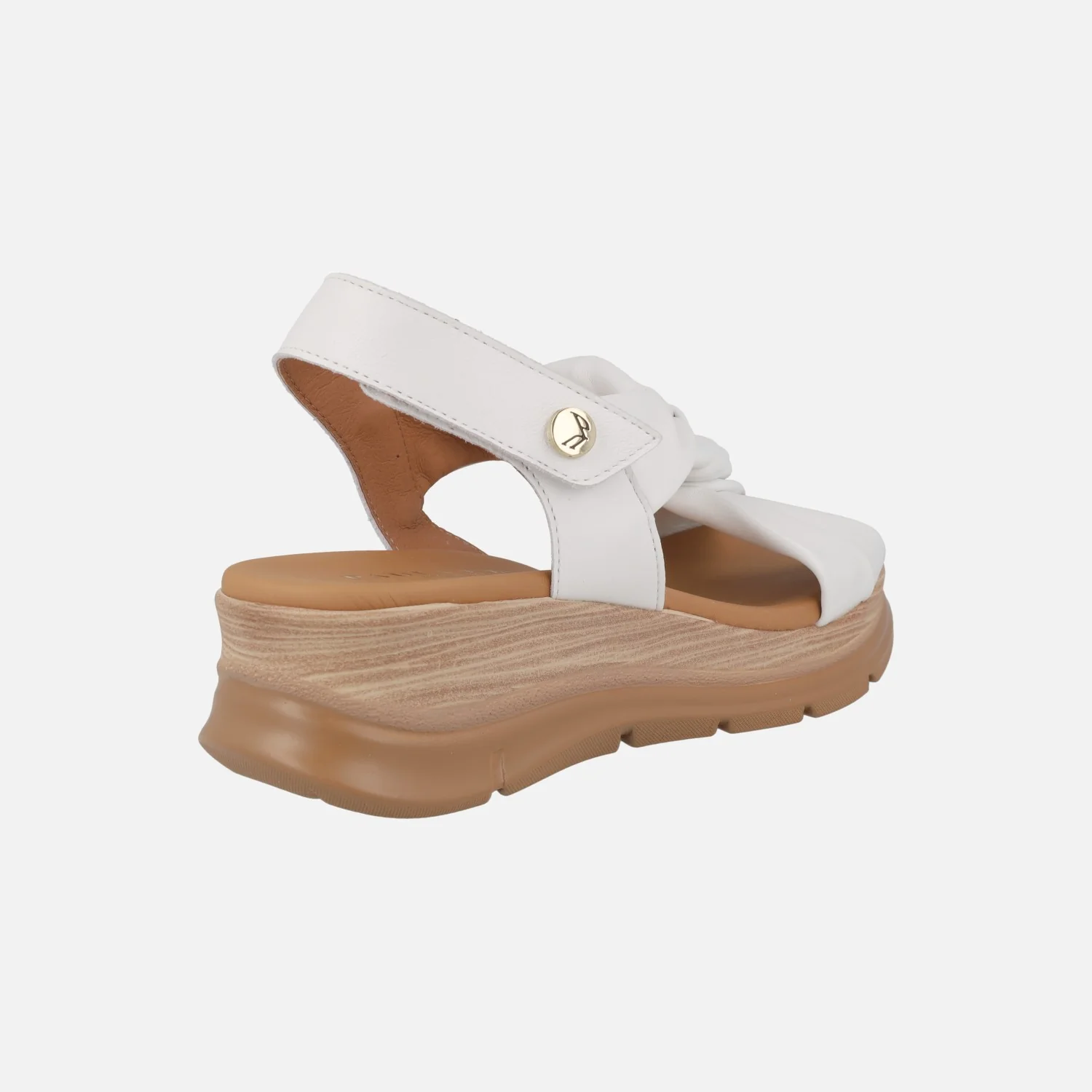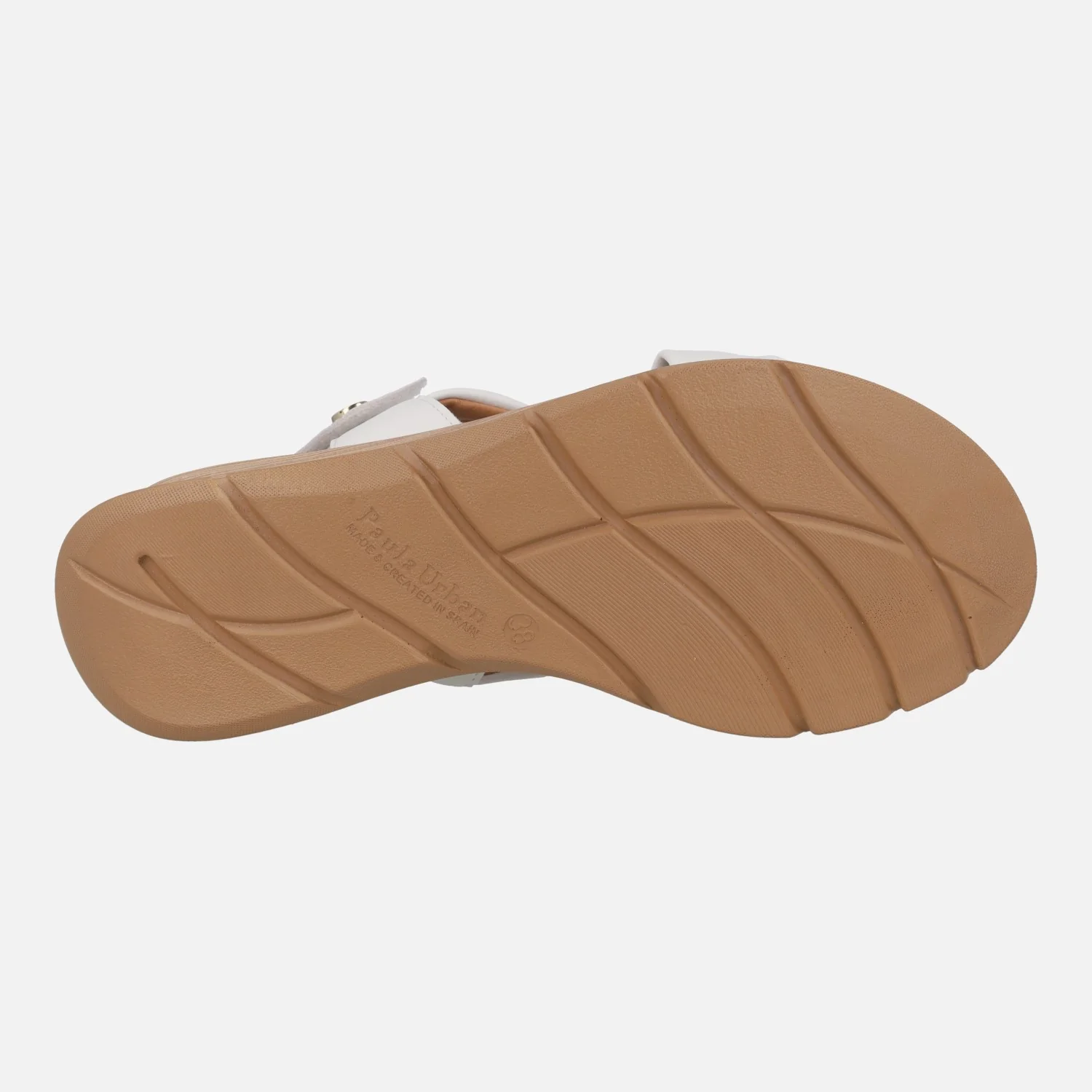 Sandalias para mujer de la marca Paula Urban, modelo 24-335 disponibles en blanco y en camel. Sandalias de piel con tiras entrelazadas en la parte delantera haciendo nudo. Tira al talón con cierre de velcro. Forro y planta de piel. Piso sintético, de 5 cms de altura trasera (3 cms parte delantera). Made in Spain.