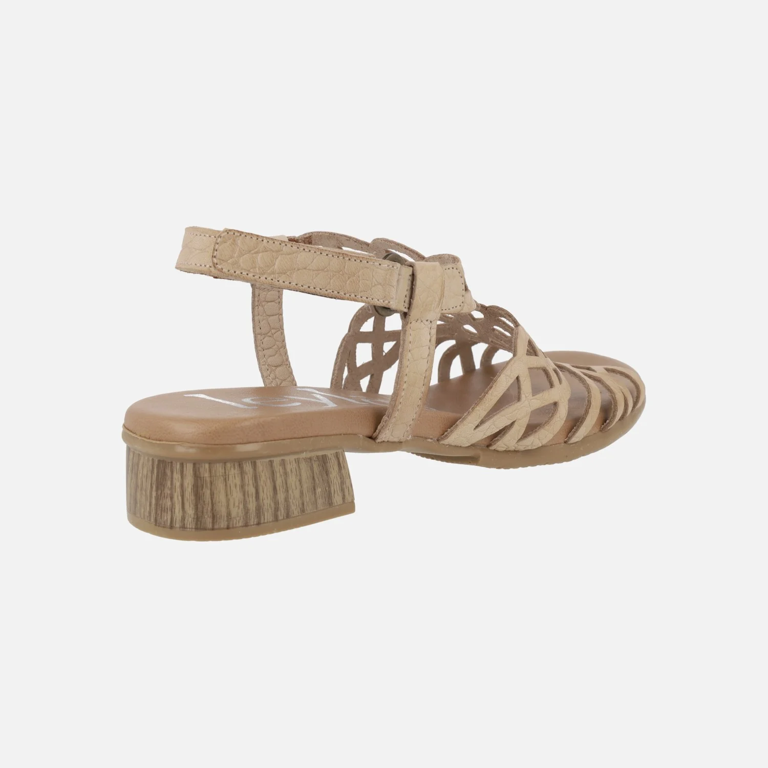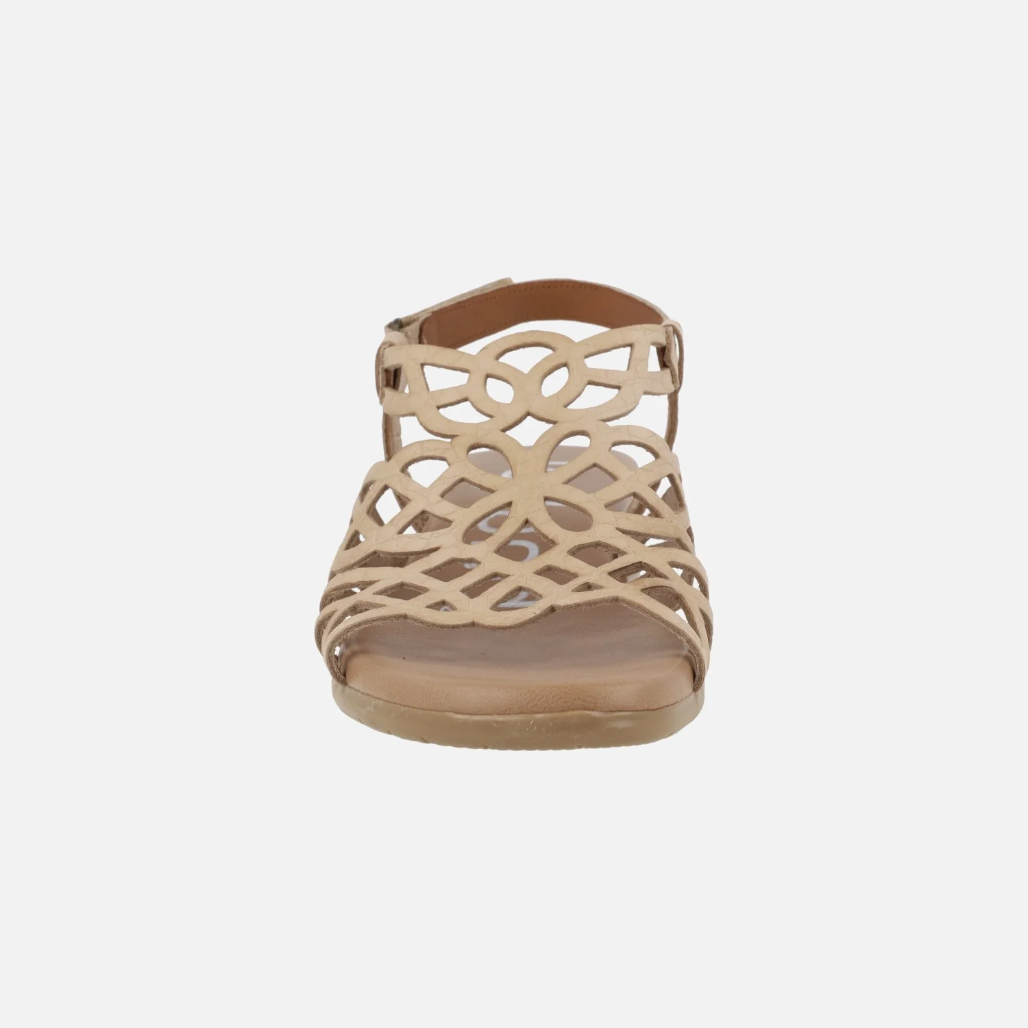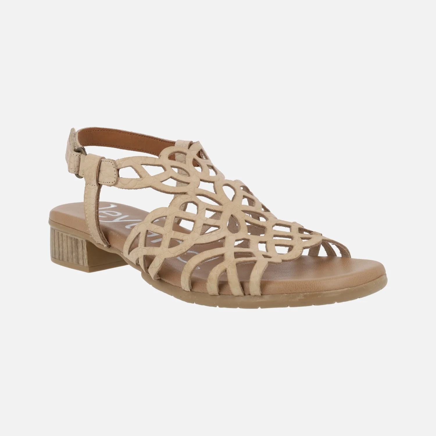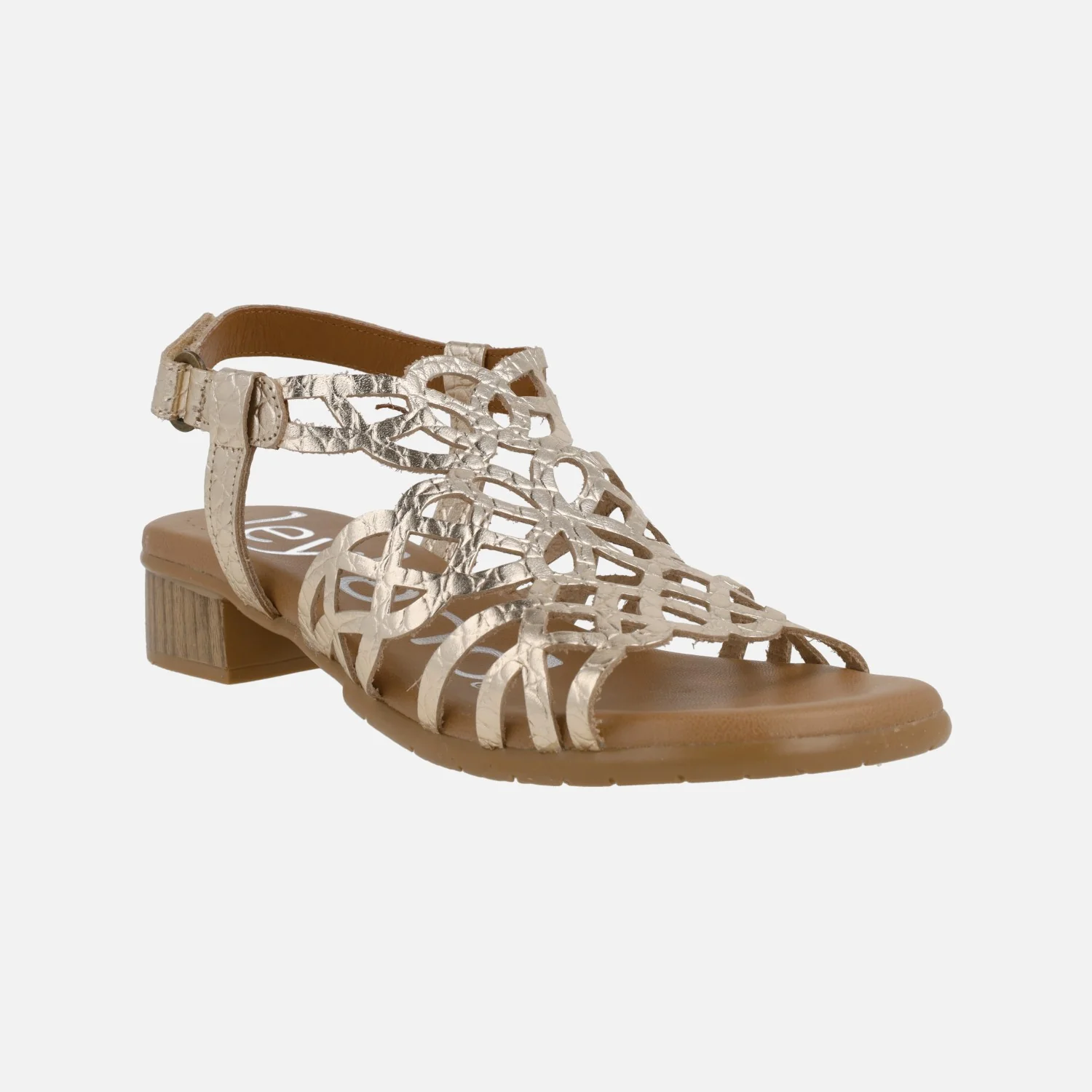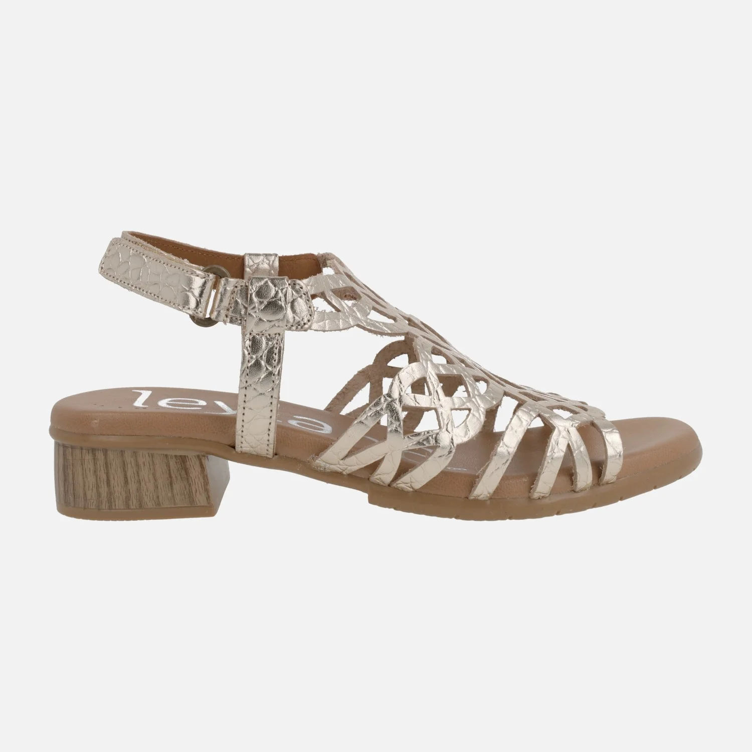 Sandalias de piel troqueladas de la marca Suave by Leyland, modelo 5609, disponibles en piel metalizada champagne o en piel grabada beige. Sandalias con cierre de velcro al talón, para mayor comodidad. Interiores forrados de piel y otros materiales. Suela sintética, con tacones bajos, de 3,5 cms de altura.