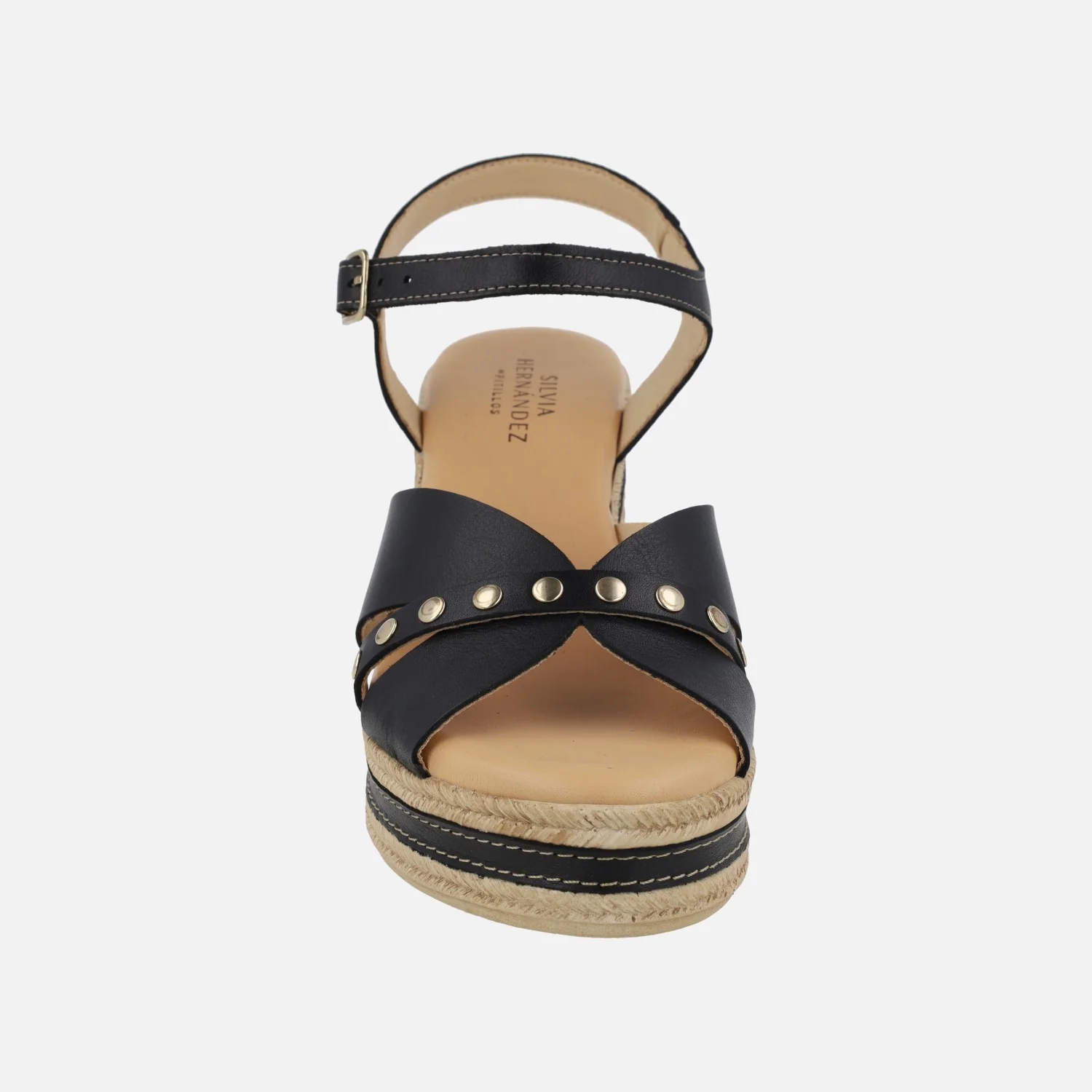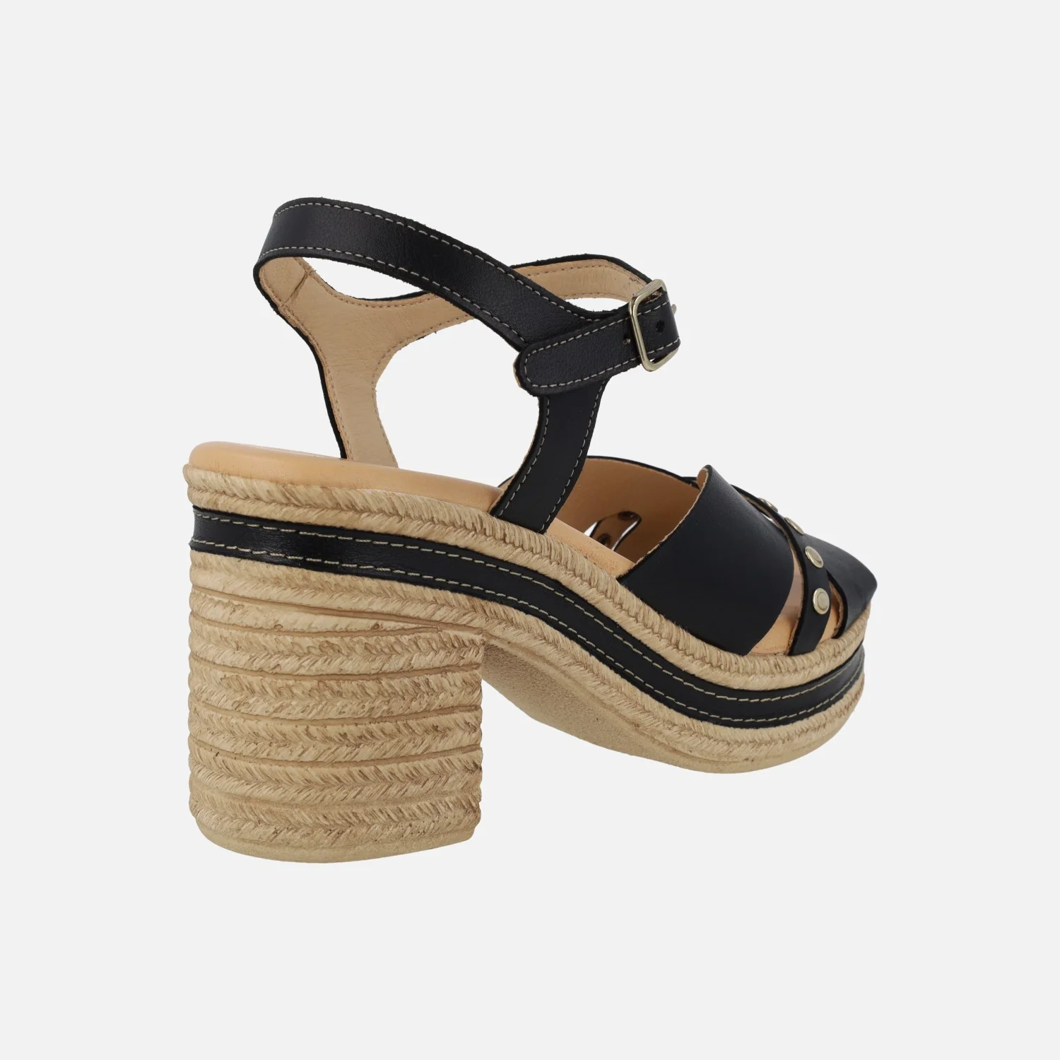 Elegantes sandalias de la marca Pitillos, línea Silvia Hernandez, modelo 30213, disponibles en negro y en cuero. Sandalias de piel con detalle de tachas metálicas doradas. Cierre de pulsera al tobillo con hebilla ajustable. Interior mixto en materiales textiles con planta de piel. Piso sintético imitando rafia, con 8 cm de altura de tacón y 3 cm de plataforma delantera.