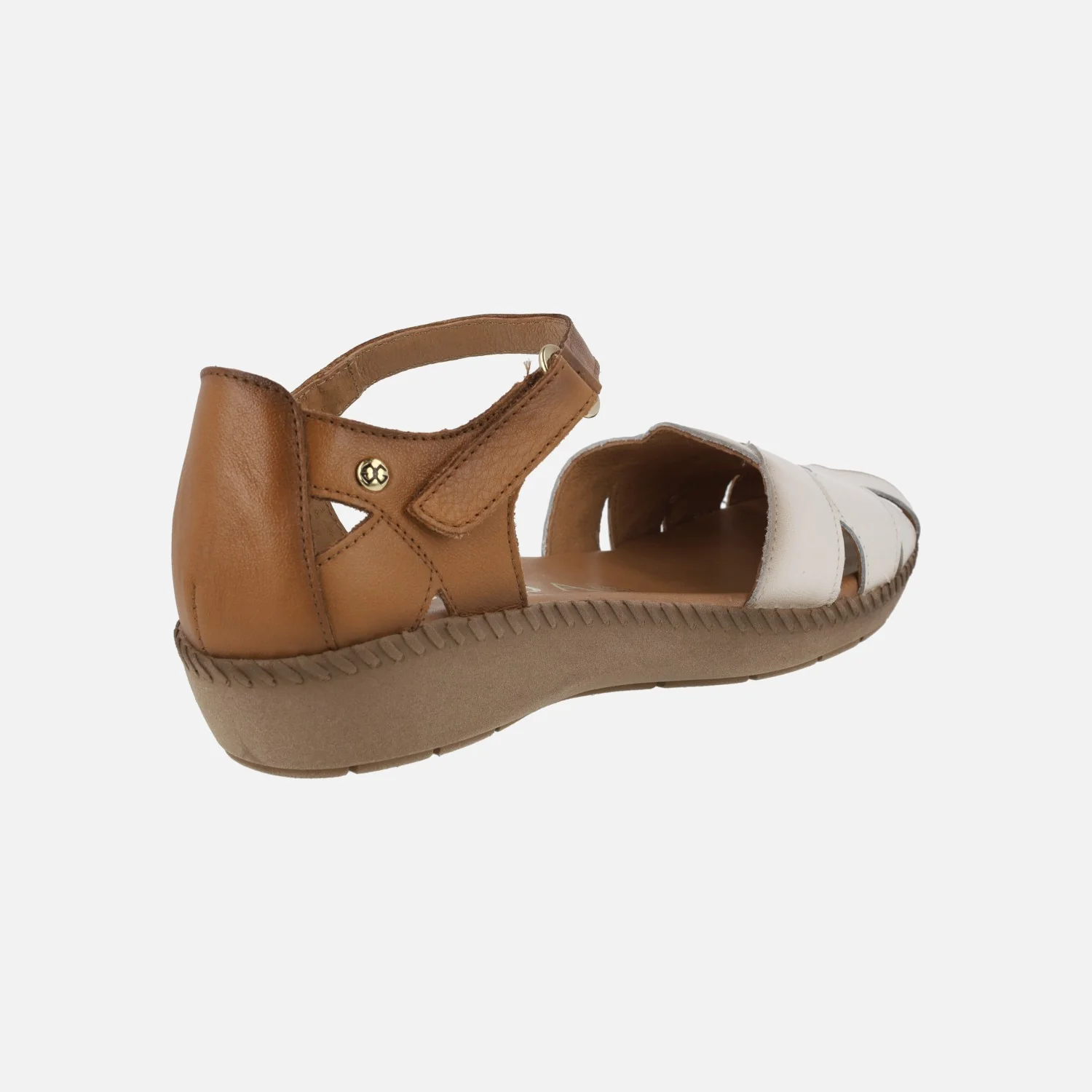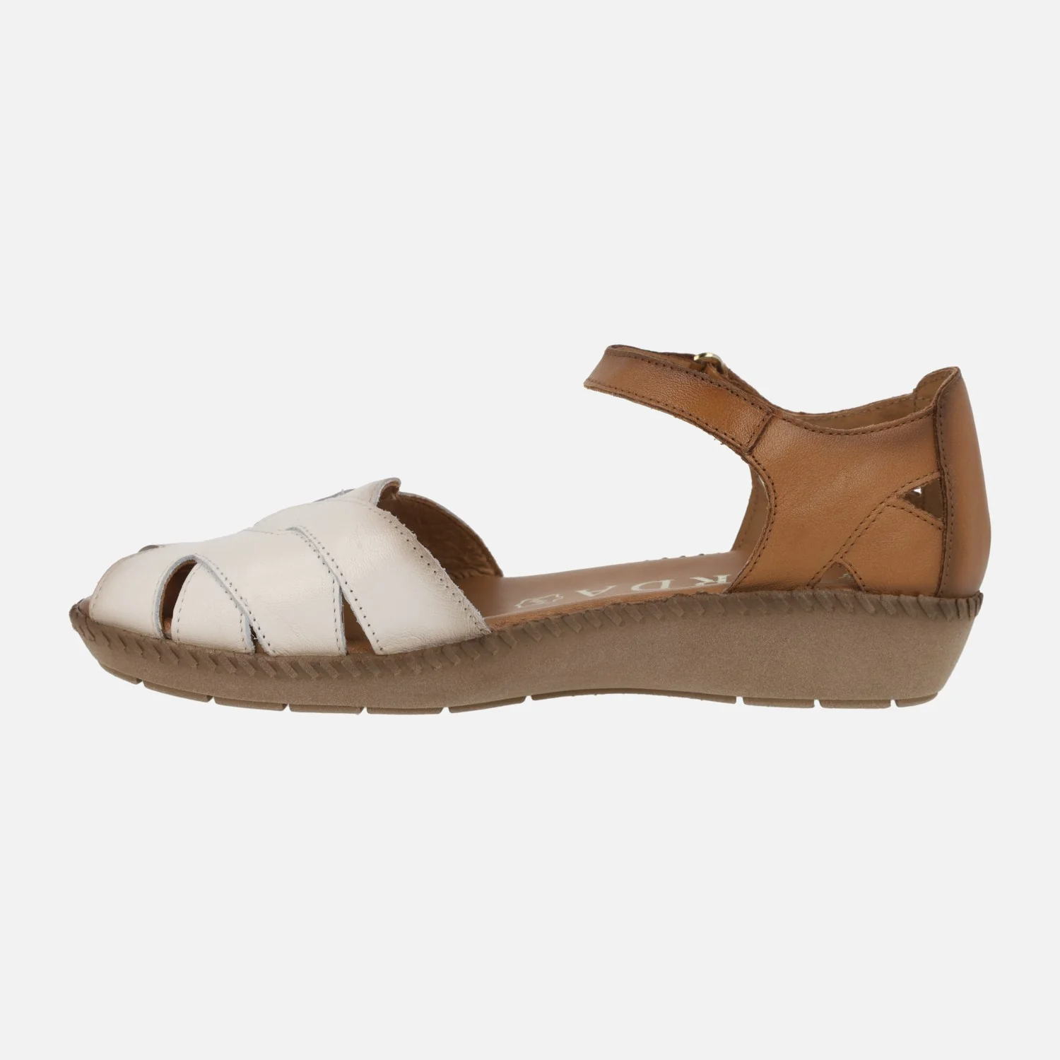 Sandalias de piel para mujer de la marca Giorda, modelo ZA28111 Hielo/cuero. Sandalias cerradas de talón, elaboradas en piel con puntera en hielo y talonera en cuero. Puntera abierta. Cierre de tira con velcro al tobillo. Planta de piel acolchada. Forro de piel. Piso de goma de 3 cms de altura en la parte trasera (2 cms en la parte delantera).